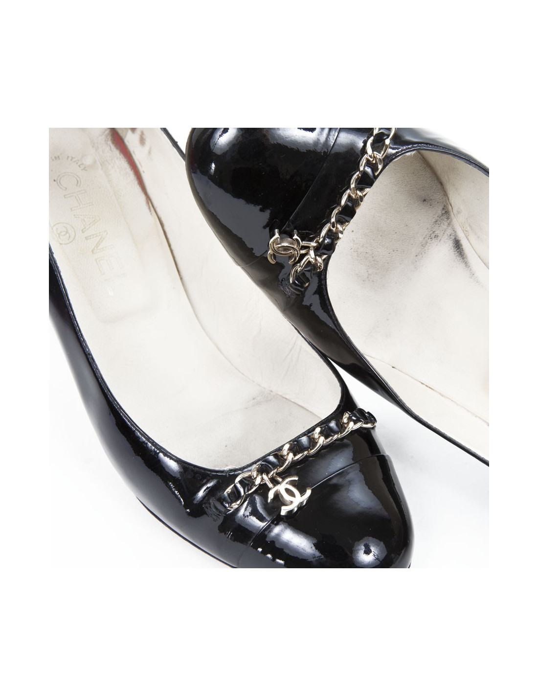 Escarpins Chanel taille 39,5 en cuir verni noir, à l'avant de la chaussure se trouve une chaîne doré avec une breloque représentant le signe Chanel "CC".