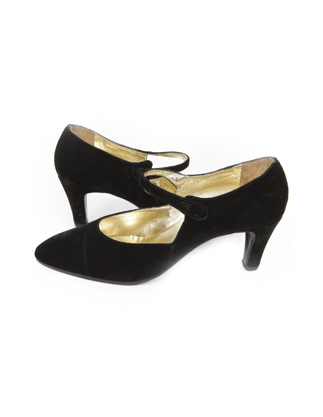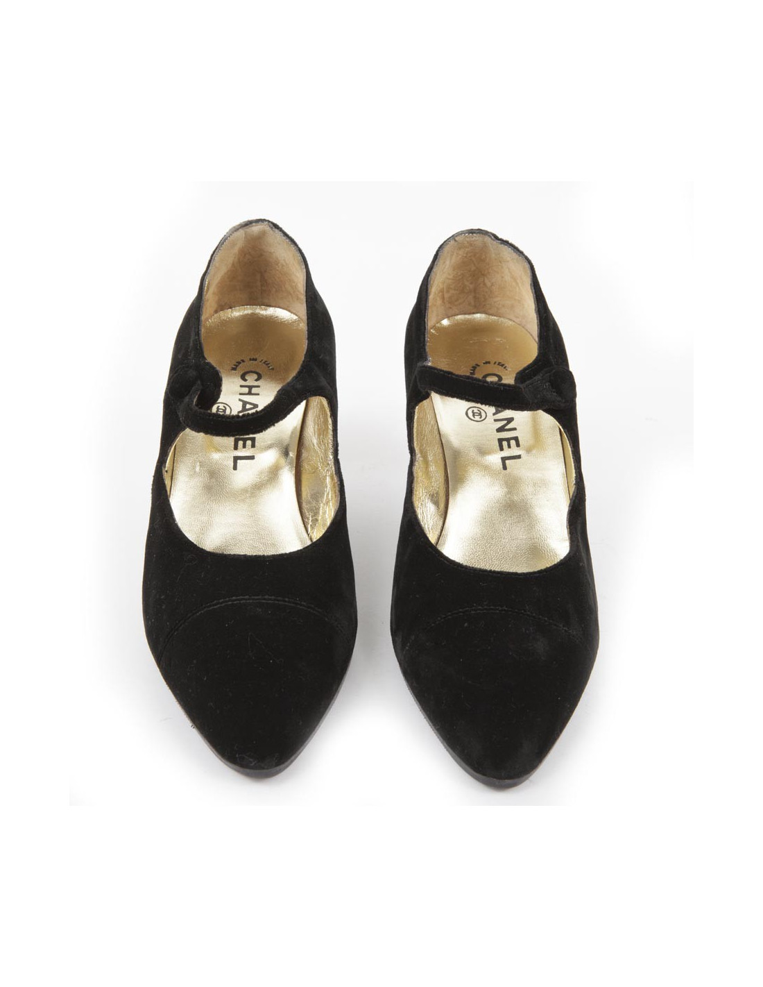 Escarpins Couture Chanel en velours de soie noir T 38 FR, ils s'attachent à l'aide d'une lanière qui se boutonne à la cheville.