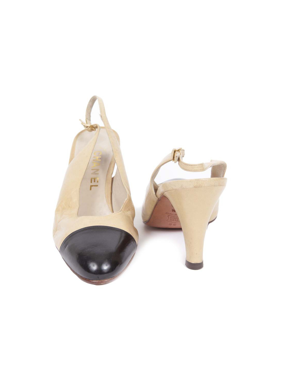 Classiques escarpins Chanel bicolores en cuir d'agneau beige et noir T 39 FR, ils sont ouverts à l'arrière et se ferment à l'aide d'un fermoir en métal doré où est inscrit "Chanel" en laiton doré.
