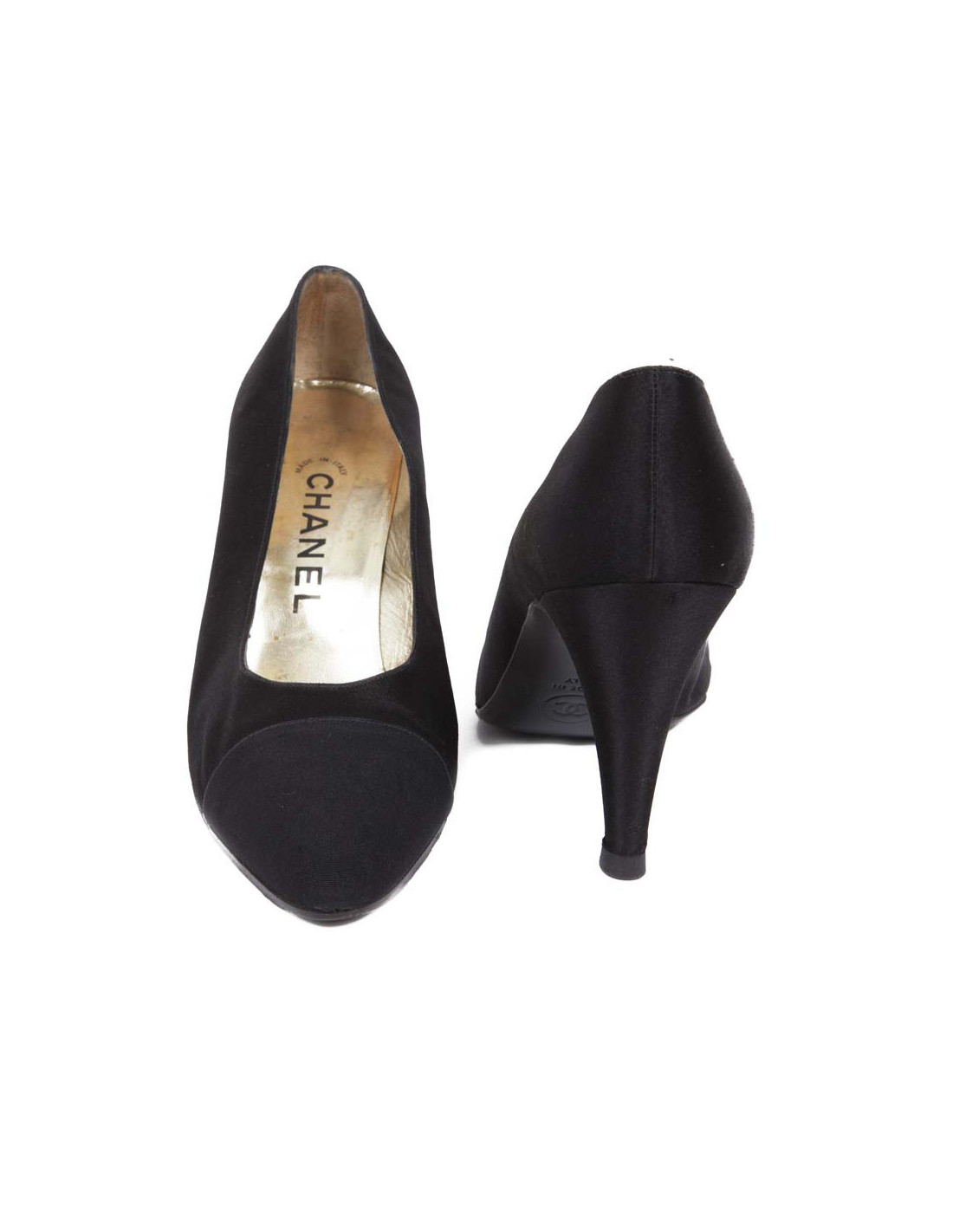 Escarpins Couture Chanel en satin duchesse noir T 40 FR, et bout en piqué noir.