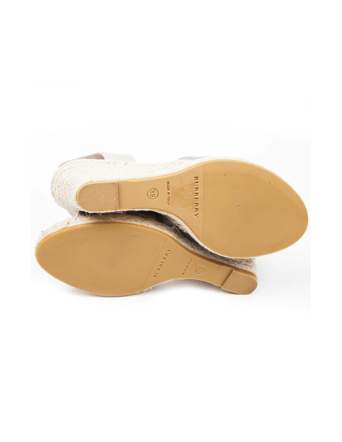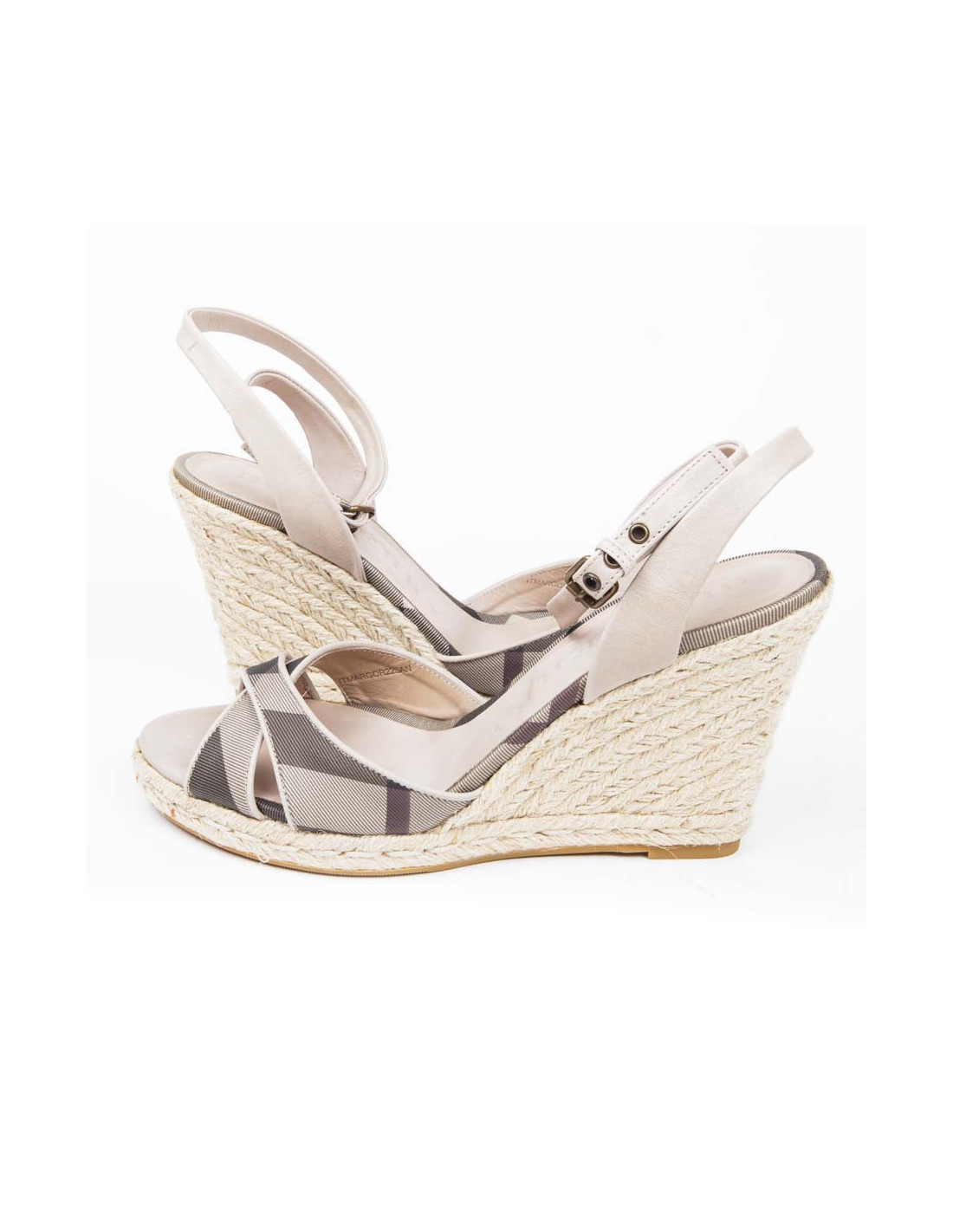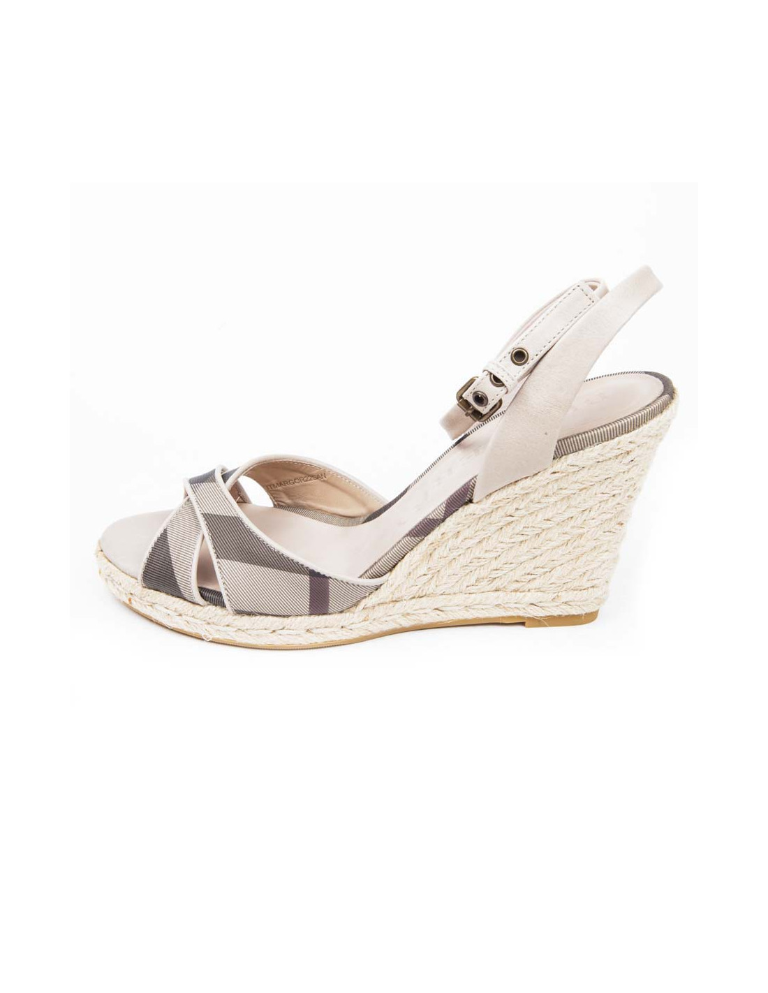 Sandales ouvertes de la Maison Burberry motifs tartan marron et étoupe. Taille 39. Semelle et lanières en cuir étoupe.