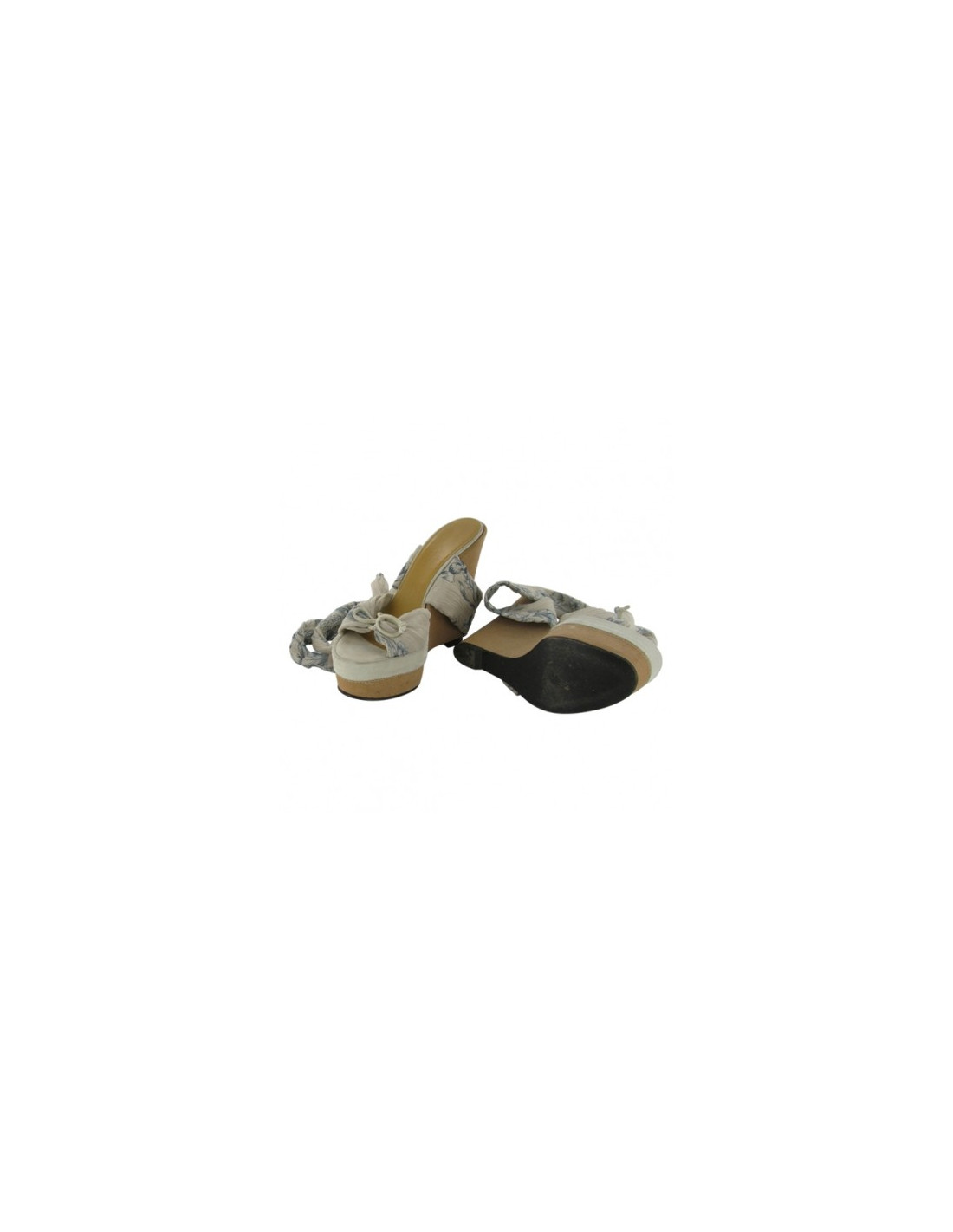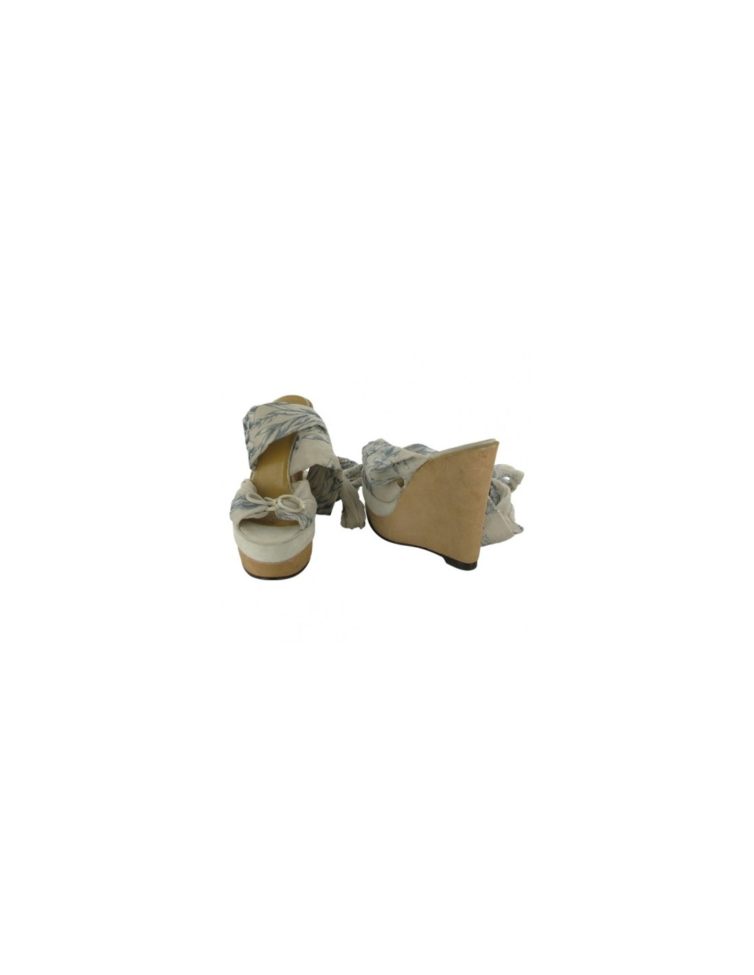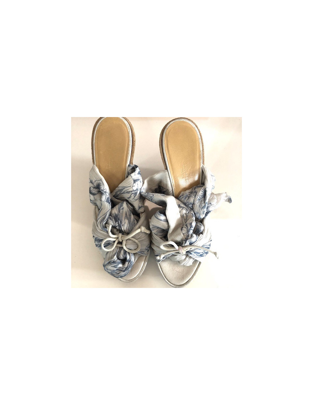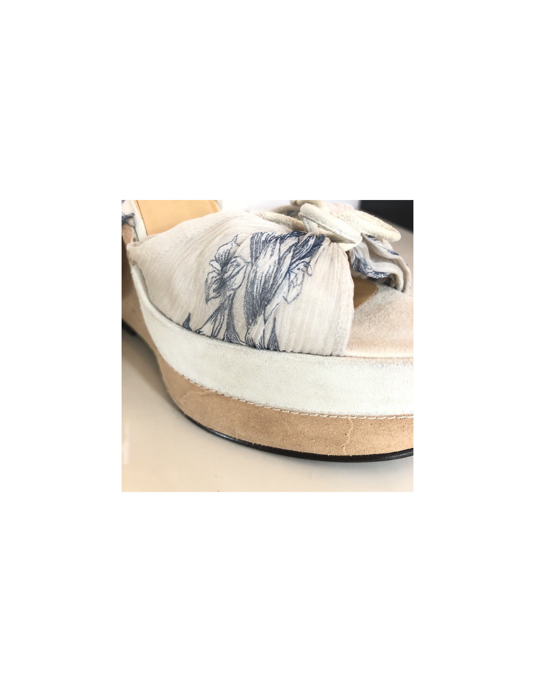 Très belles sandales compensées HERMÈS T35. Le chausson est fait de daim blanc et la semelle compensée est en cuir beige. Elle se noue autour de la cheville. Quelques traces d'usures sur le cuir et le daim sont visibles. Elles sont en très bon état d'usage malgré quelques traces d'usures sur le cuir et le daim.