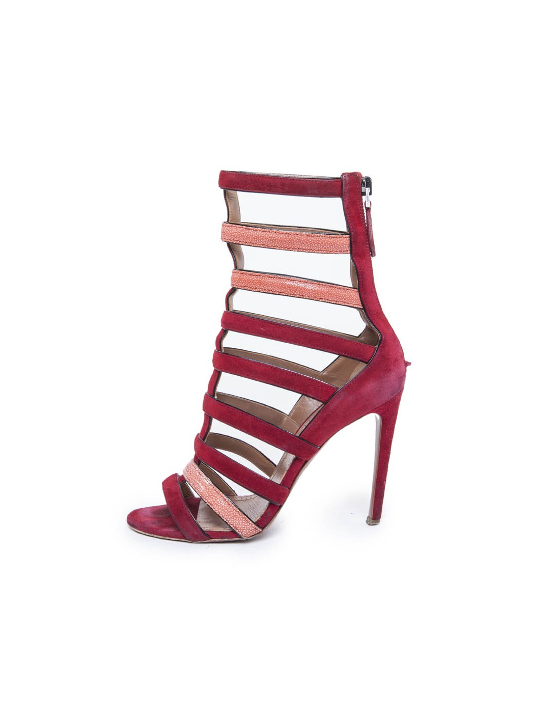 Sandales ALAIA en suède rouge et galuchat corail, fermoir zippé au dos de la chaussure.