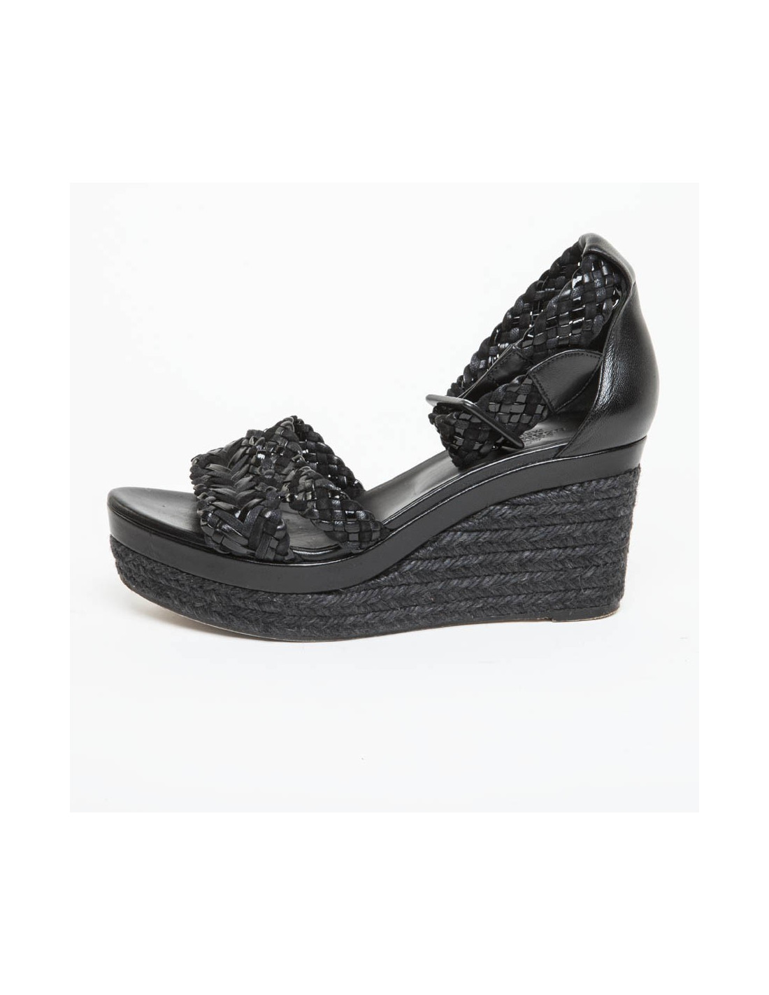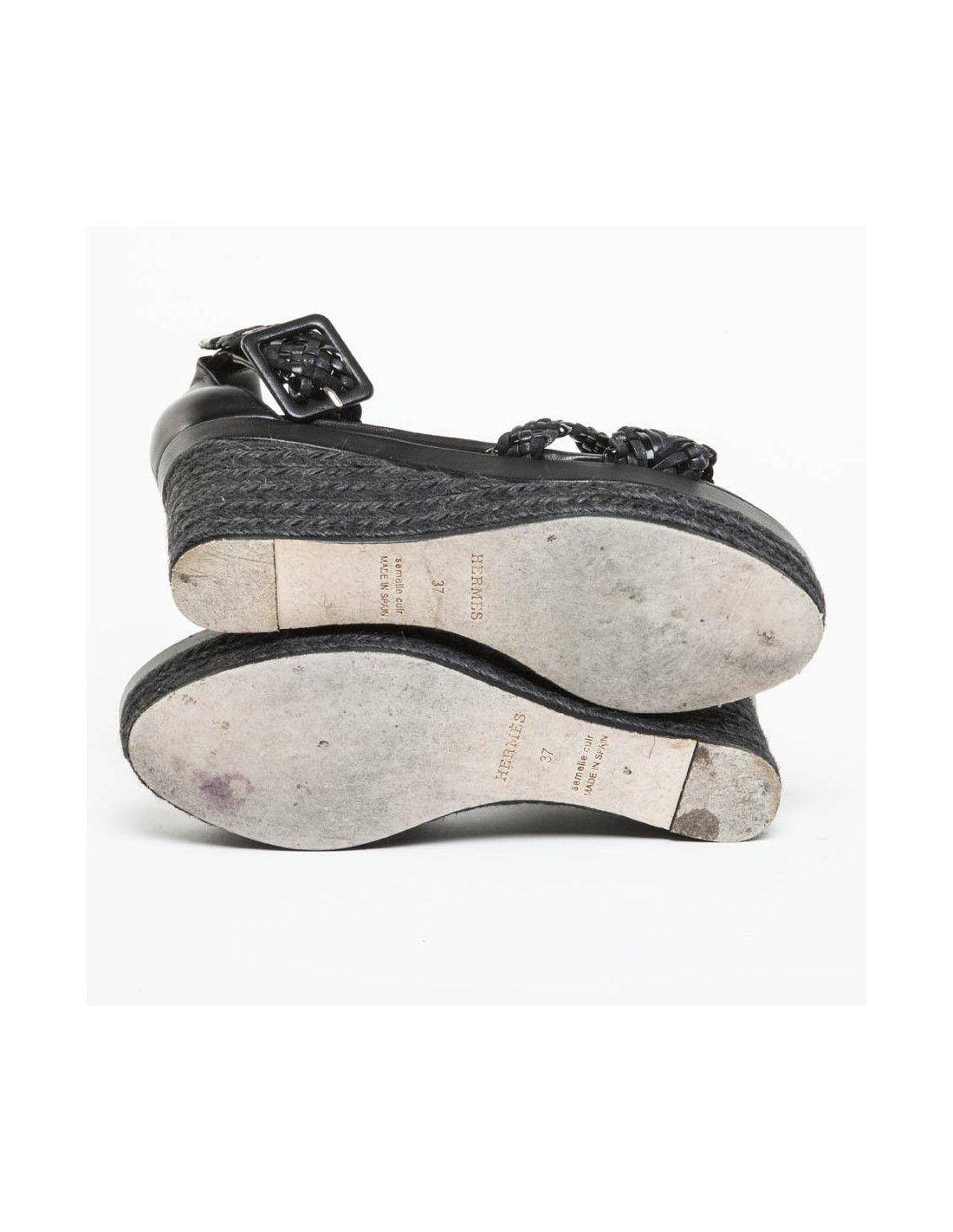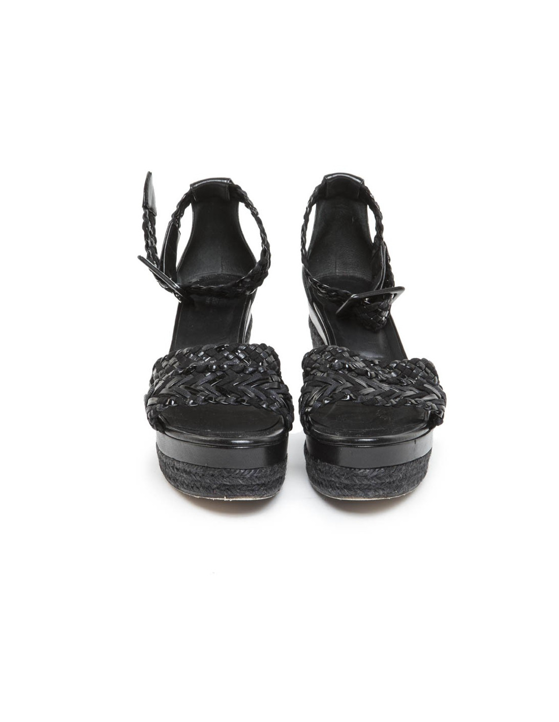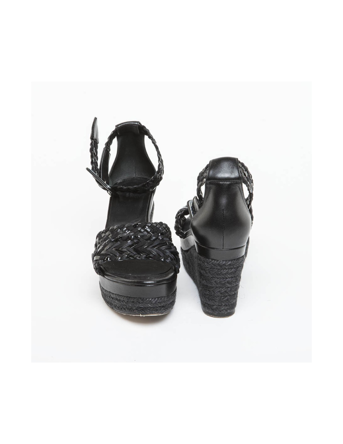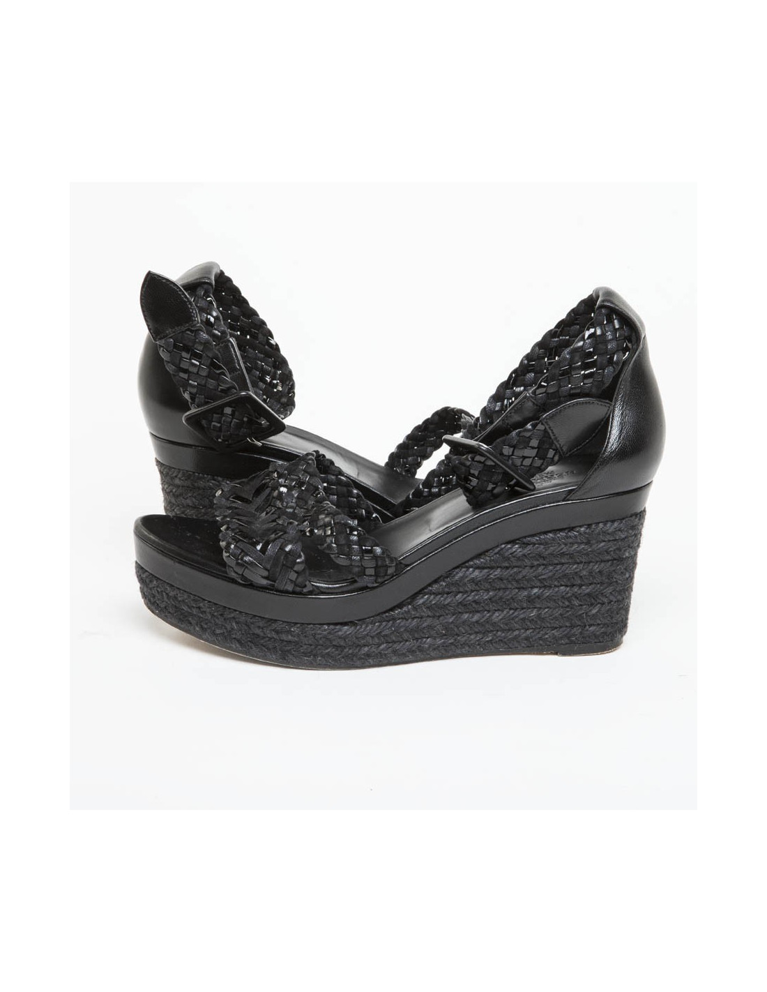 Sandales hautes compensées en cuir tressé noir mat et brillant de la Maison Hermès.