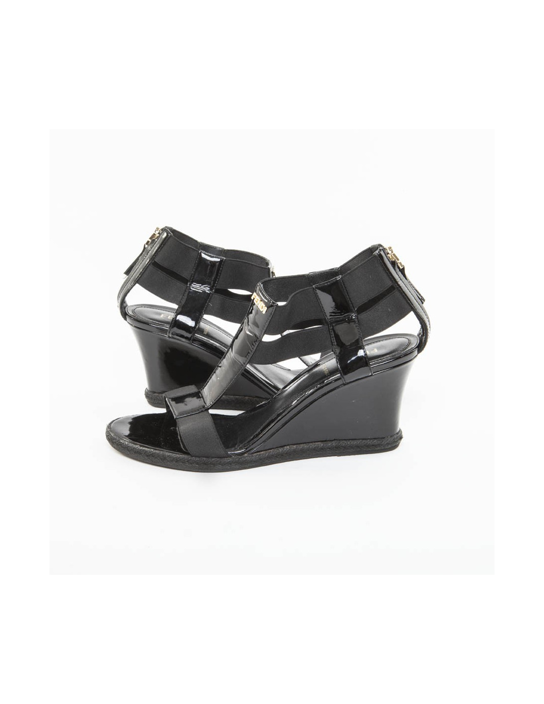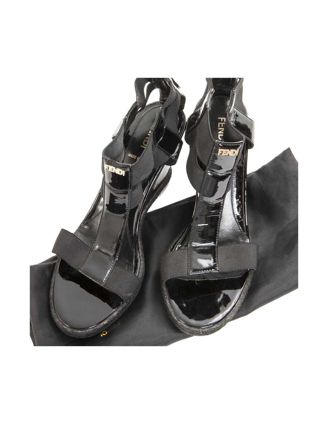 Sandales ouvertes de la Maison Fendi en cuir verni noir. Taille 39 fr . Au niveau des chevilles les attaches sont élastiques. L'inscription 'FENDI' est en métal doré. Fermeture zippée à l'extérieur. En très bon état.