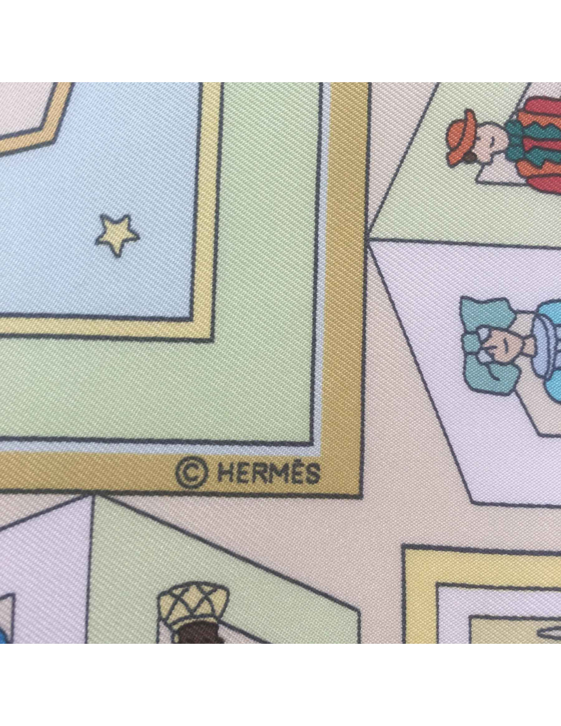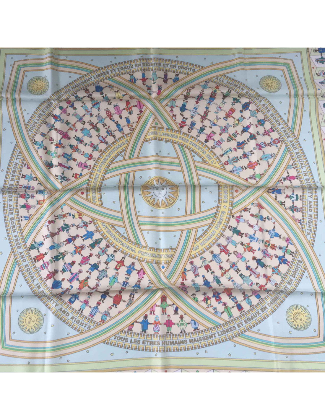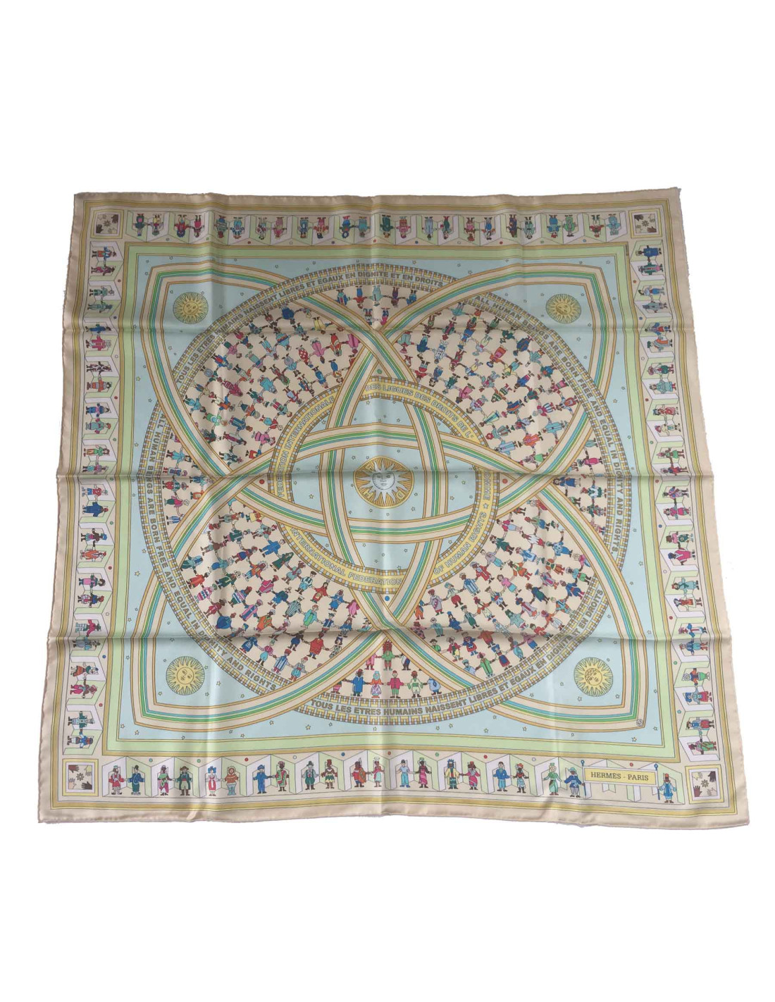 Carré HERMES "Donner la main" édition limitée en soie. Couleurs : vert anis, bleu ciel, jaune, crème.