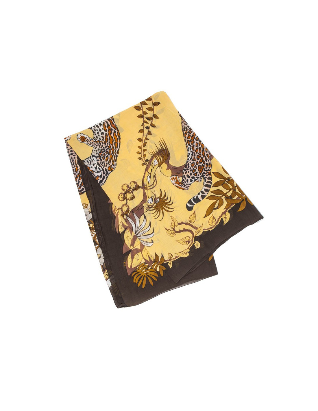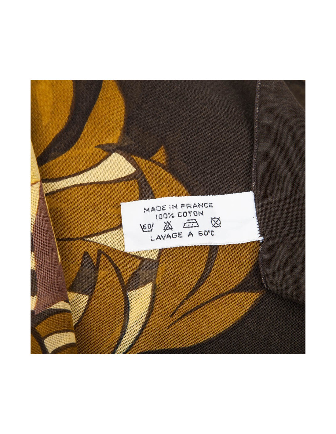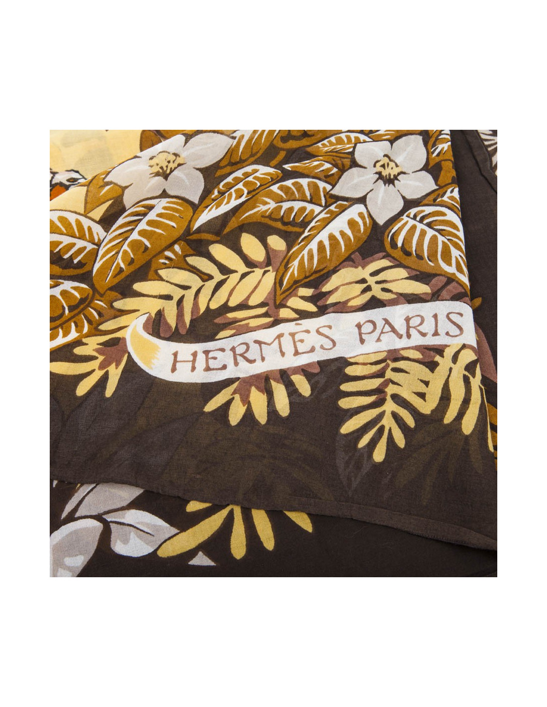 Vintage ! Paréo Hermès en coton imprimé inspiration de la savane. Dans les tons bruns, jaunes et orangés, il a des dessins de léopards et des motifs floraux.