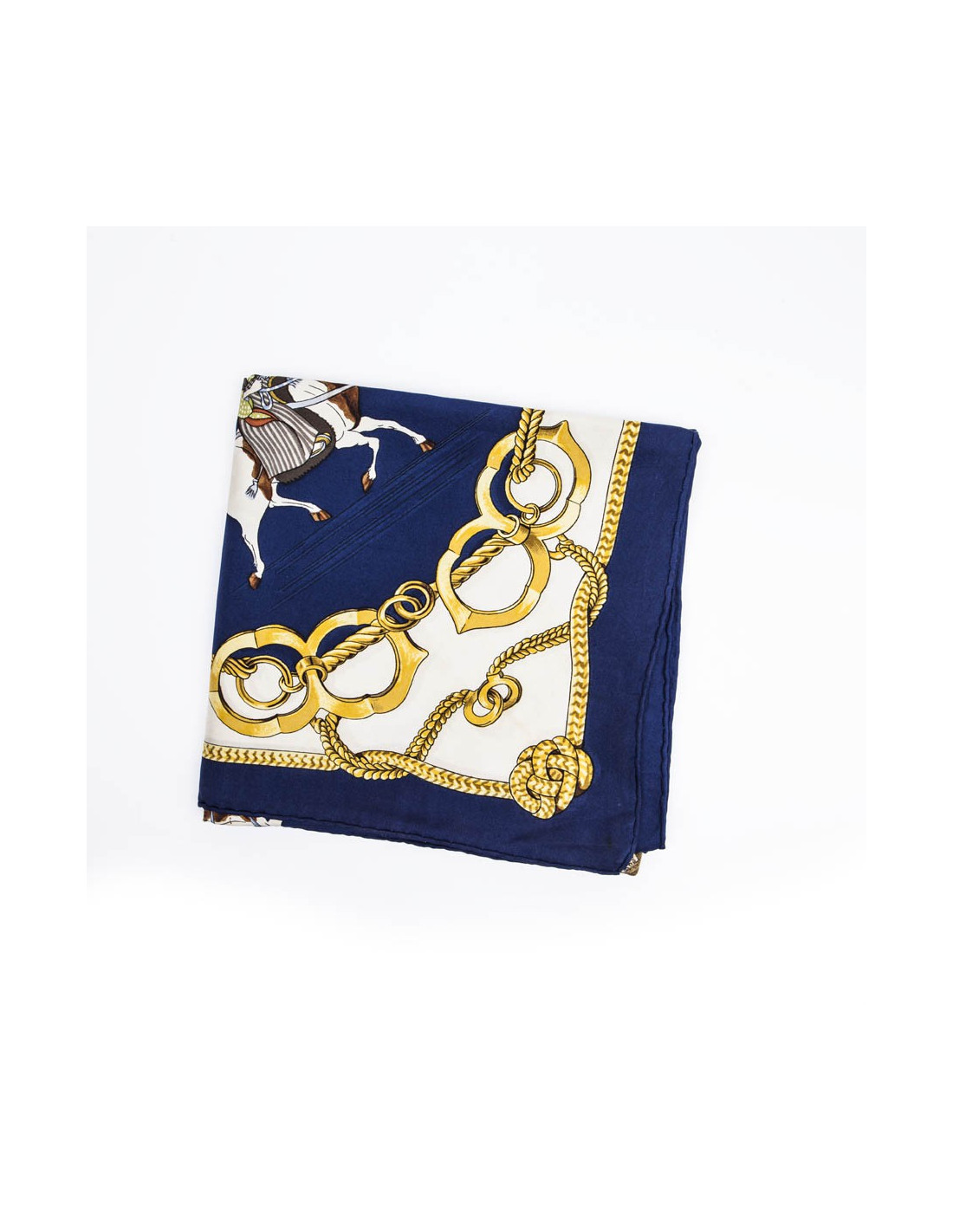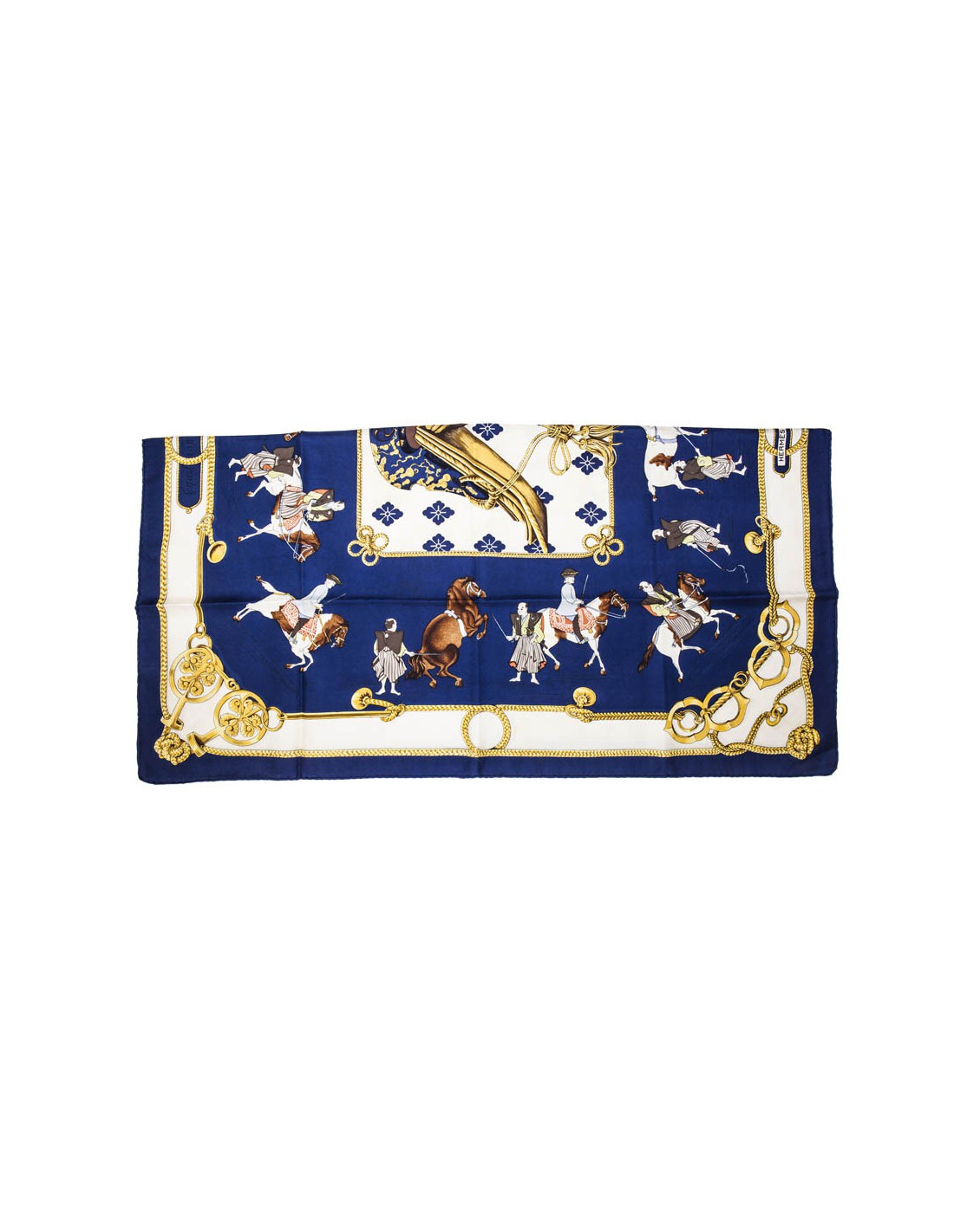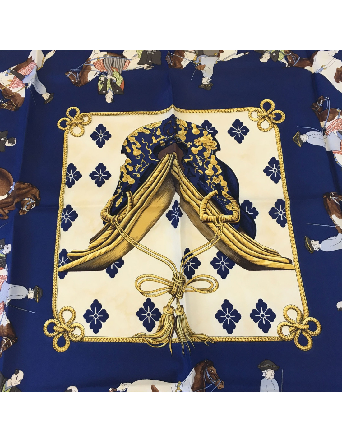 Vintage.Carré foulard HERMES en soie bleu et or imprimé. "Equitation japonaise". Il a des auréoles au centre et au bord, et des petites tâches.