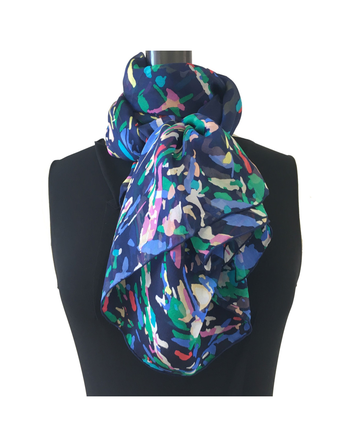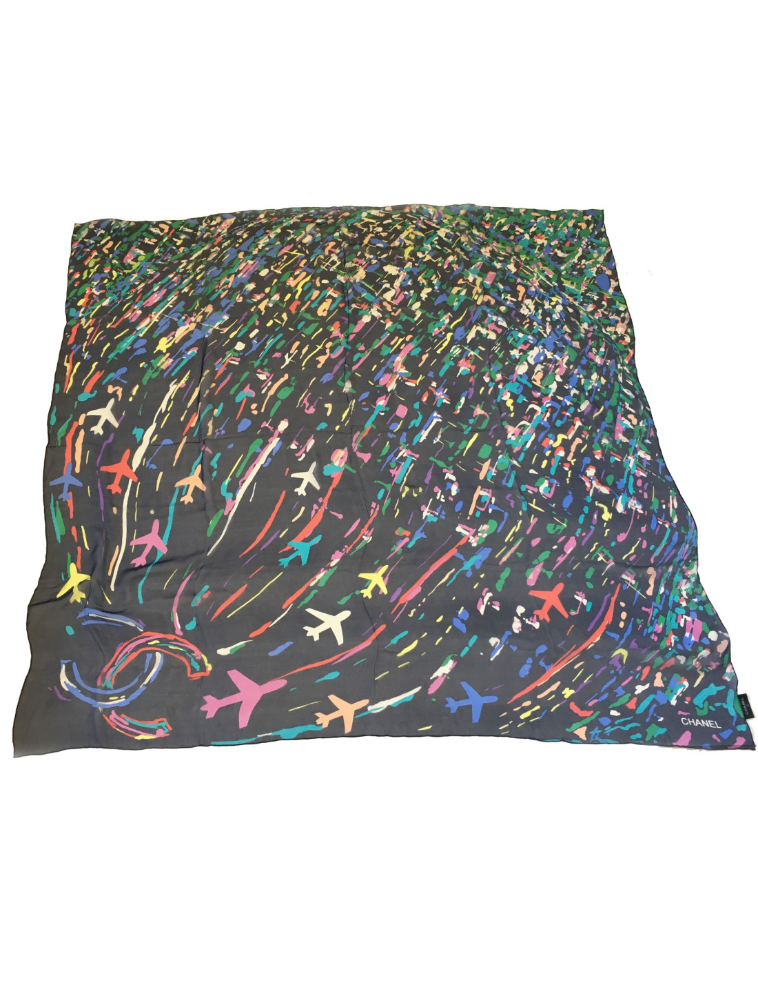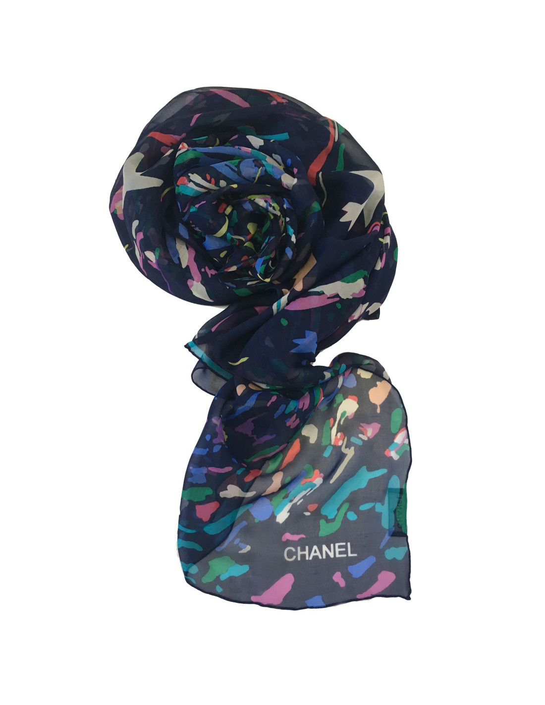 Châle CHANEL en soie bleu marine et fond multicolore