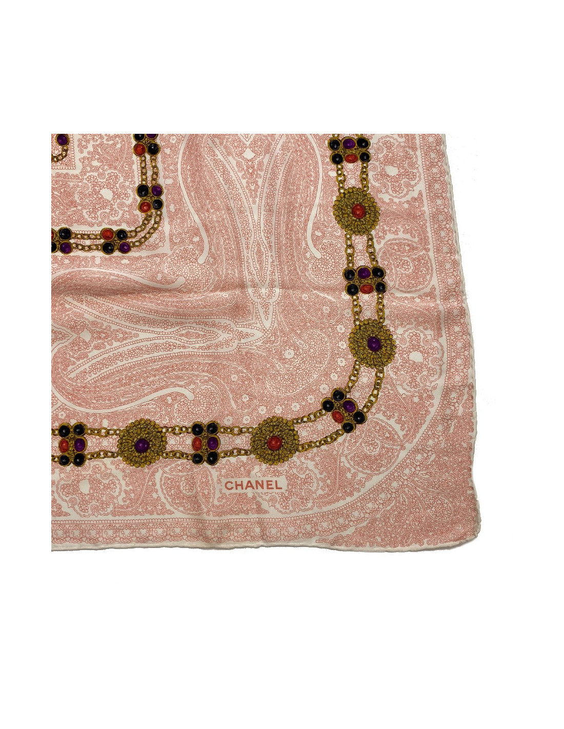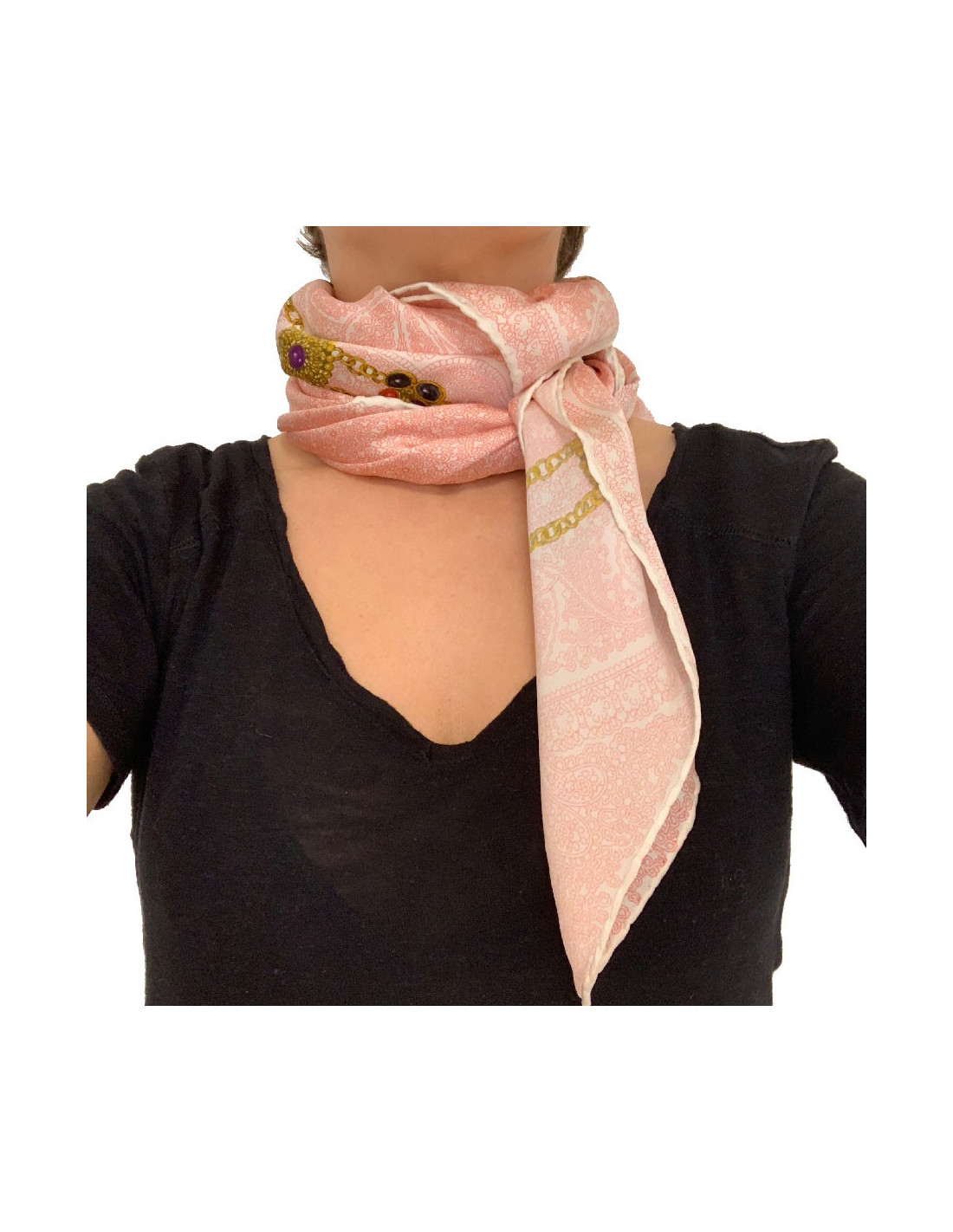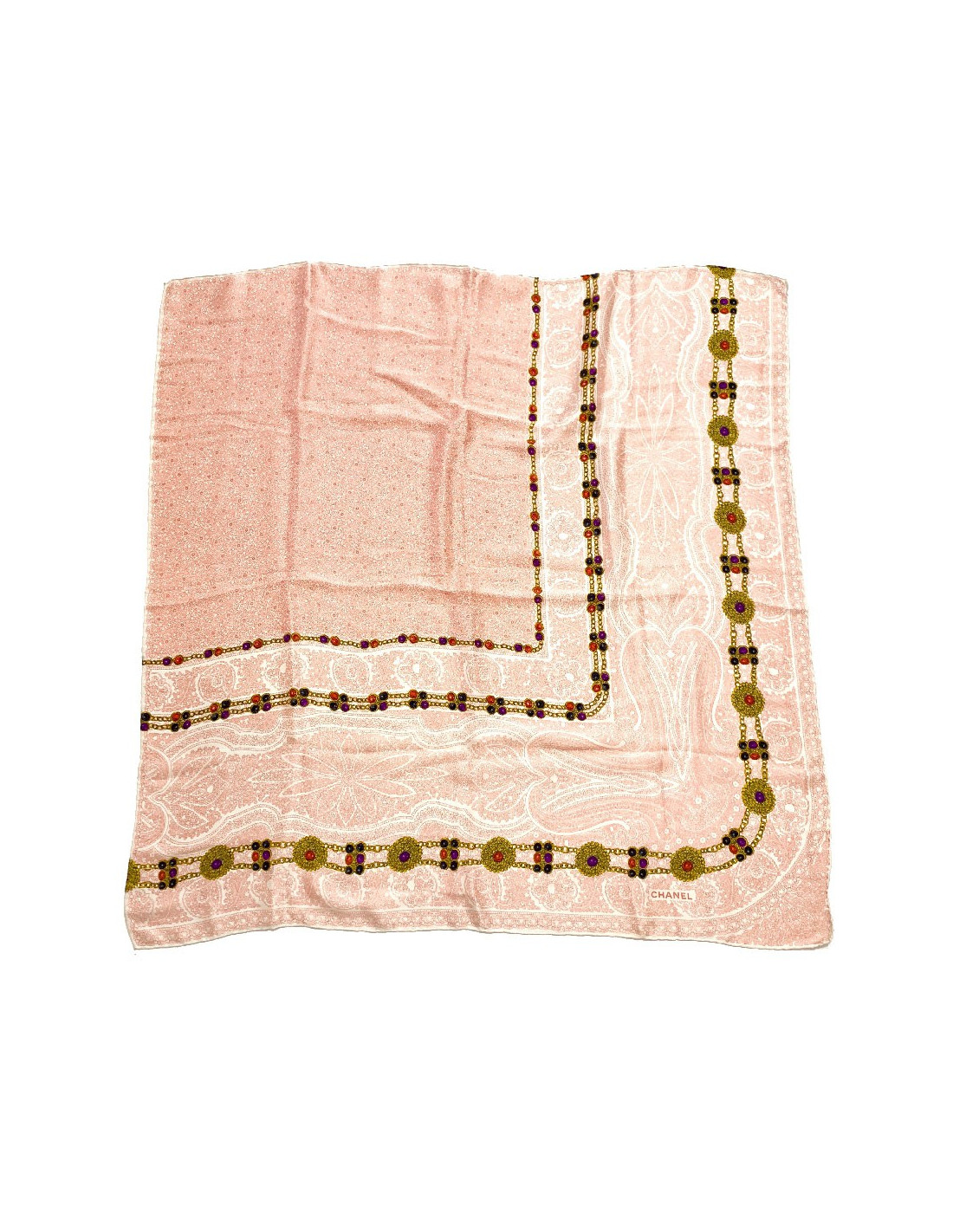 Carré CHANEL aux couleurs douces rose pâle et blanches. Il est agrémenté d'un dessin représentant les bijoux de la maison CHANEL. Léger et doux, vous pourrez le porter en toute saison.