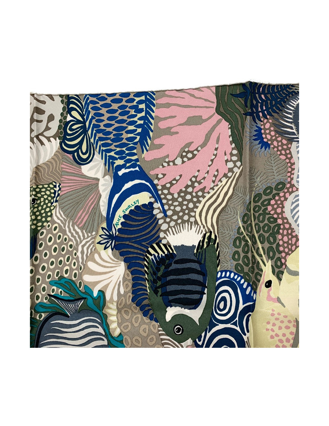 Sublime carré HERMES, modèle Under The Waves, en soie. Il a été dessiné par Alice Shirley en 2016. Il représente la barrière de corail australienne avec sa faune marine. Les tons de vert, turquoise et rose apportent une douceur à ce foulard. La bordure roulottée est blanche. Made in France.