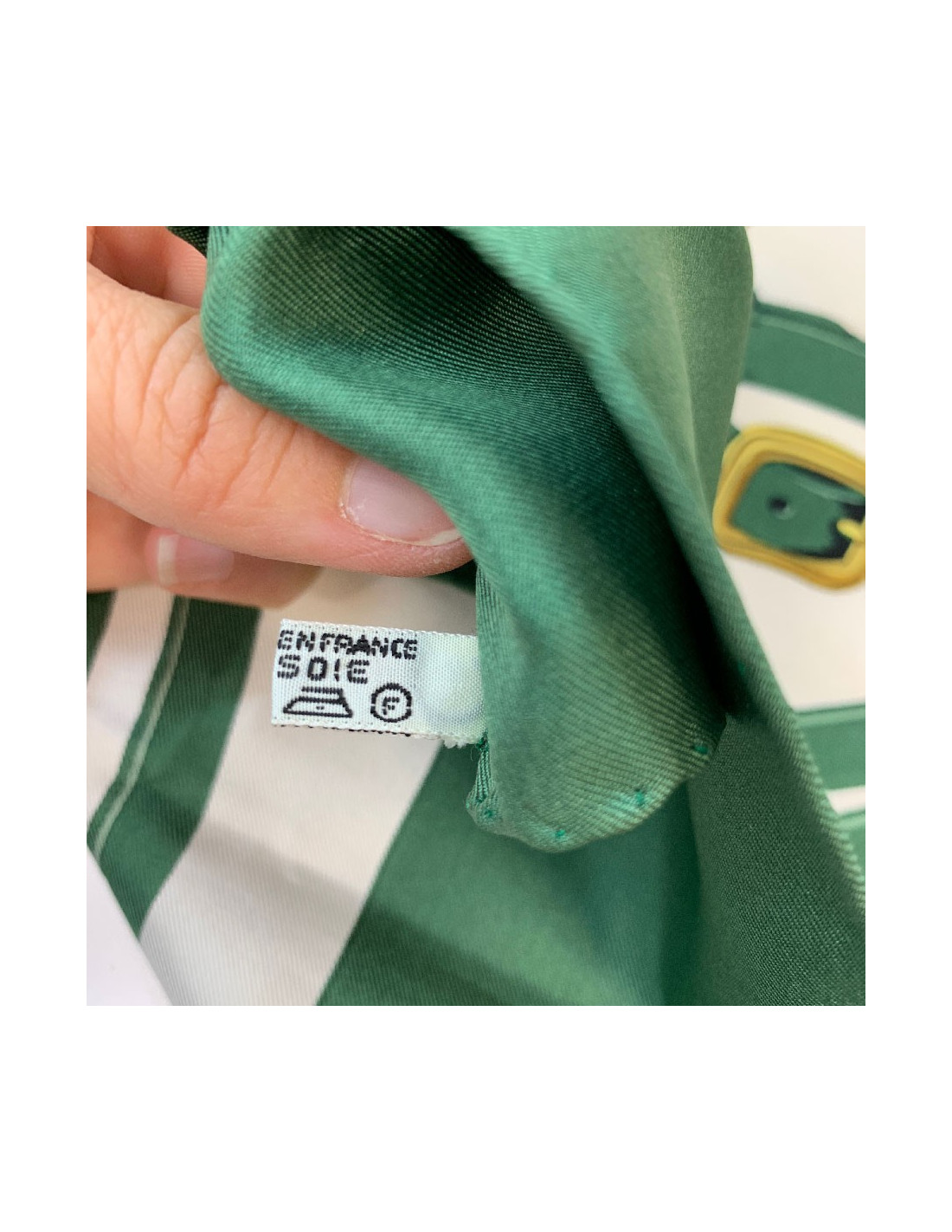 Il est en twill de soie verte et ivoire.