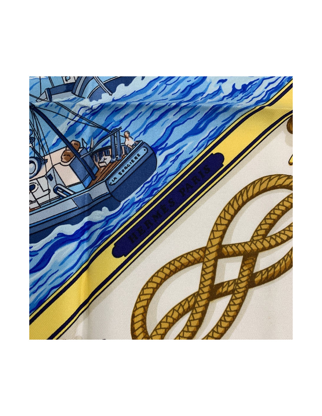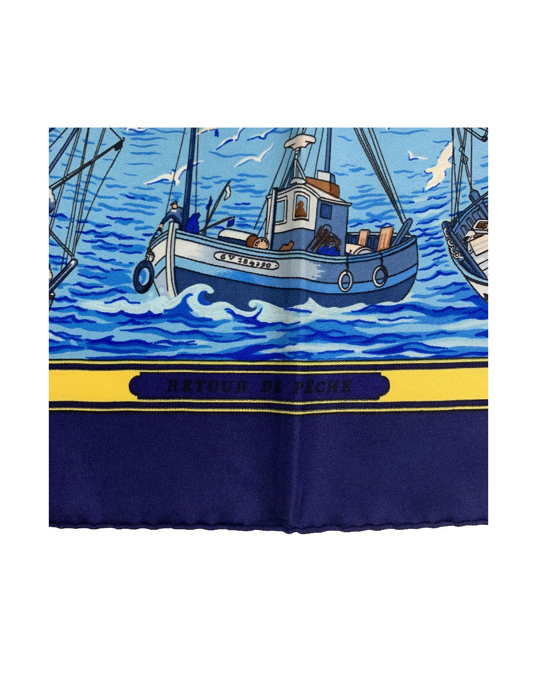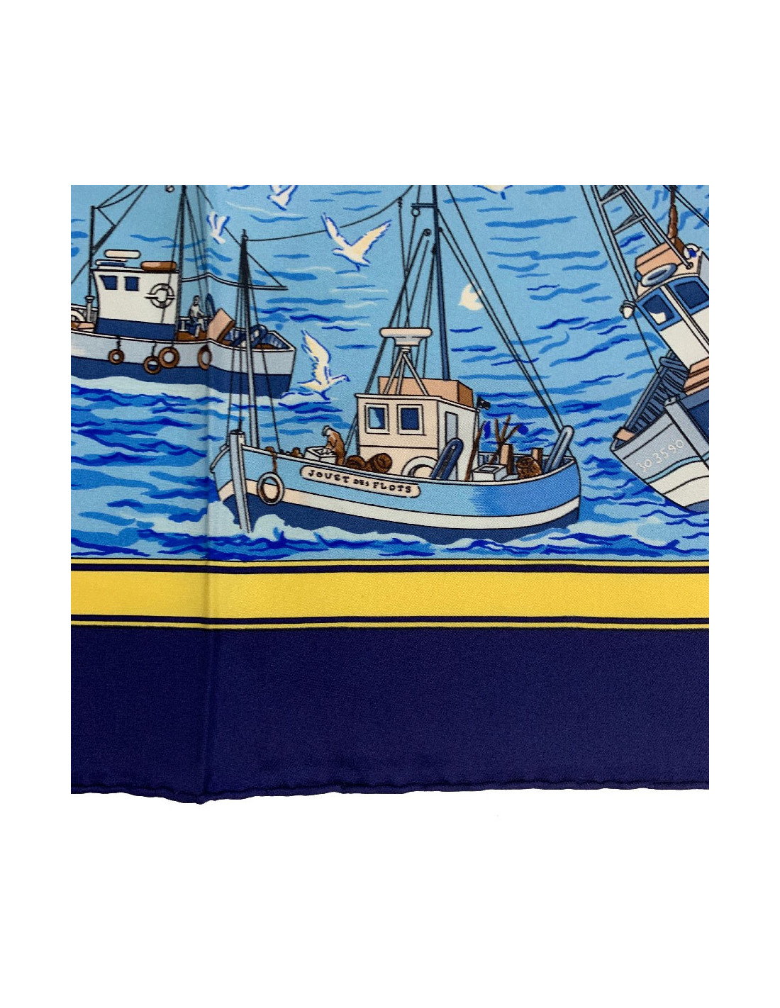 Très beau foulard HERMES, en twill de soie, dessiné par F. de La Perrière en 1987, modèle 'Retour de Pêche'. Ses bleus clair et bleu profond font la part belle à ce carré. Le jaune apporte la luminosité. Facile à porter nous l'aimons beaucoup.