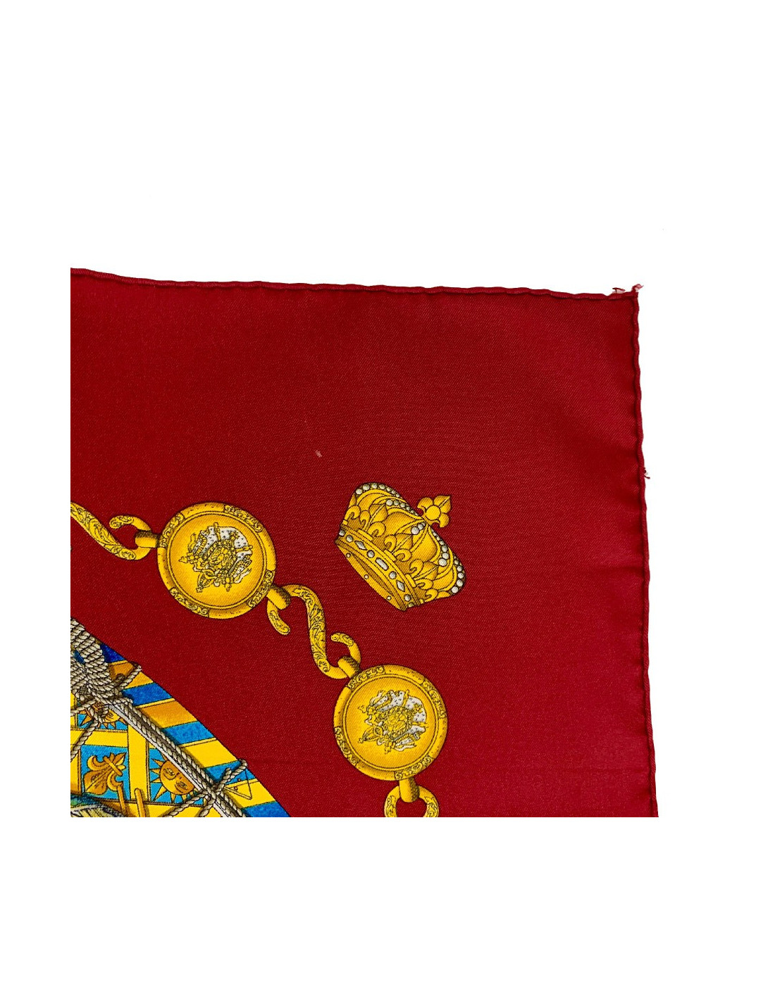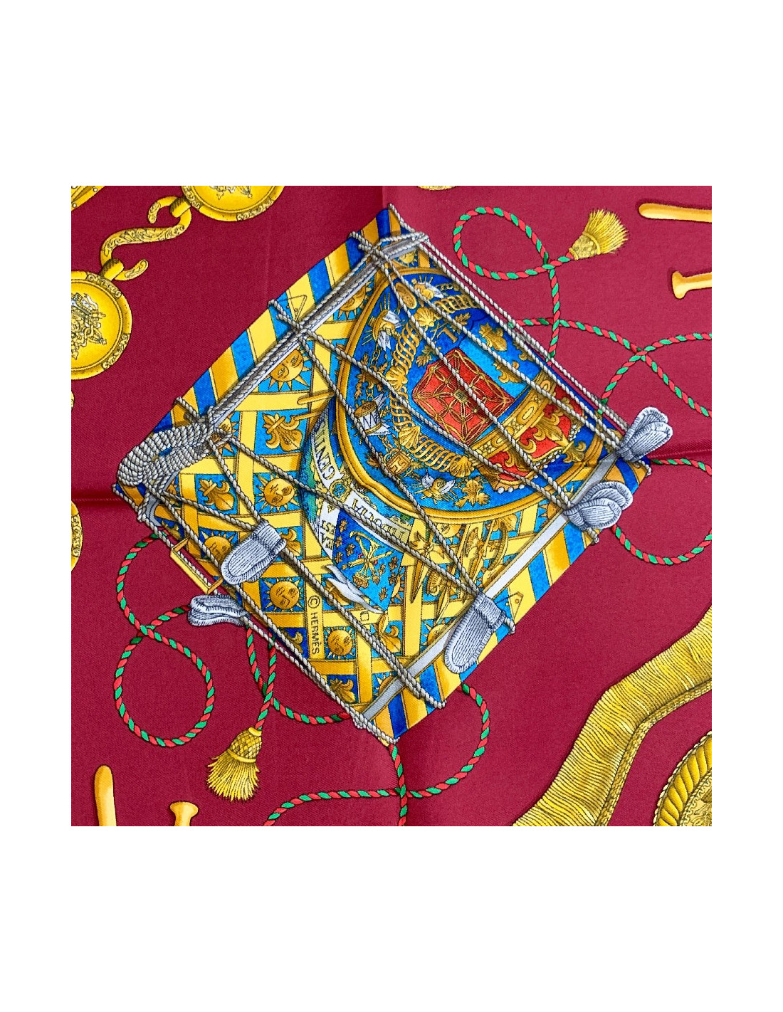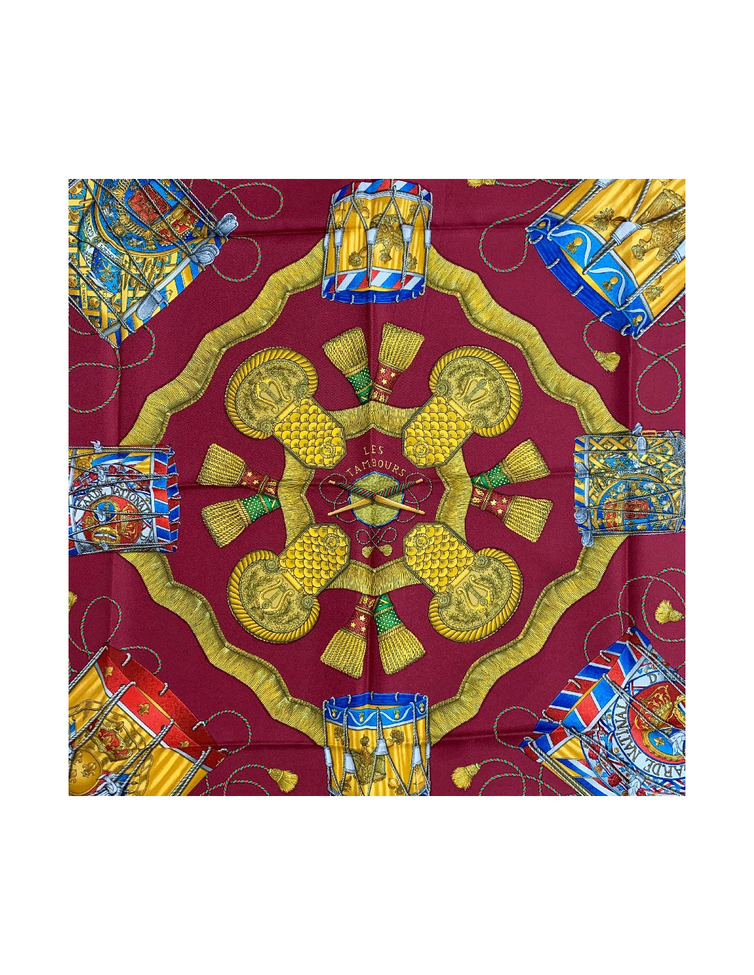 Très beau carré de la Maison HERMES, modèle Les Tambours, en twill de soie lie de vin, et motifs or, bleu, rouge. Il a été dessiné par Joachim Metz en 1989. Il représente les tambours, instruments joués par la garde nationale.