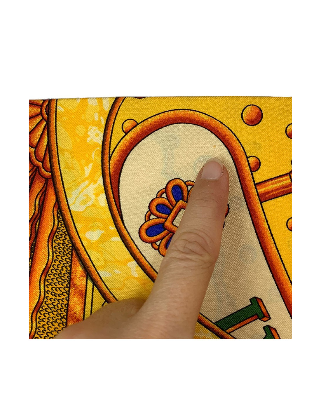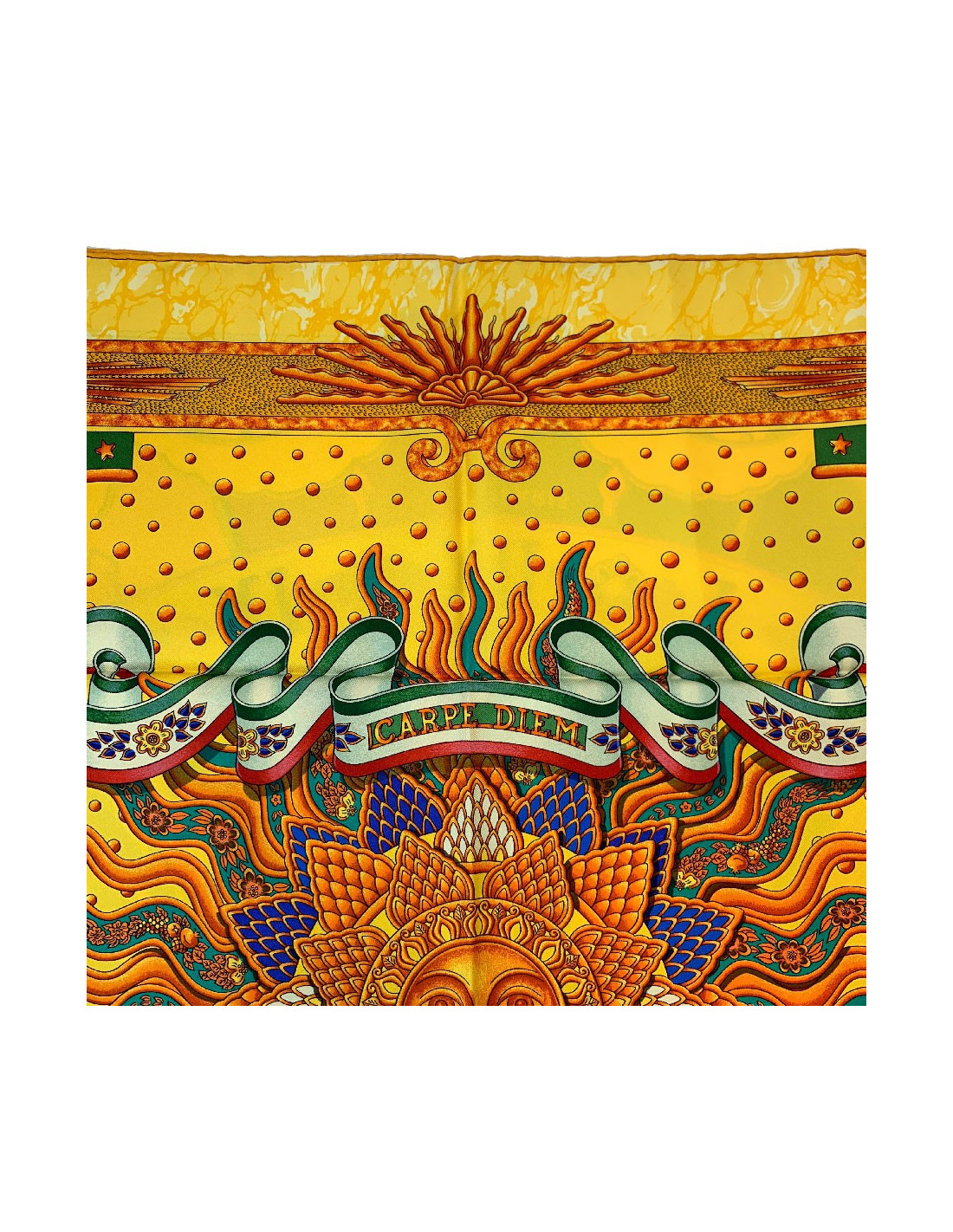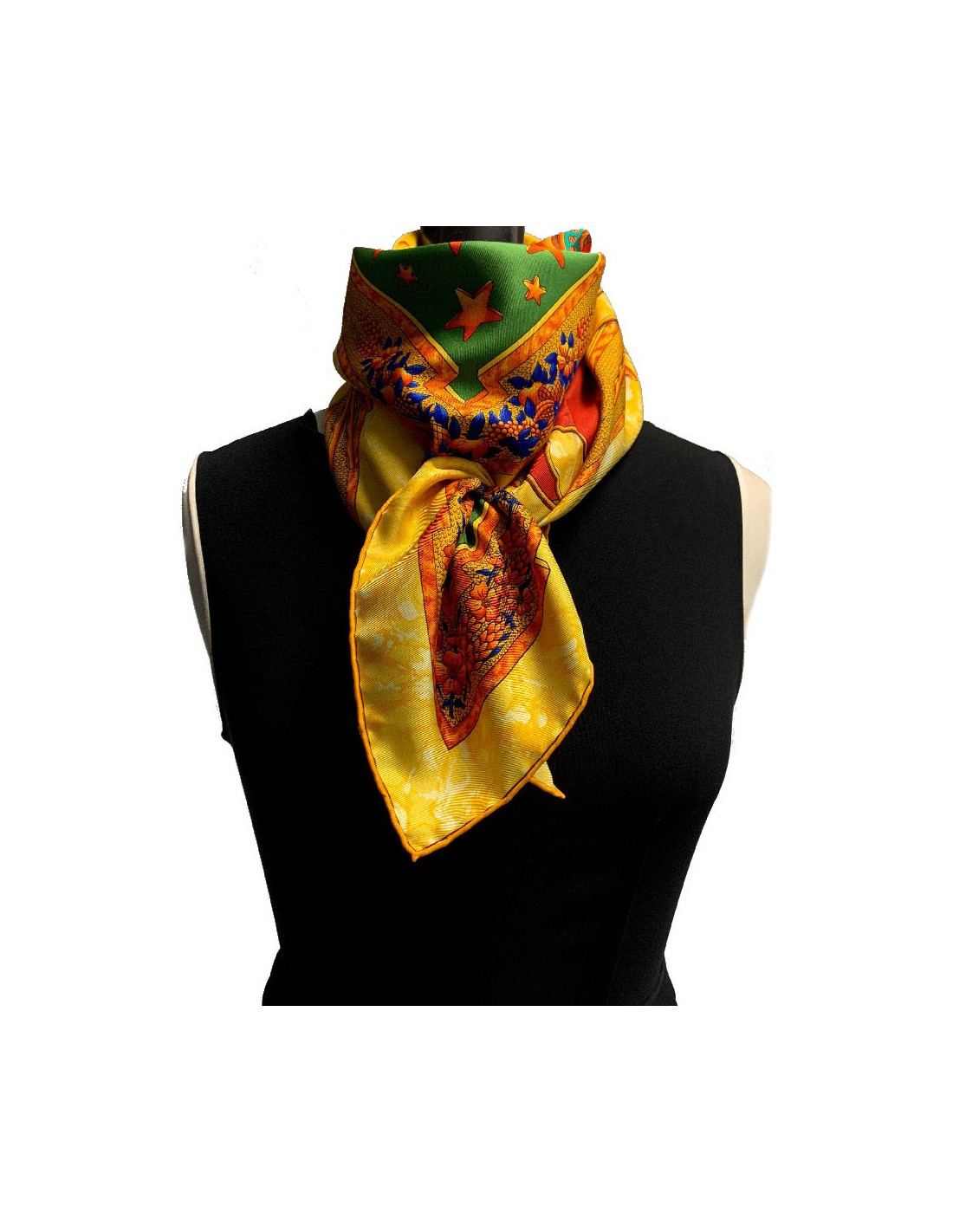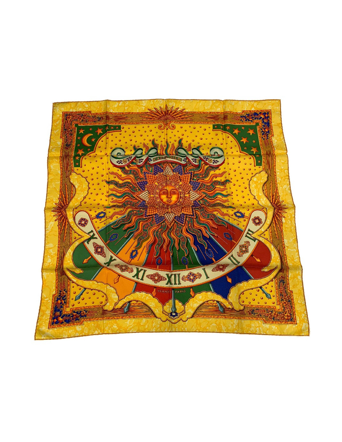Ce foulard est vintage, en soie à tendance jaune, rouge, vert et bleu. Dessiné par : Joachim Metz et édité en 1994. Il est éclatant de par ses couleurs. Thème solaire avec ses cadrans solaires.