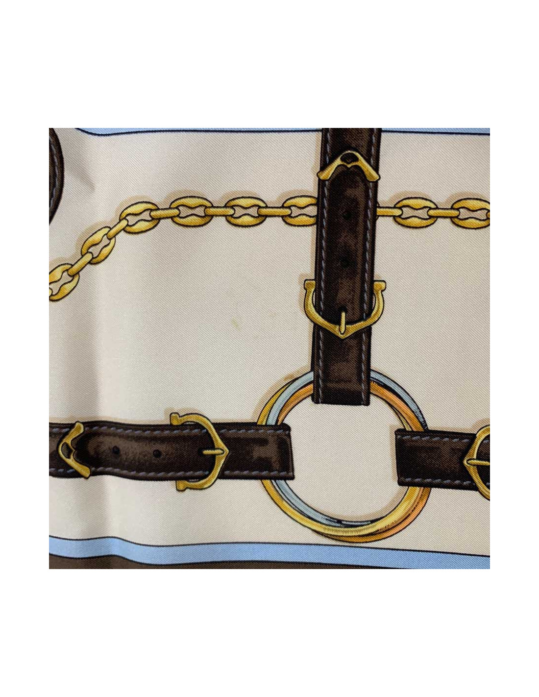 Intemporel de la Maison, foulard CARTIER, modèle MUST de Cartier, en soie. Bordure de couleur marron, fond beige et motif or et bleu ciel.