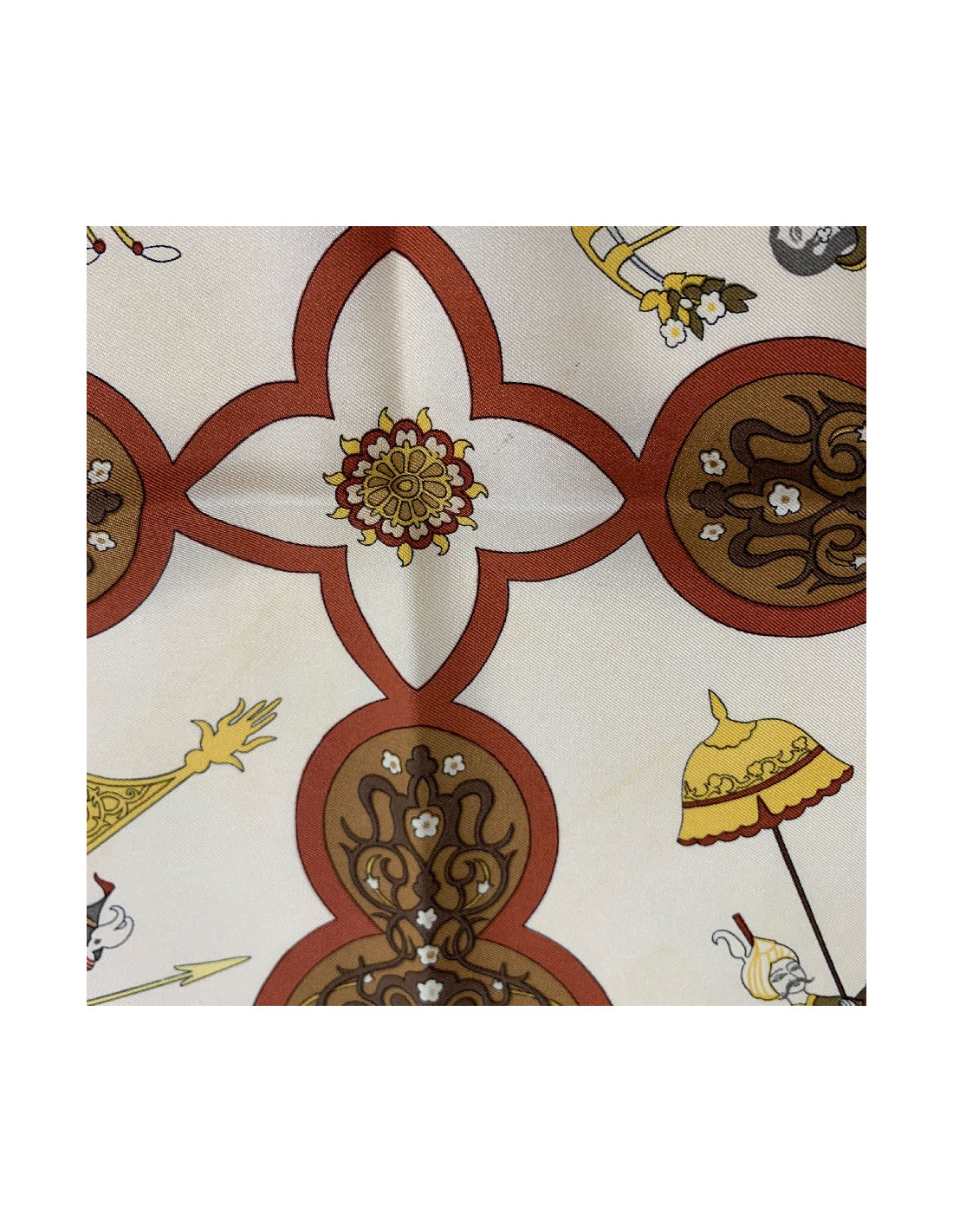 Ce carré est en bon état. Il a quelques tâches sur le fond beige (voir photo). Le roulotté est légèrement aplati.
