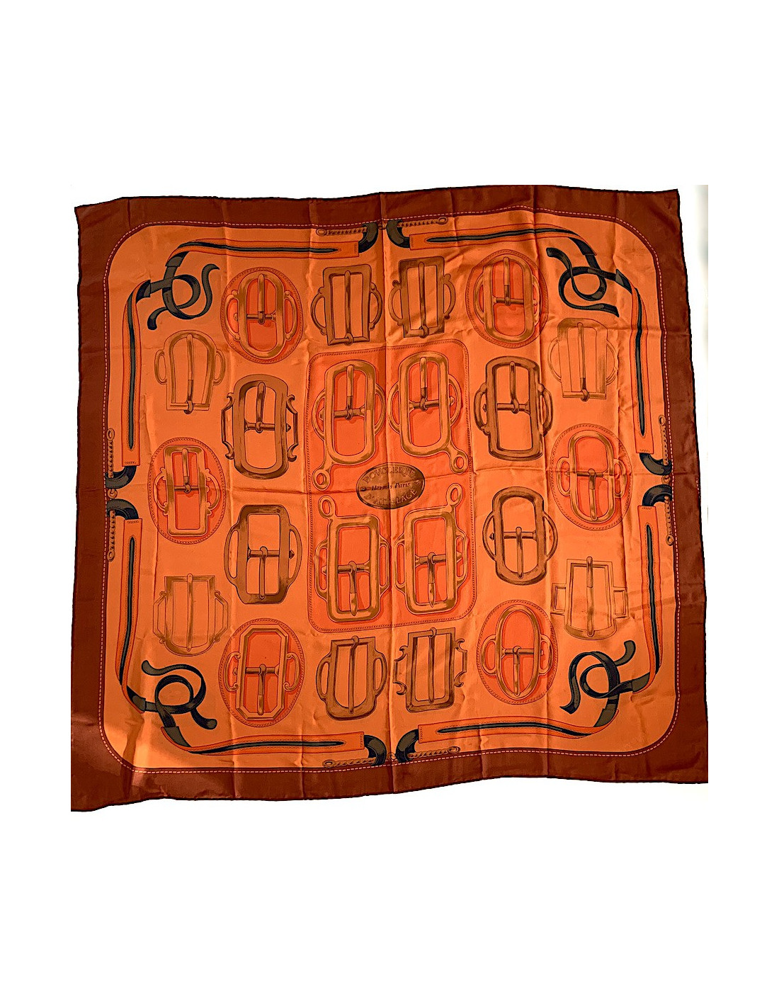 Châle ou grand carré en soie, de la Maison HERMES, modèle Bouclerie d'attelage dessiné par F. de la Perrière. La couleur orange est dominante, bords plus foncés.