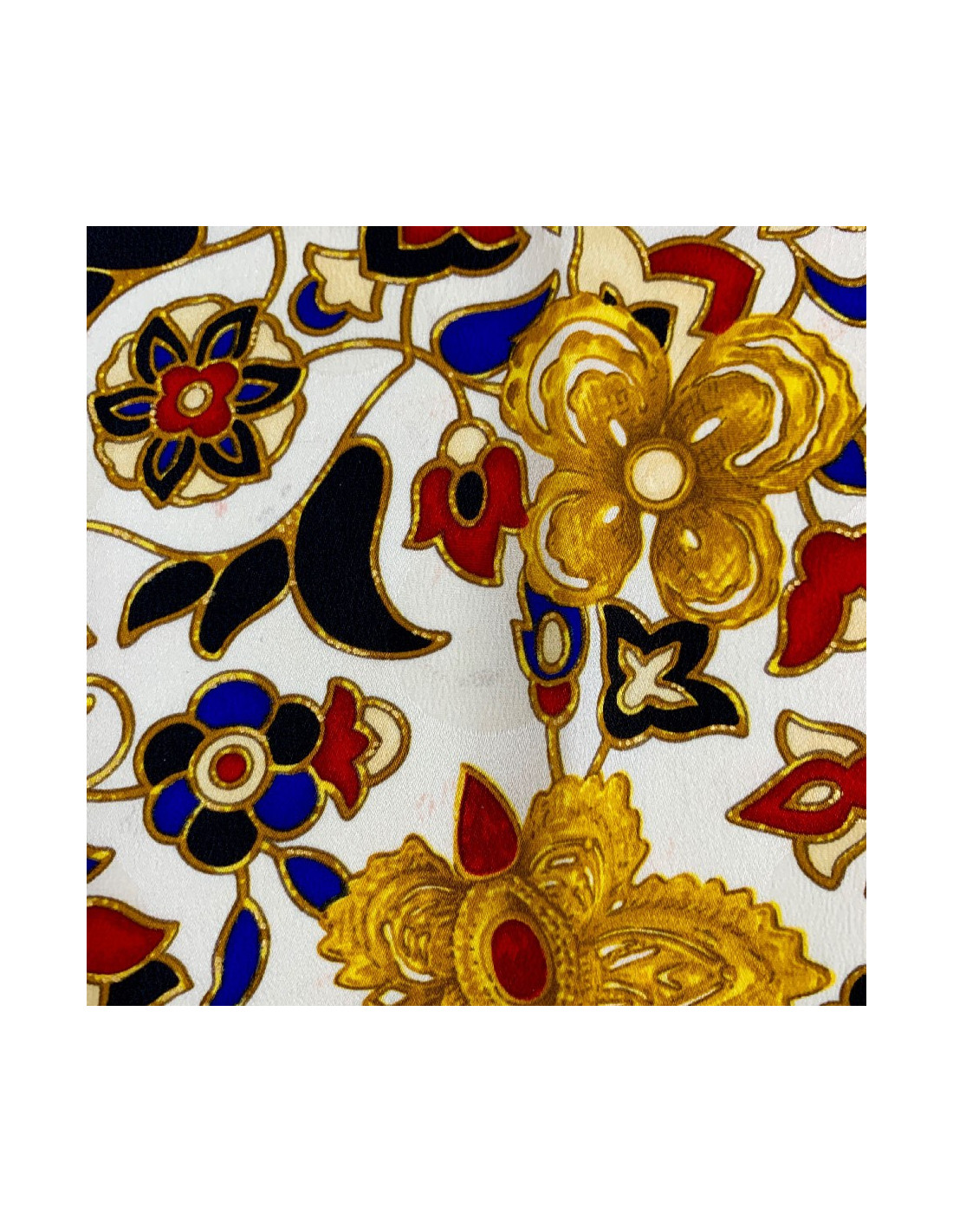 Superbe carré de la maison YVES SAINT LAURENT. Il est en soie dont les couleurs sont à dominante de noir, or et beige. Ce carré présente un motif floral élégant. Chic à porter.