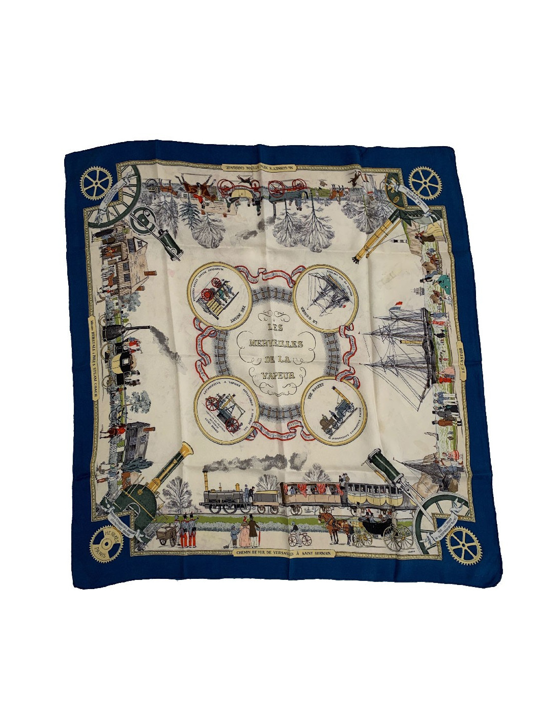 Foulard de la Maison HERMES, modèle Les Merveilles de la Vapeur en twill de soie. La bordure est bleue, le fond du carré est beige avec de paysages et trains multicolores. Ce foulard a été dessiné par Philippe Ledoux. La 1ere édition date de 1958.