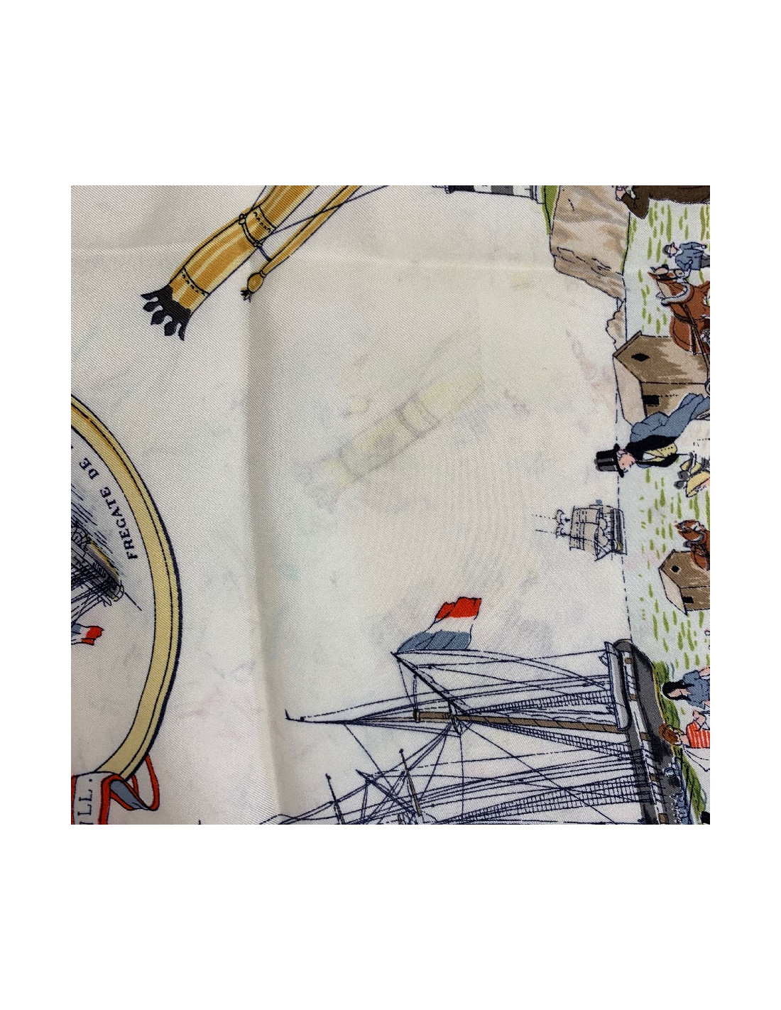 Ce carré est dans un état correct. Il y a des décolorations sur l'ensemble du foulard (voir photos). Le rouloté est aplati, en bon état dans son ensemble.