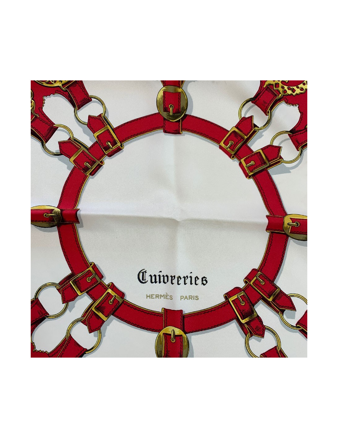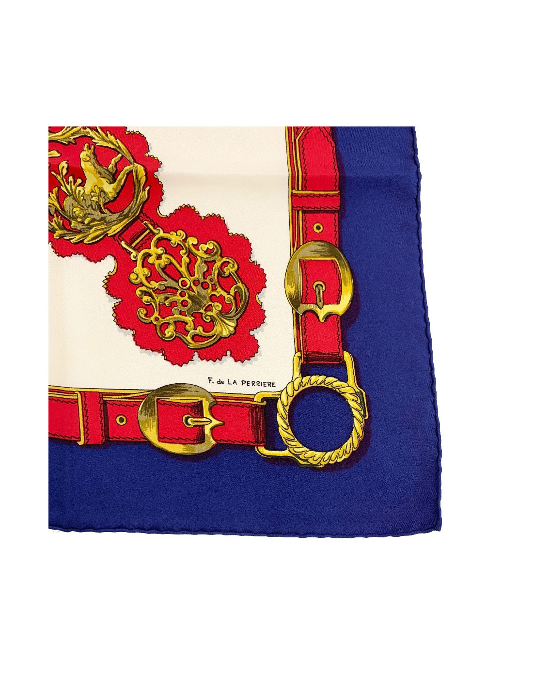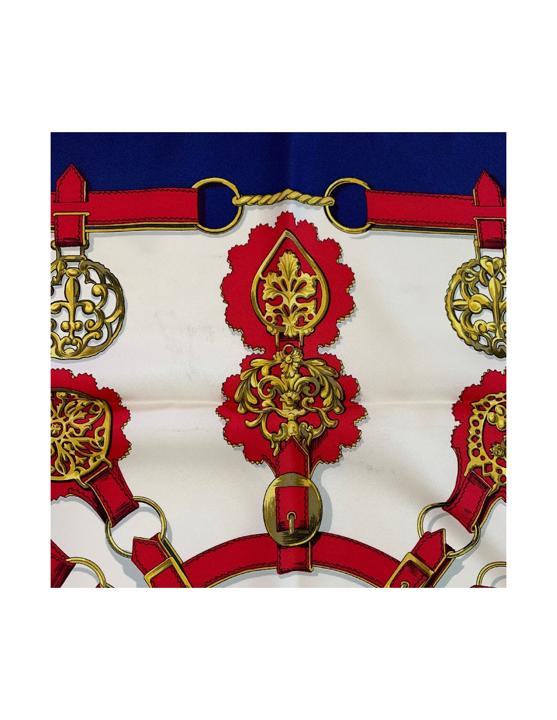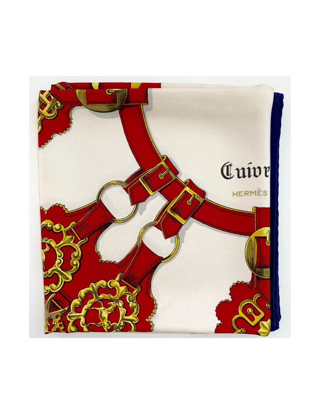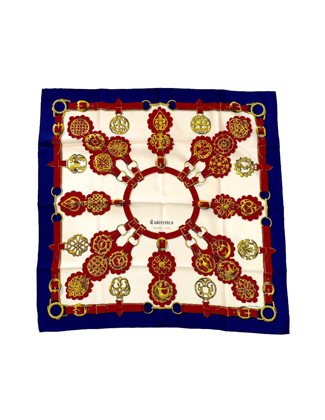 Très beau carré de la Maison HERMES aux couleurs franches (bleu, blanc, rouge, or). Le modèle intitulé Cuivreries a été dessiné par Françoise de la Perrière en 1963.