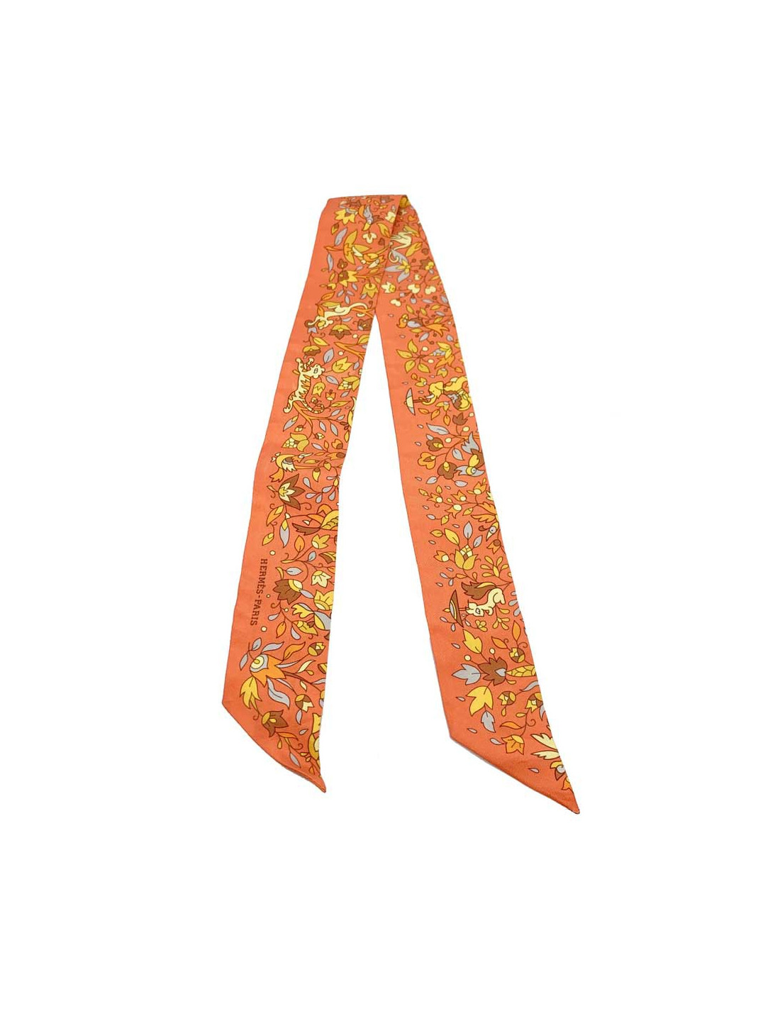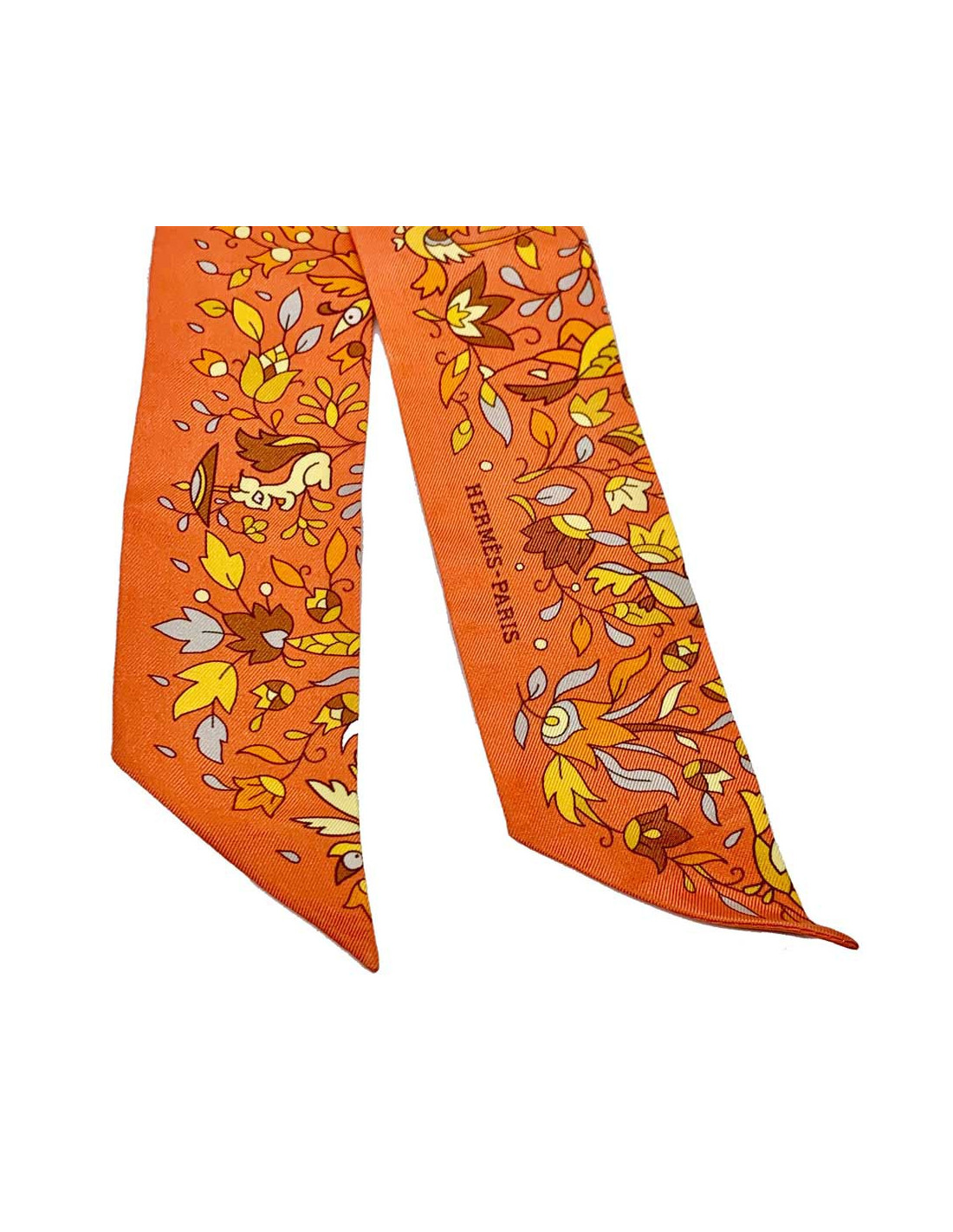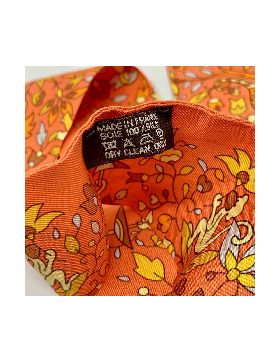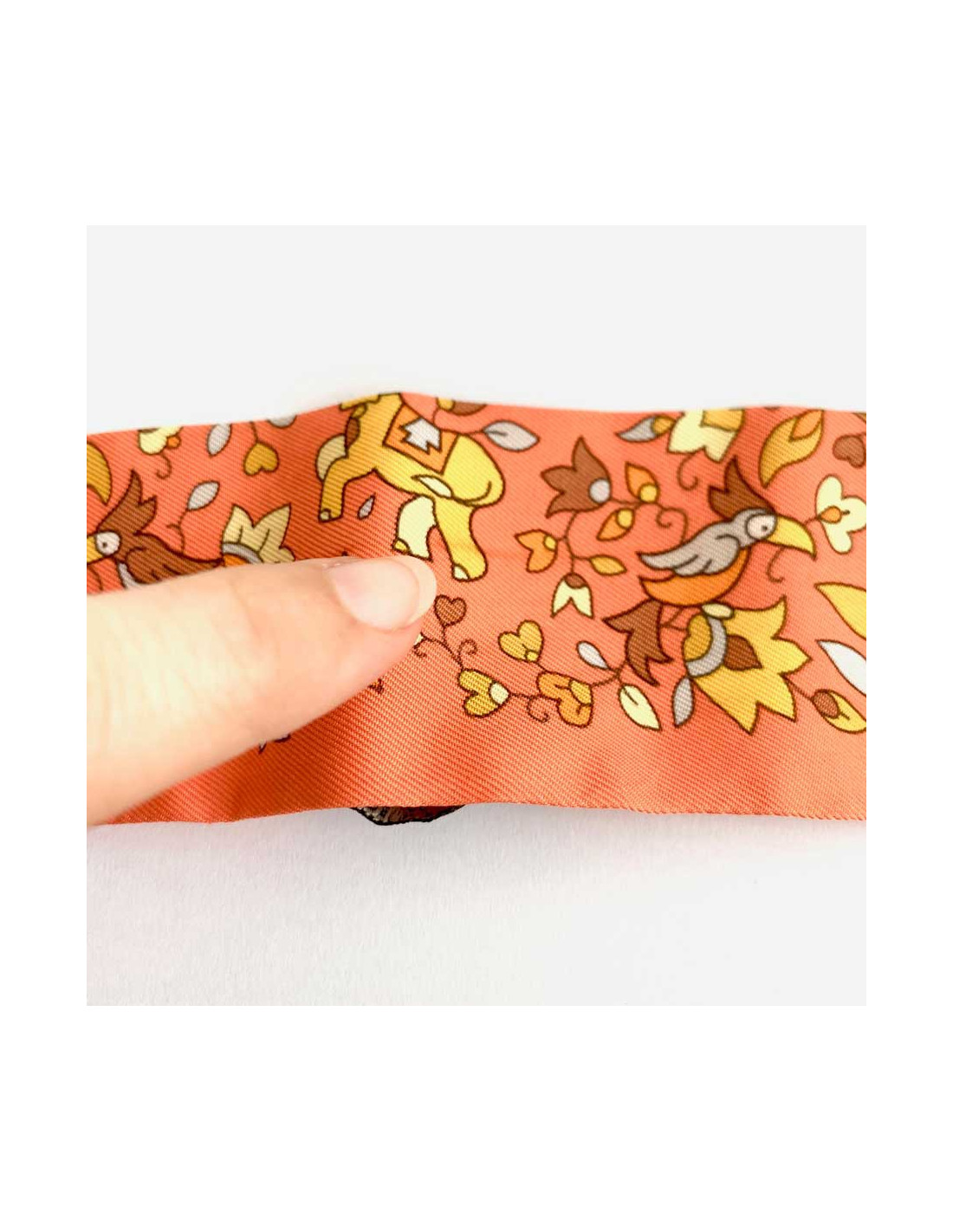 Foulard fin de la Maison HERMES, en twill de soie orange pâle. Motif : animaux de la jungle (singes, éléphants, léopards) sous la pluie.