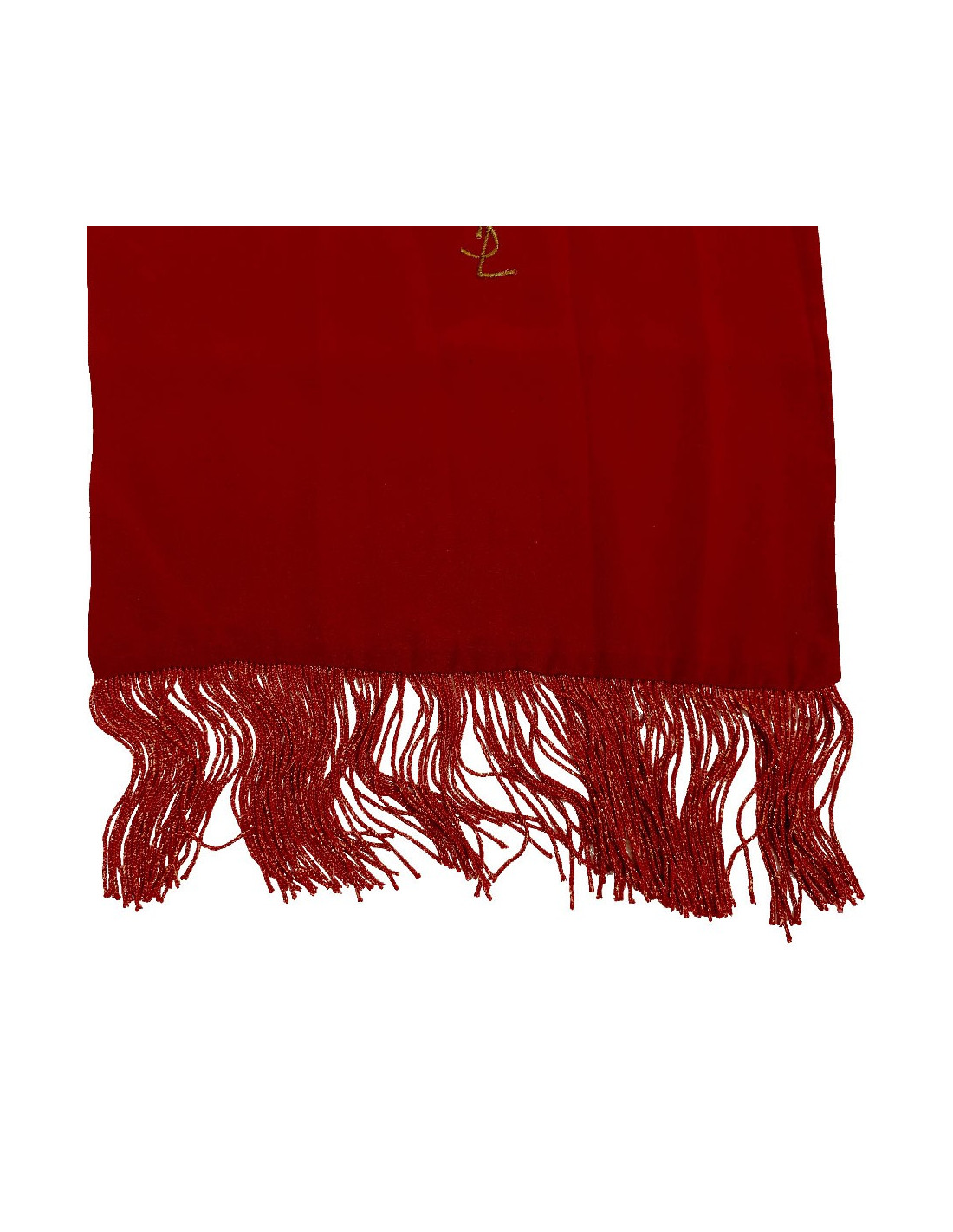 Belle écharpe de la maison Yves Saint Laurent, en soie rouge, bordée de fines franges rouges et or. Les initiales de la marque sont brodées en fil d'or sur le bas de l'écharpe.