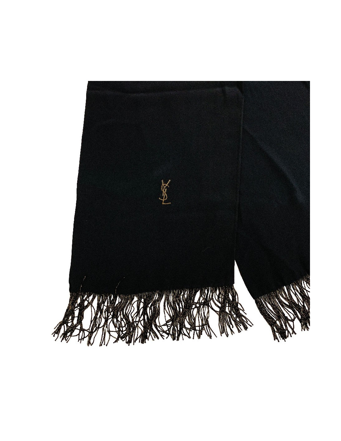 Elégante écharpe YVES SAINT LAURENT vintage, en soie noire à franges dorées et noires. Logo YSL brodé.