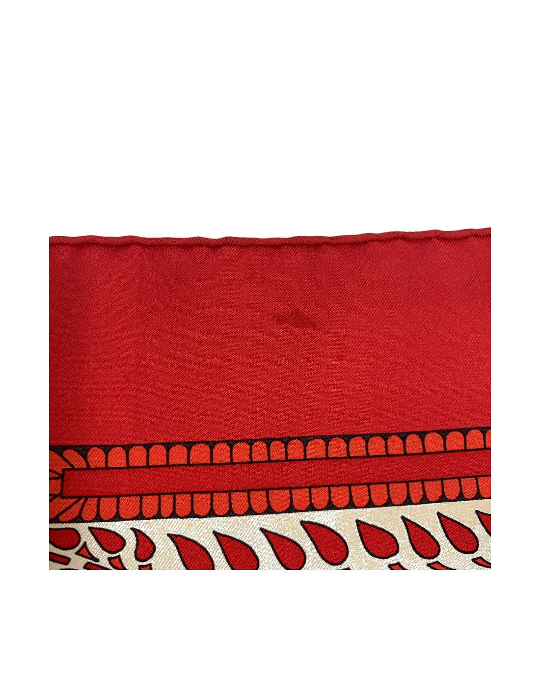 Ce très beau foulard en soie a des couleur flamboyantes : fuchsia, or et vert. Il est en très bon état. Il présente néanmoins une petite tâche sur le haut. A nettoyer chez le teinturier. Son roulotté est impeccable.
