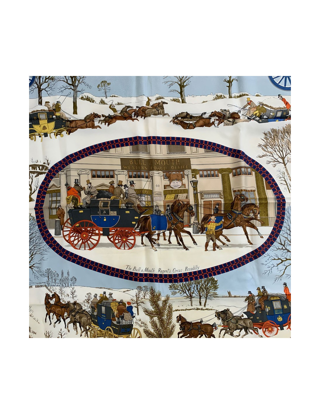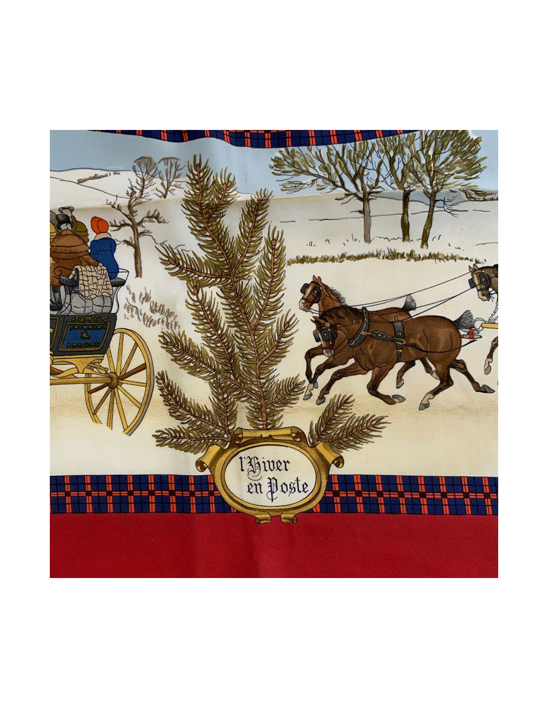 Incontournable accessoire de la Maison HERMES, le carré! Modèle L'Hiver en Poste en soie à bordure rouge, fond beige et bleu ciel. Il a été dessiné par Philippe Ledoux. Sa 1ère édition date de 1975.