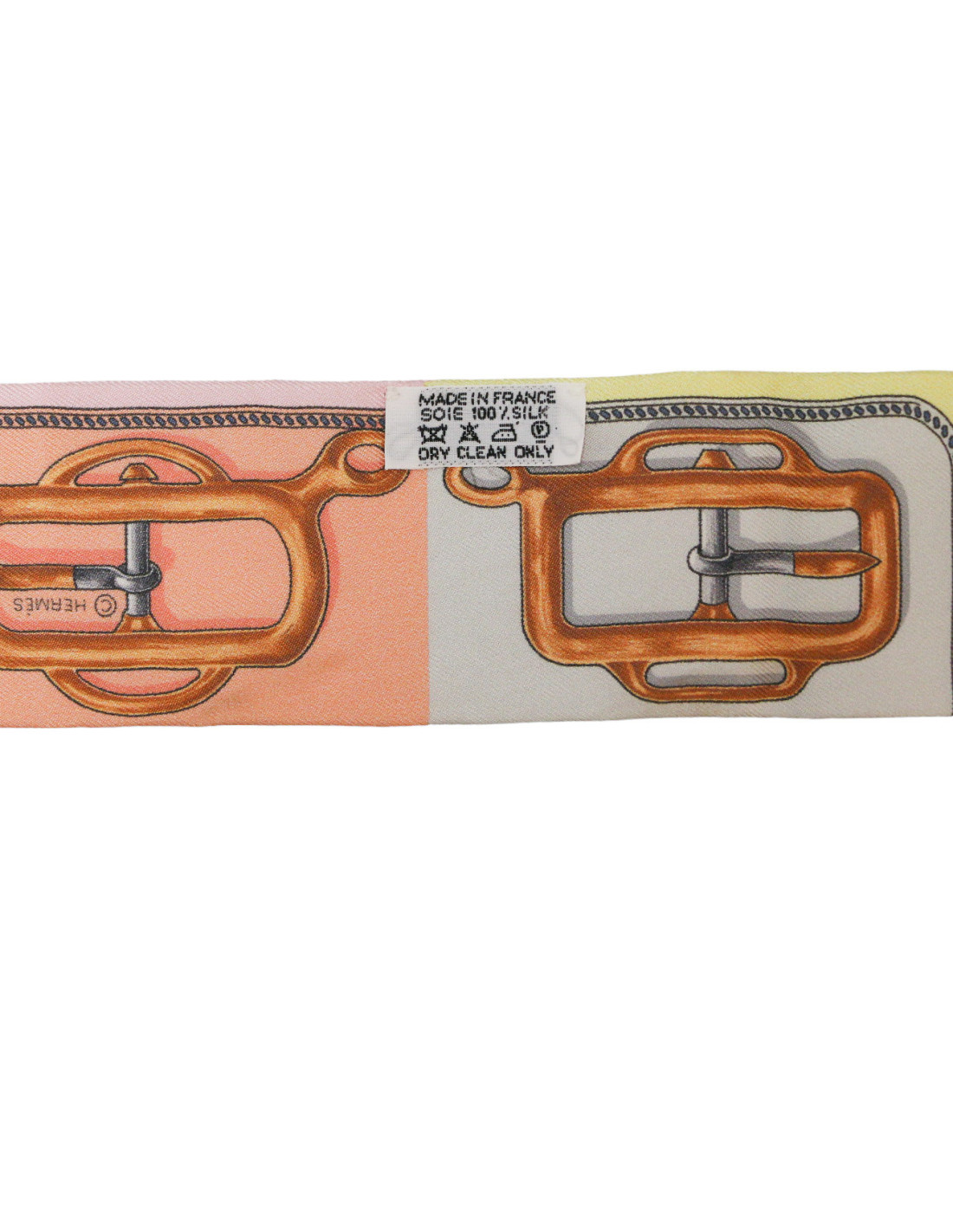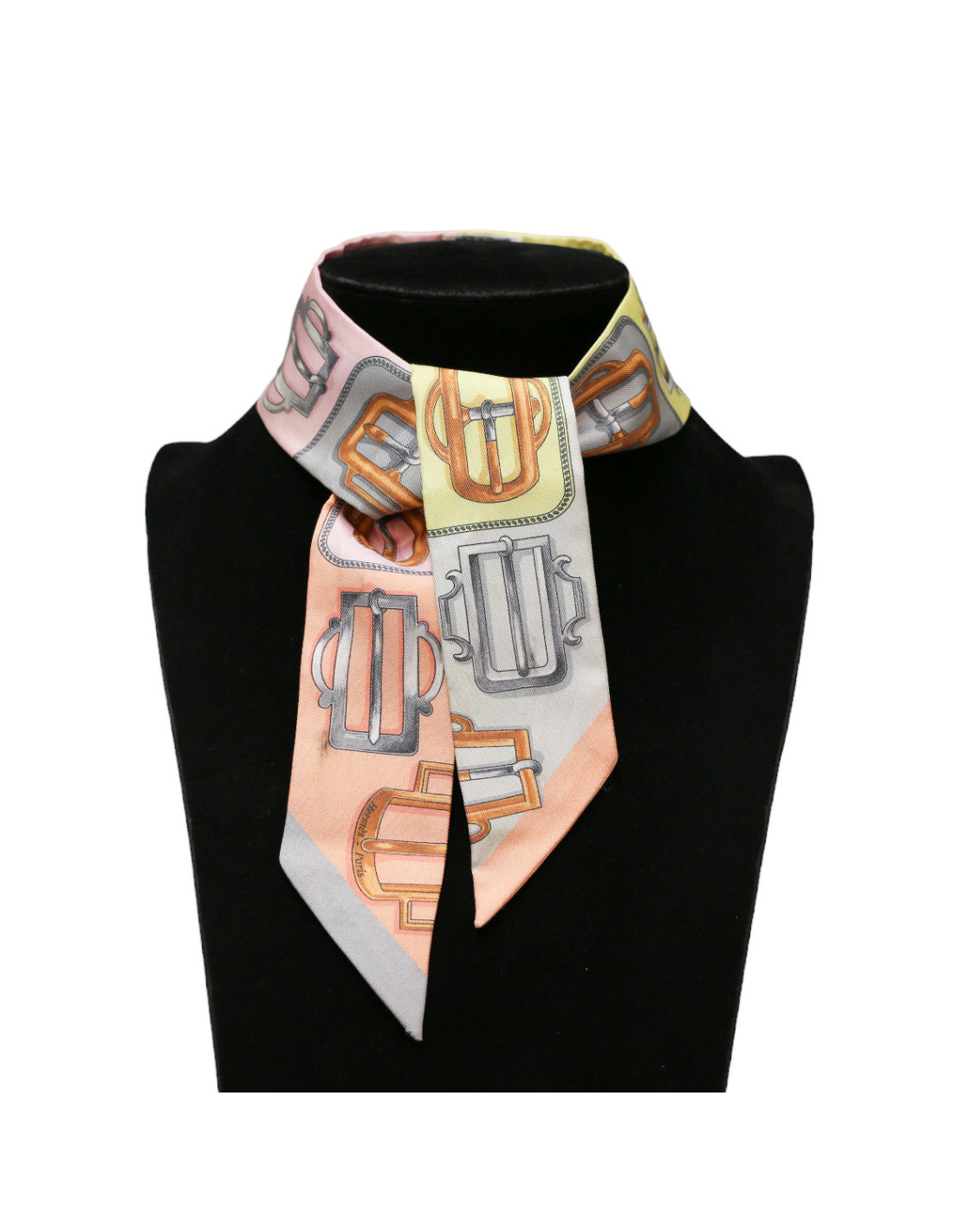 Détails : imprimé constitué de pleins de dessins de boucles de ceinture dans les tons pastels et clairs