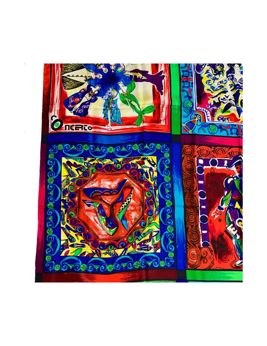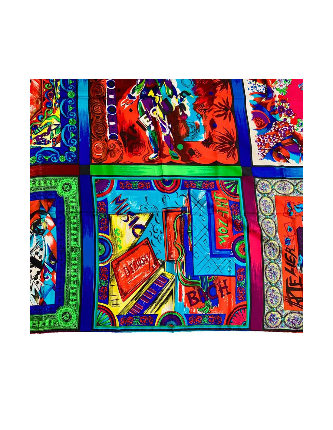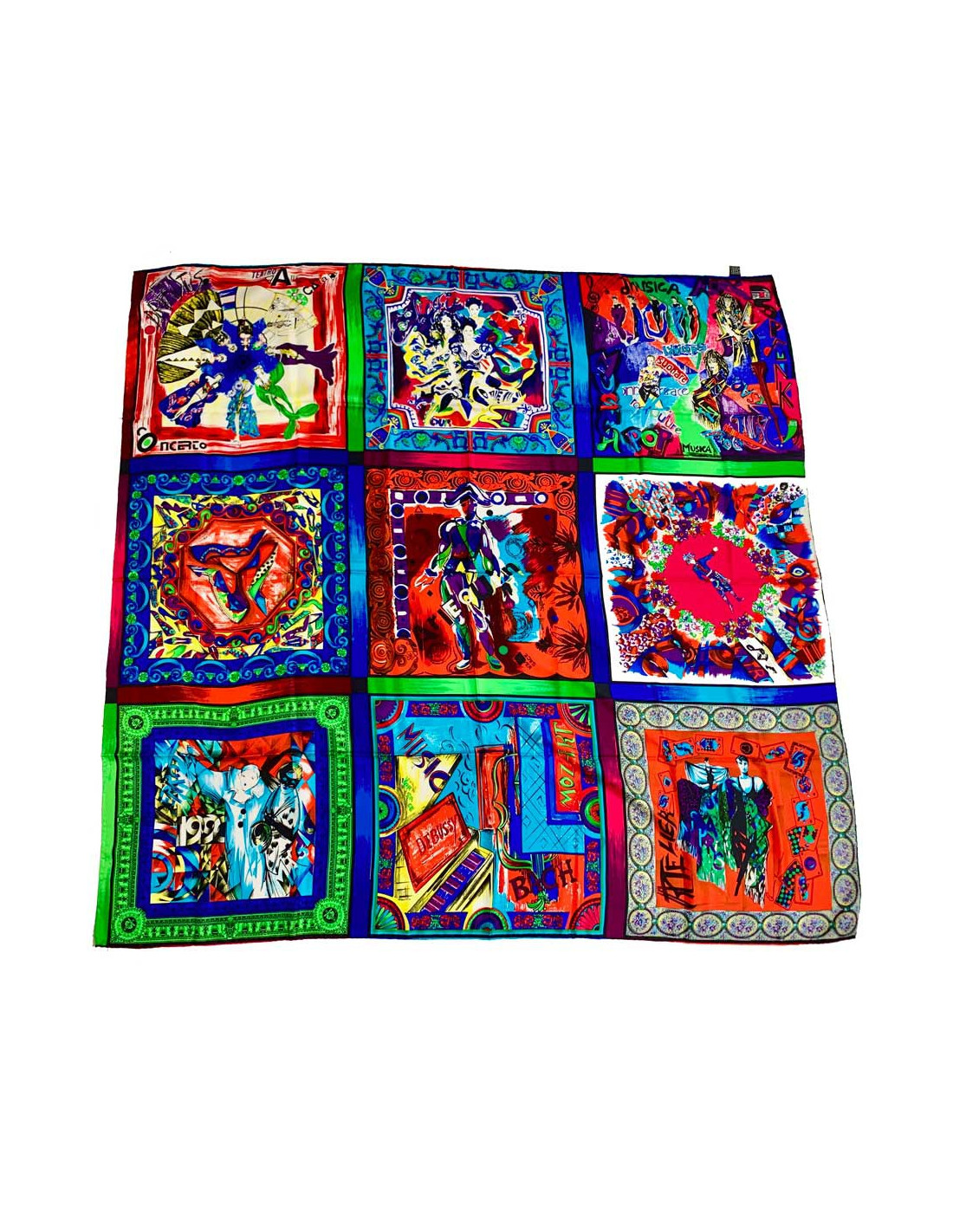 Superbe foulard de la Maison VERSACE. Cet accessoire en soie représente les différentes scènes musicales : pop, rock, le classique, les opéras... dans des encadrés très colorés.