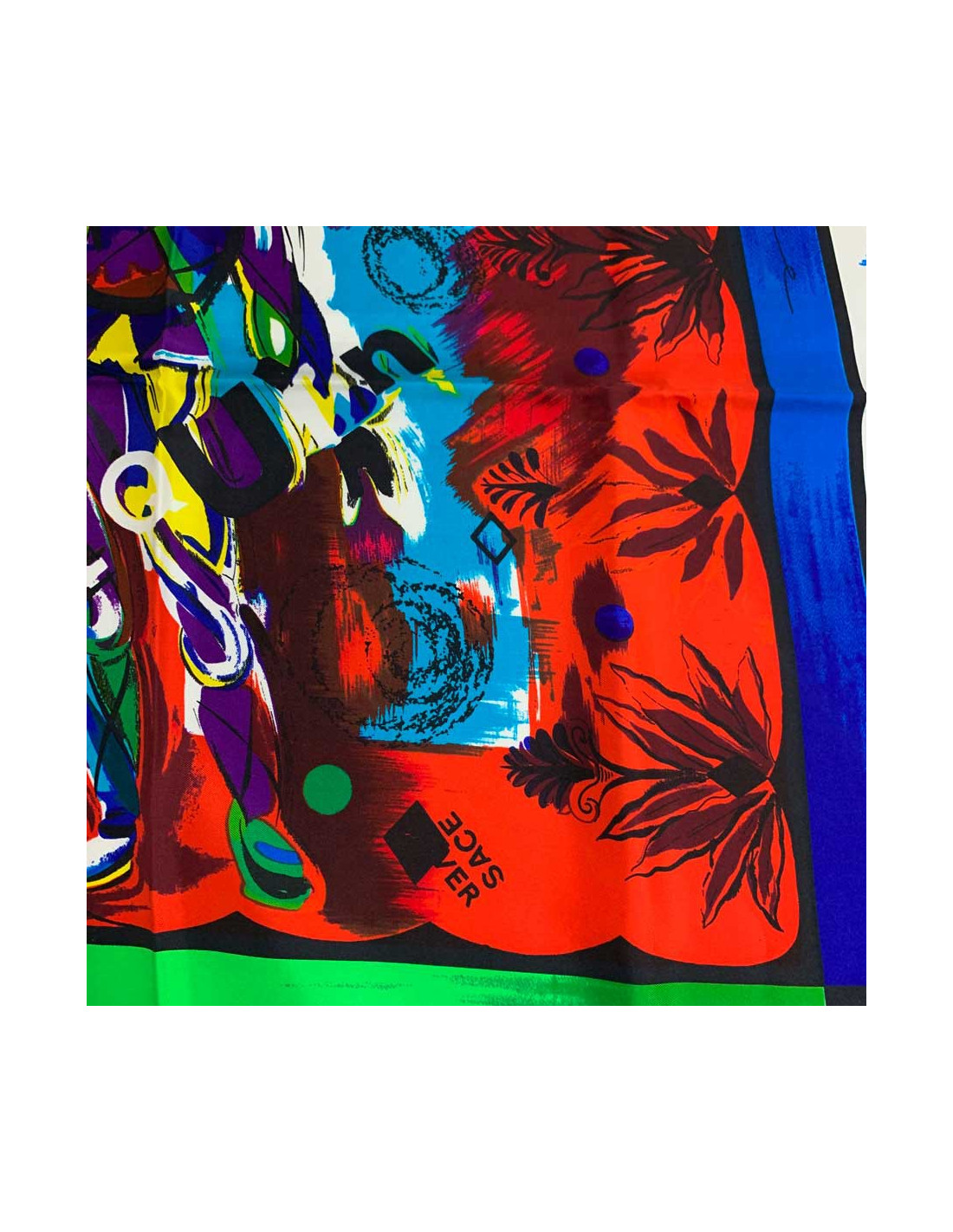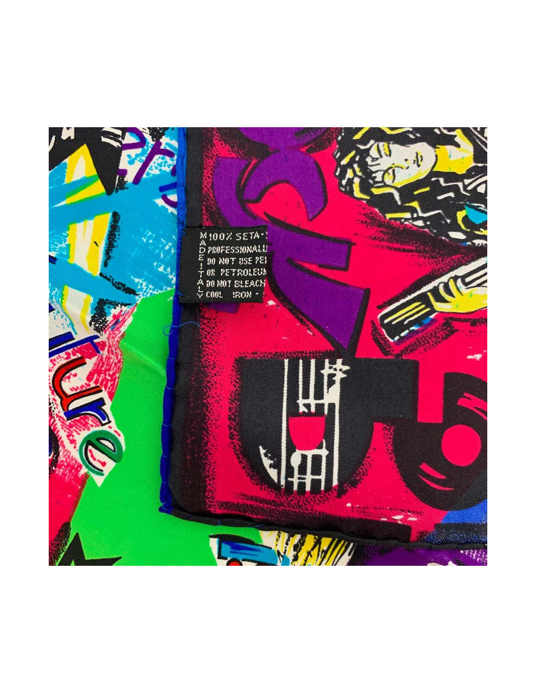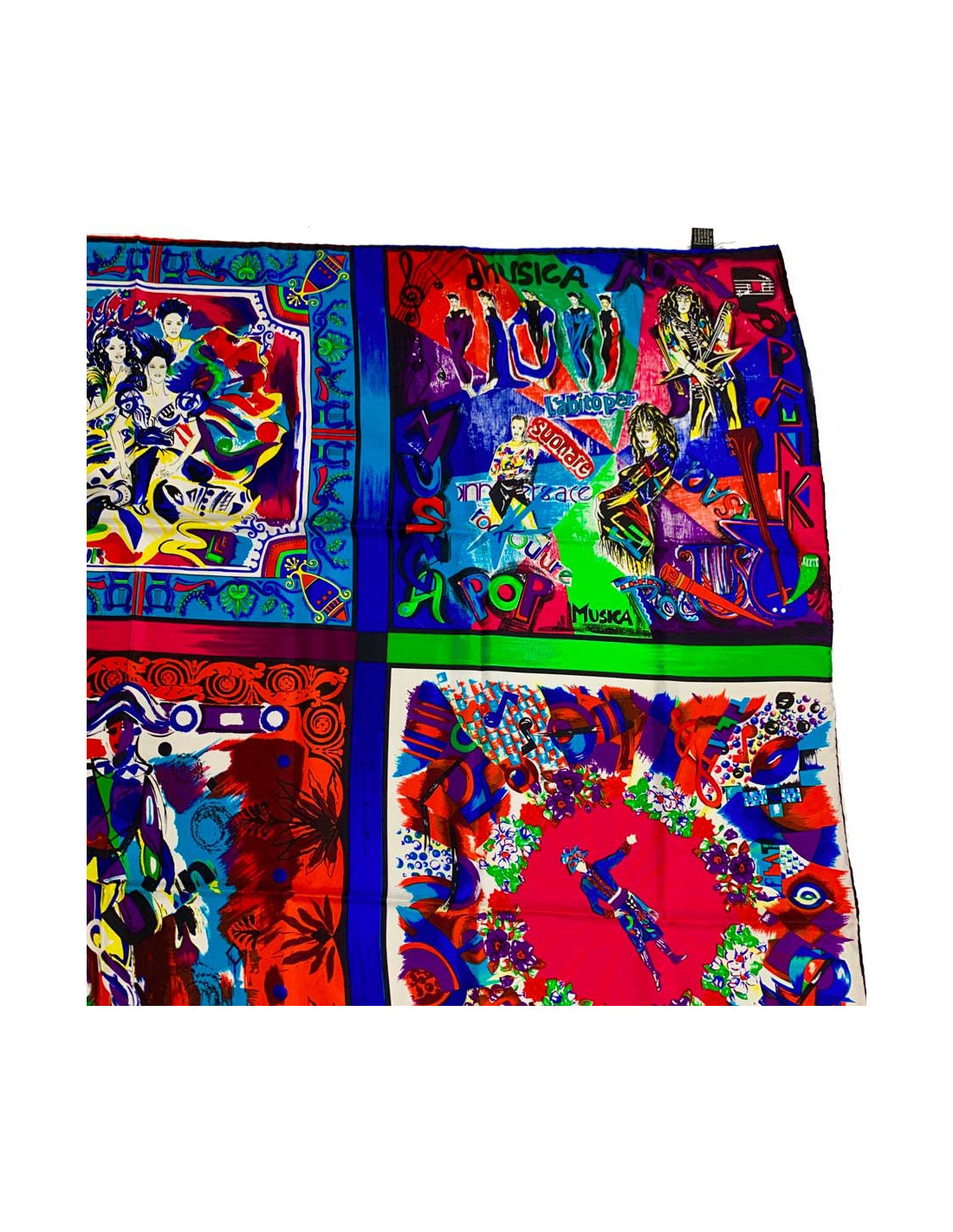 Superbe foulard de la Maison VERSACE. Cet accessoire en soie représente les différentes scènes musicales : pop, rock, le classique, les opéras... dans des encadrés très colorés.