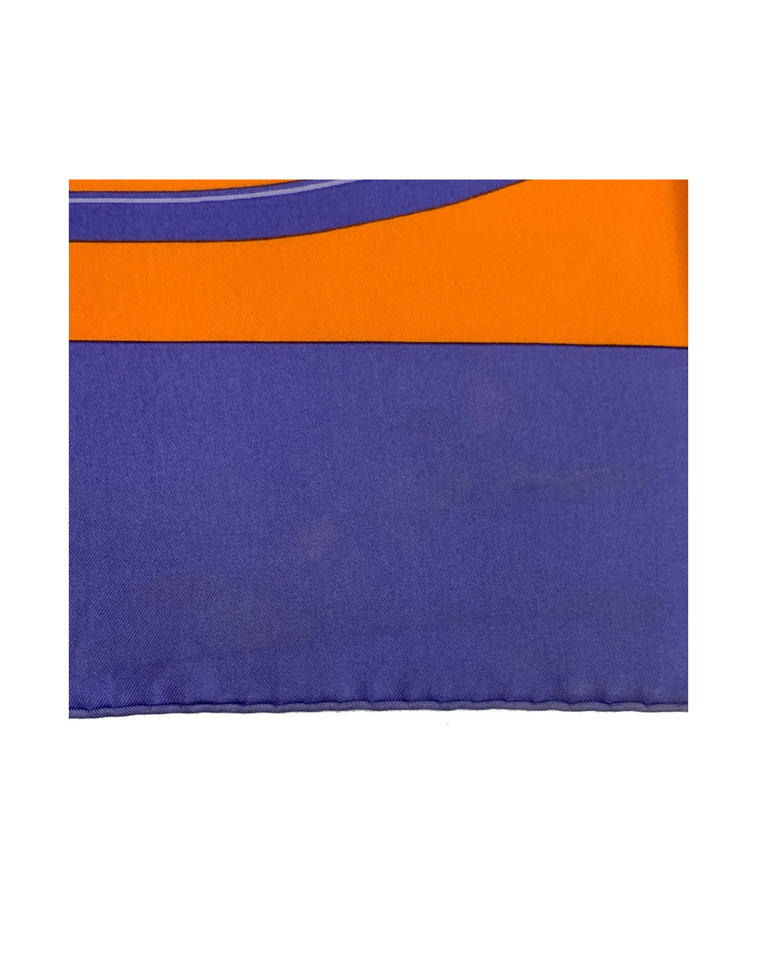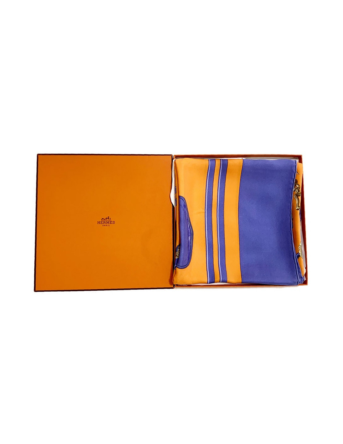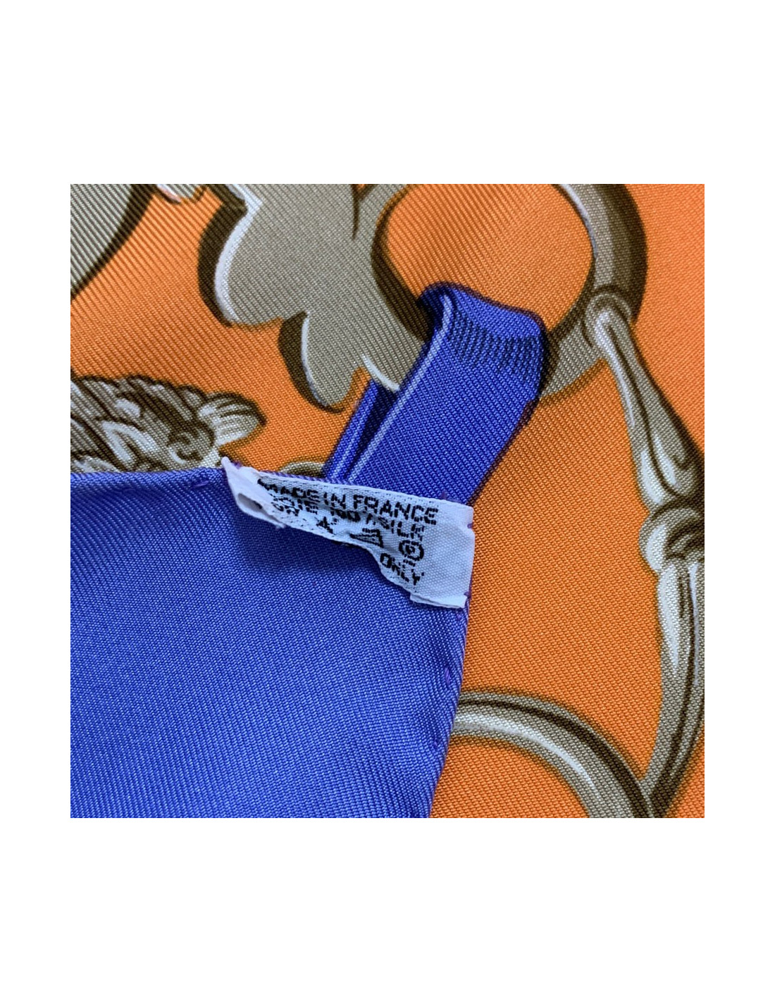 Carré de la Maison HERMES, modèle Brides de Gala, en soie mauve et orange. Il a été dessiné par Hugo Grygkar. La première édition date de 1957. Celui-ci est une réédition.