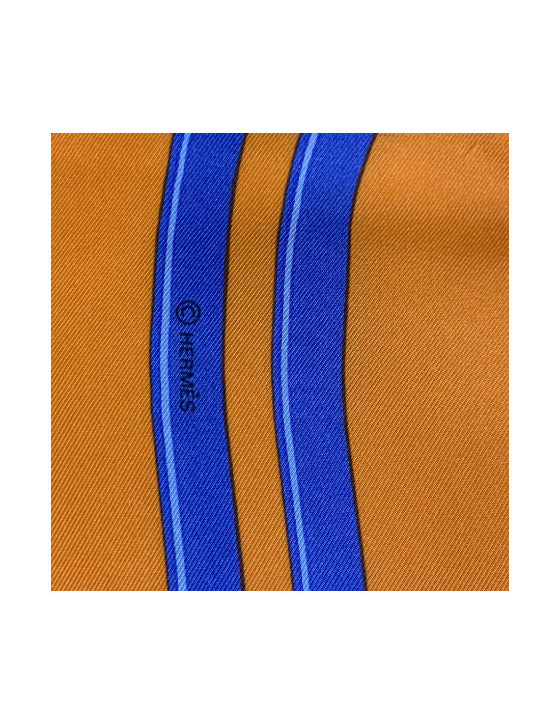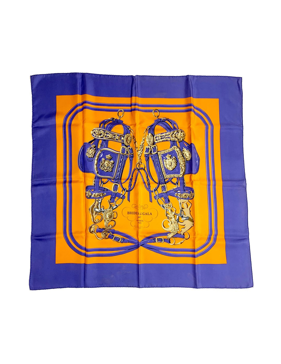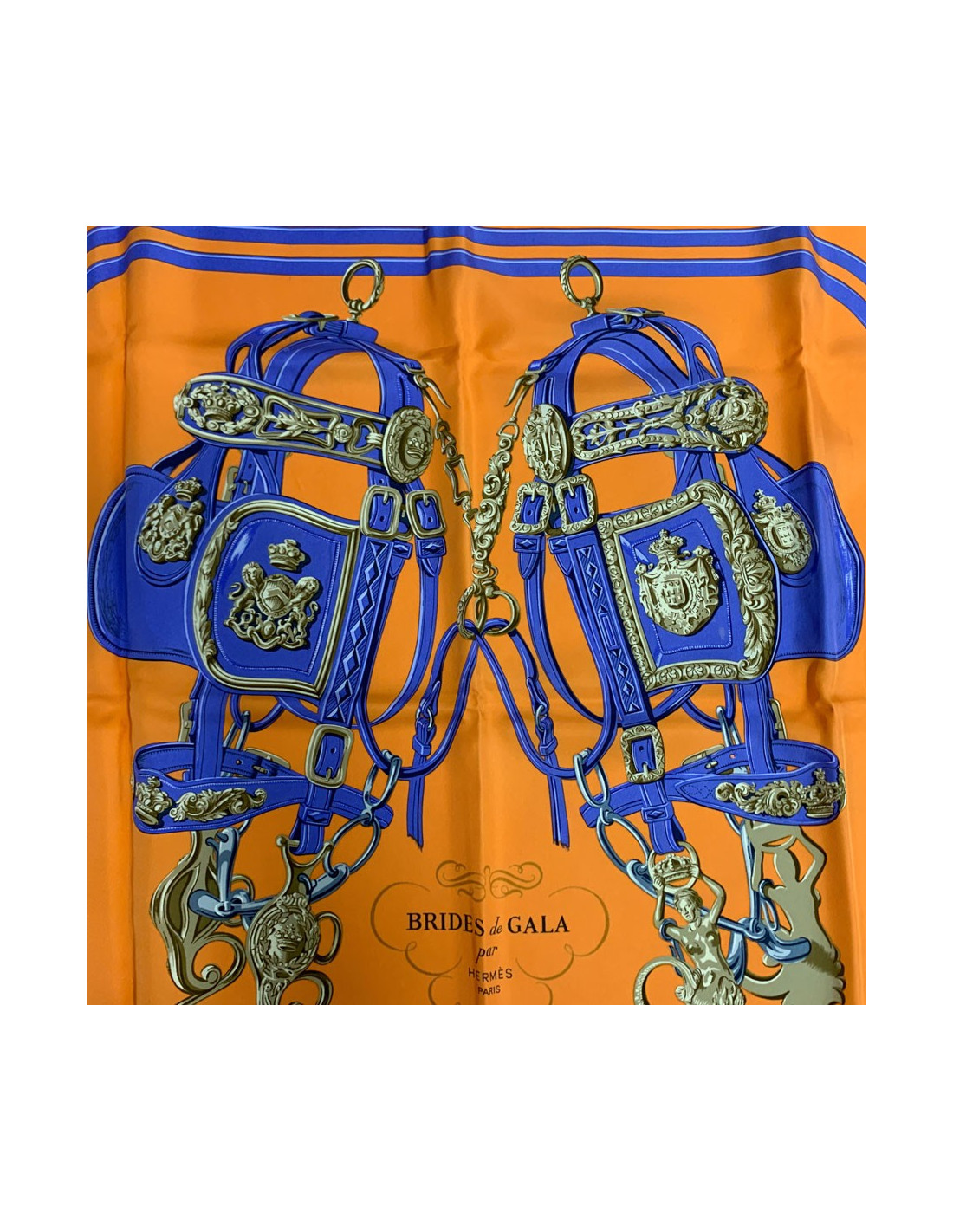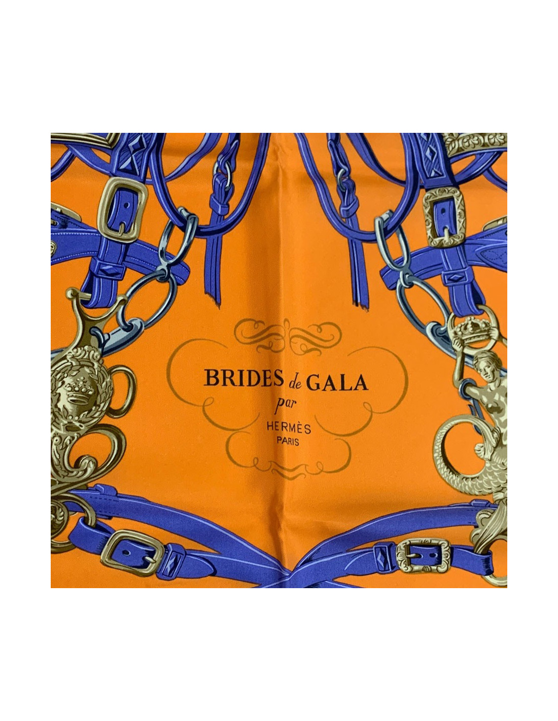 Carré de la Maison HERMES, modèle Brides de Gala, en soie mauve et orange. Il a été dessiné par Hugo Grygkar. La première édition date de 1957. Celui-ci est une réédition.