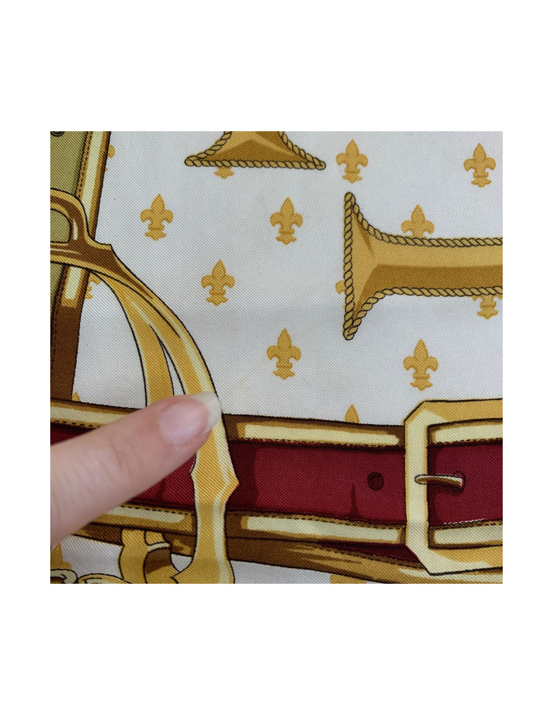 Beau carré vintage de la Maison Hermès dessiné par Christiane Vauzelles. Il est intitulé Selles à Housse. Il est en twill de soie rouge. Son fond est beige avec des motifs dans les couleurs or.