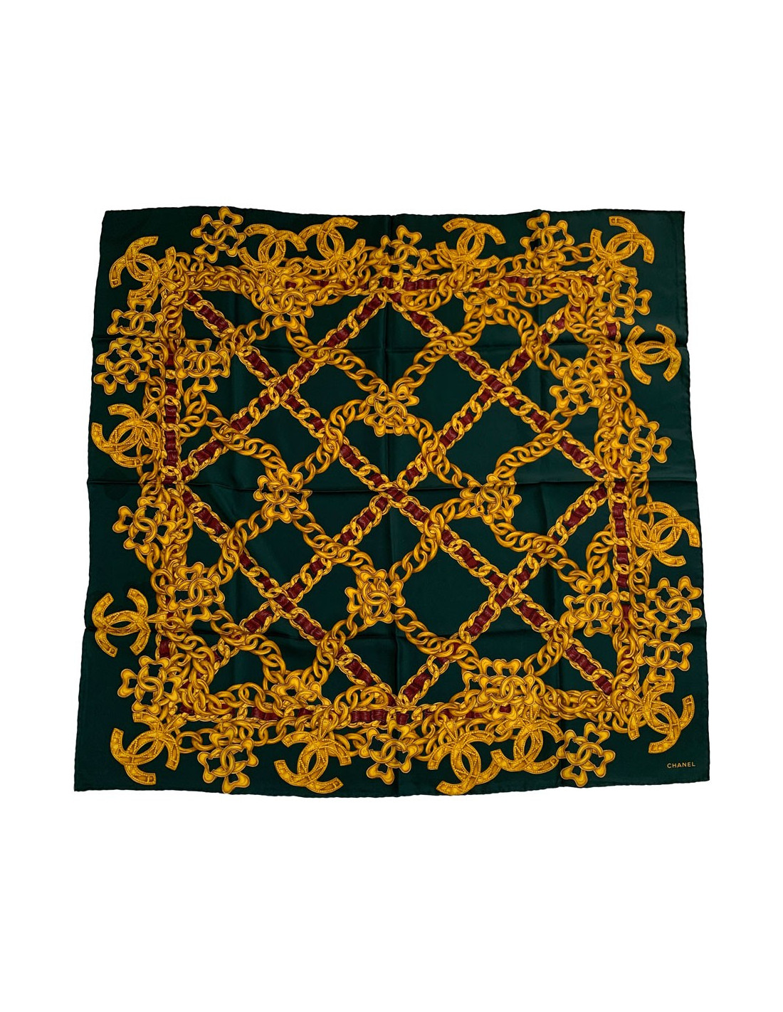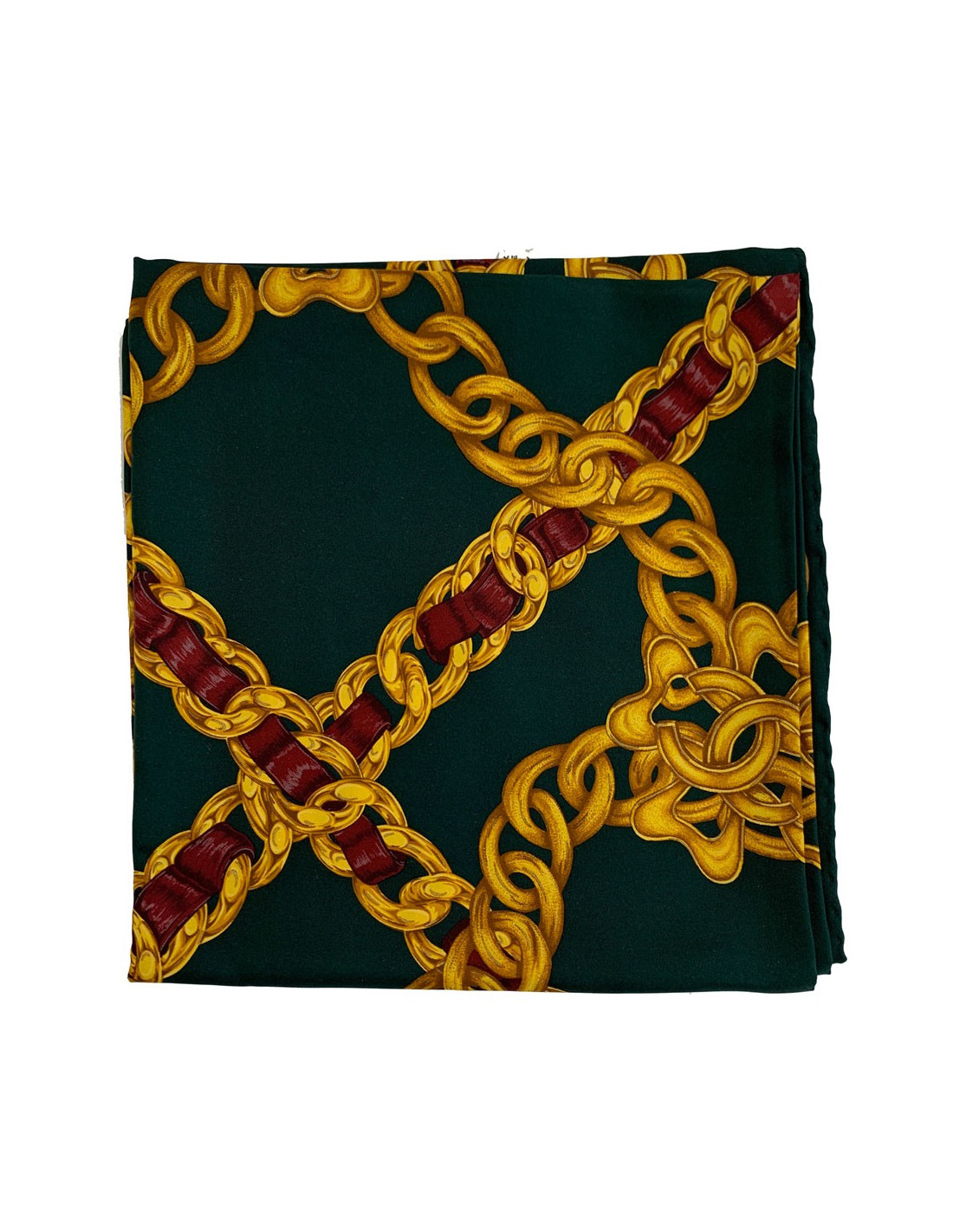 Carré CHANEL imprimé chaînes dorées en soie vert foncé