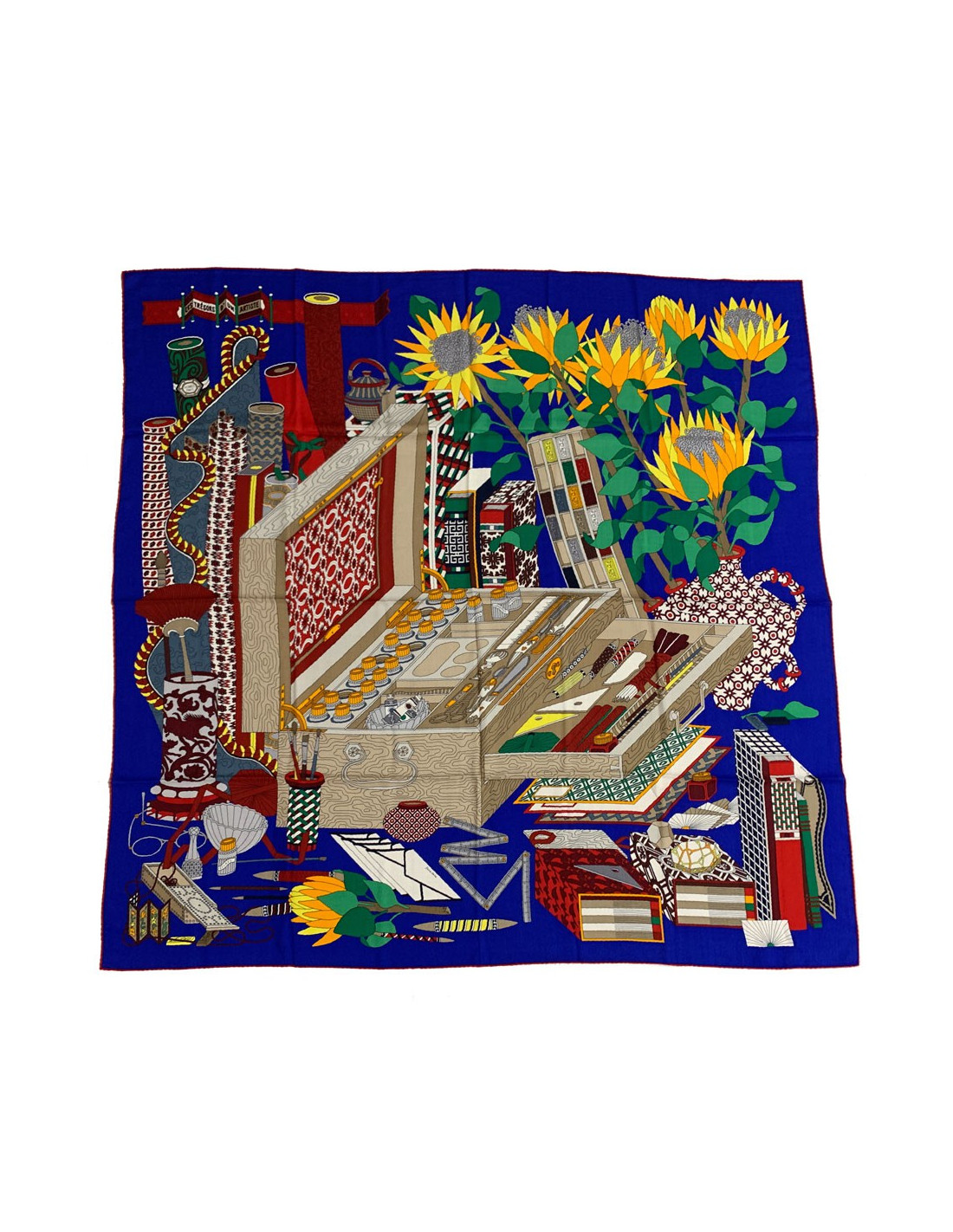 Superbe châle HERMES, intitulé Les Trésors d'un Artiste. Il est en cachemire et soie à dominante bleue. Son roulotté est rouge. Il représente tous les ustensiles nécessaires à un artiste (boite de peinture, cahier de croquis etc...).