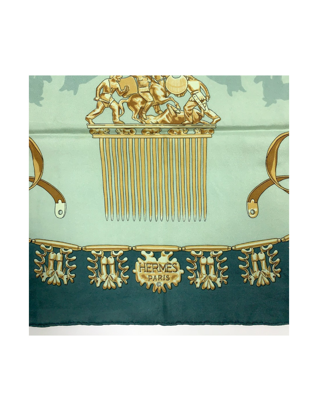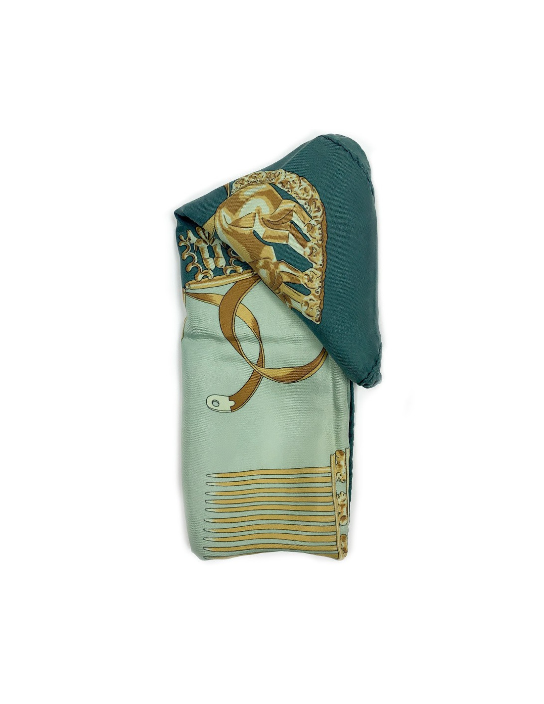 Le foulard provient de la Maison HERMES. Il a été dessiné par Rybal et s'intitule Les Cavaliers d'or en hommage au cavaliers titrés. Il se décline ici dans des couleurs vert et or. Il est en soie.