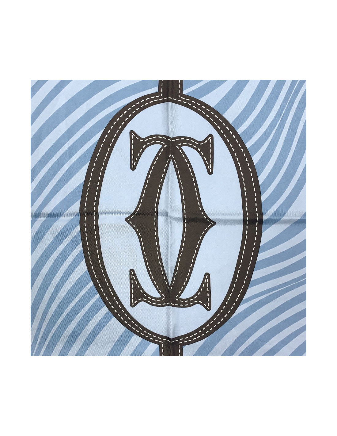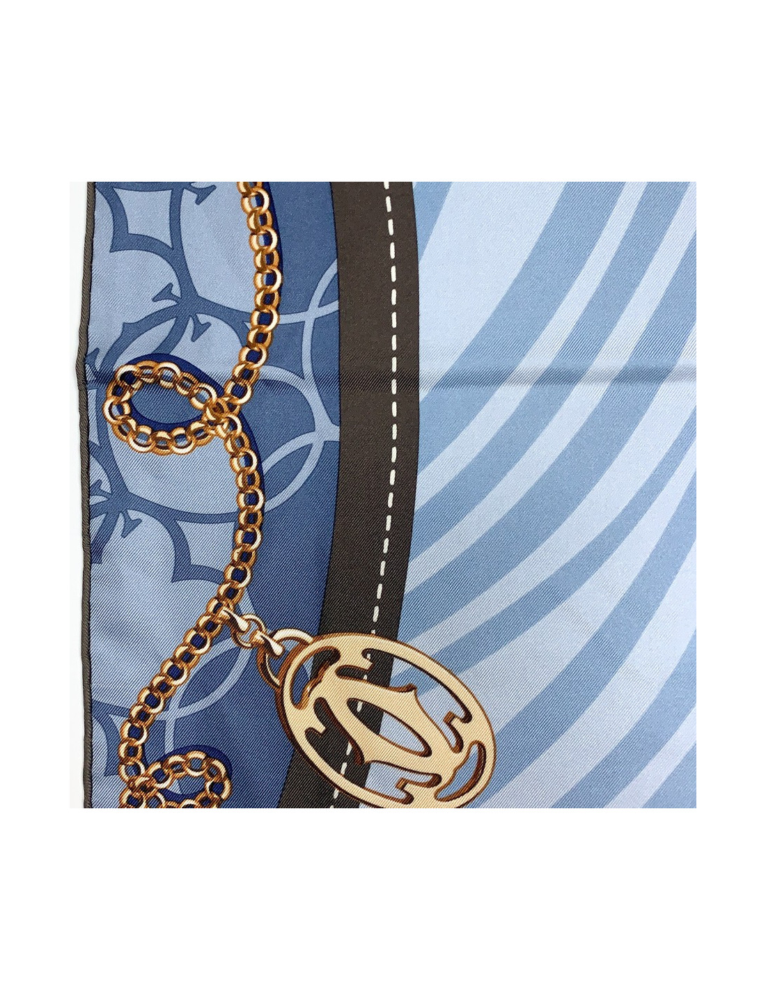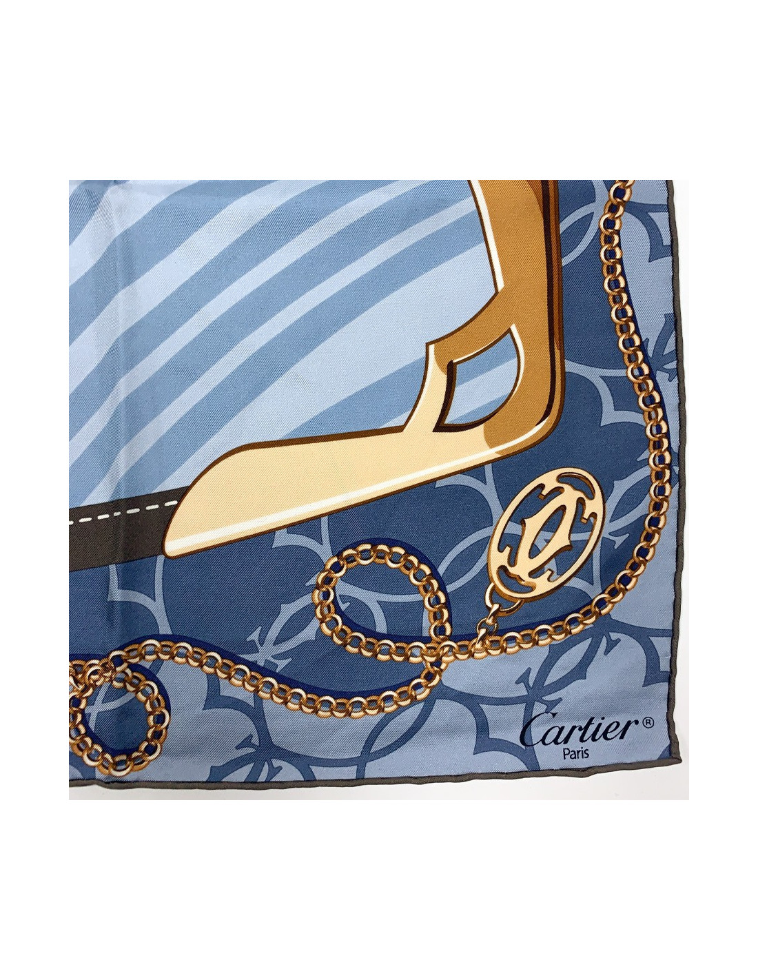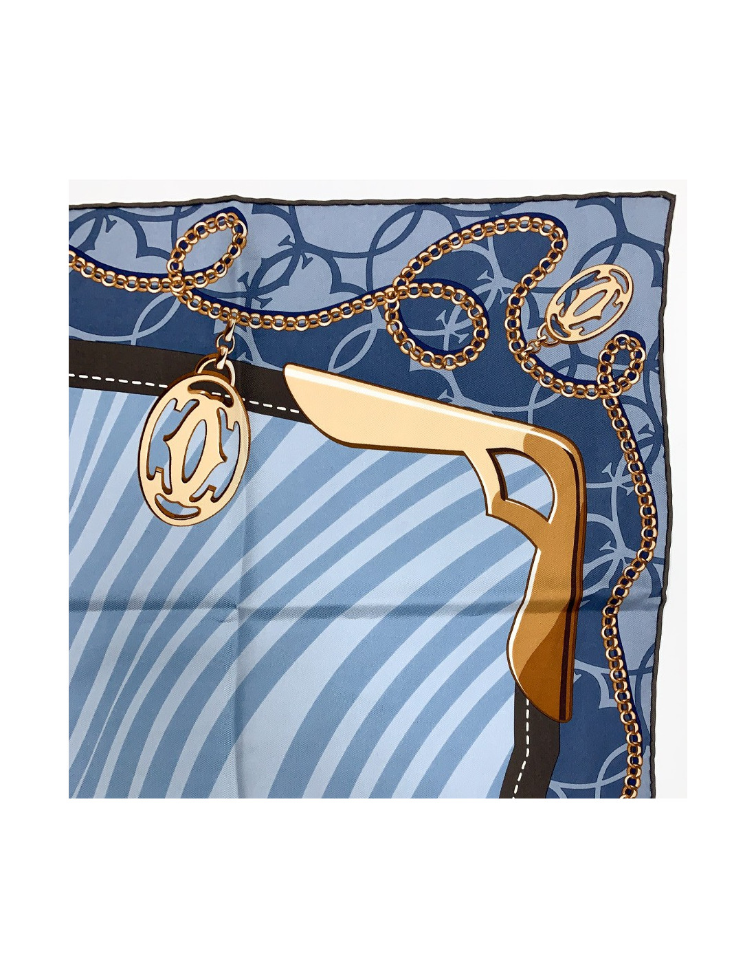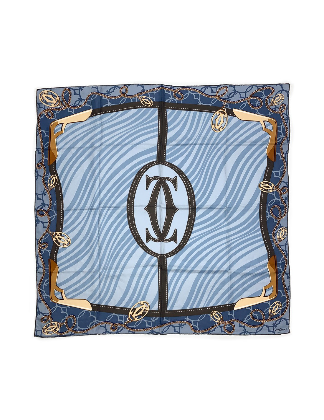 Le foulard est signé CARTIER. Dans des nuances de bleu et de marron, il fait hommage à la Maison, avec comme motif central le double C de la marque. Tout le cadre du foulard est entouré par un motif de chaîne comportant des pendentifs à l'emblème CARTIER.