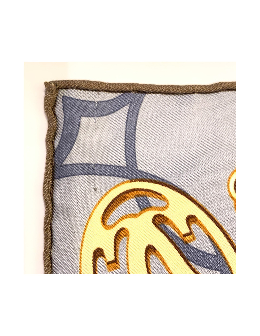 Le foulard est en très bon état, malgré la présence d'un petit fil tiré dans un des coins (cf photo), autrement, il n'y a pas de tache, et le roulotté est impeccable. C'est un carré dont les côtés mesurent 90 centimètres. L'étiquette de la marque montre qu'il est fait de 100% de soie et qu'il est Made In Italy.