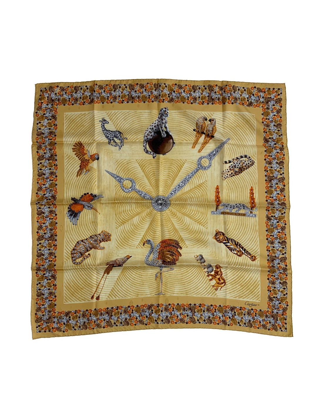 Magnifique et superbe foulard CARTIER en soie brochée de couleur or. Le motif représente une horloge. Chaque heure est définie par un bijou tout en diamant représentant un animal emblématique de la Maison.