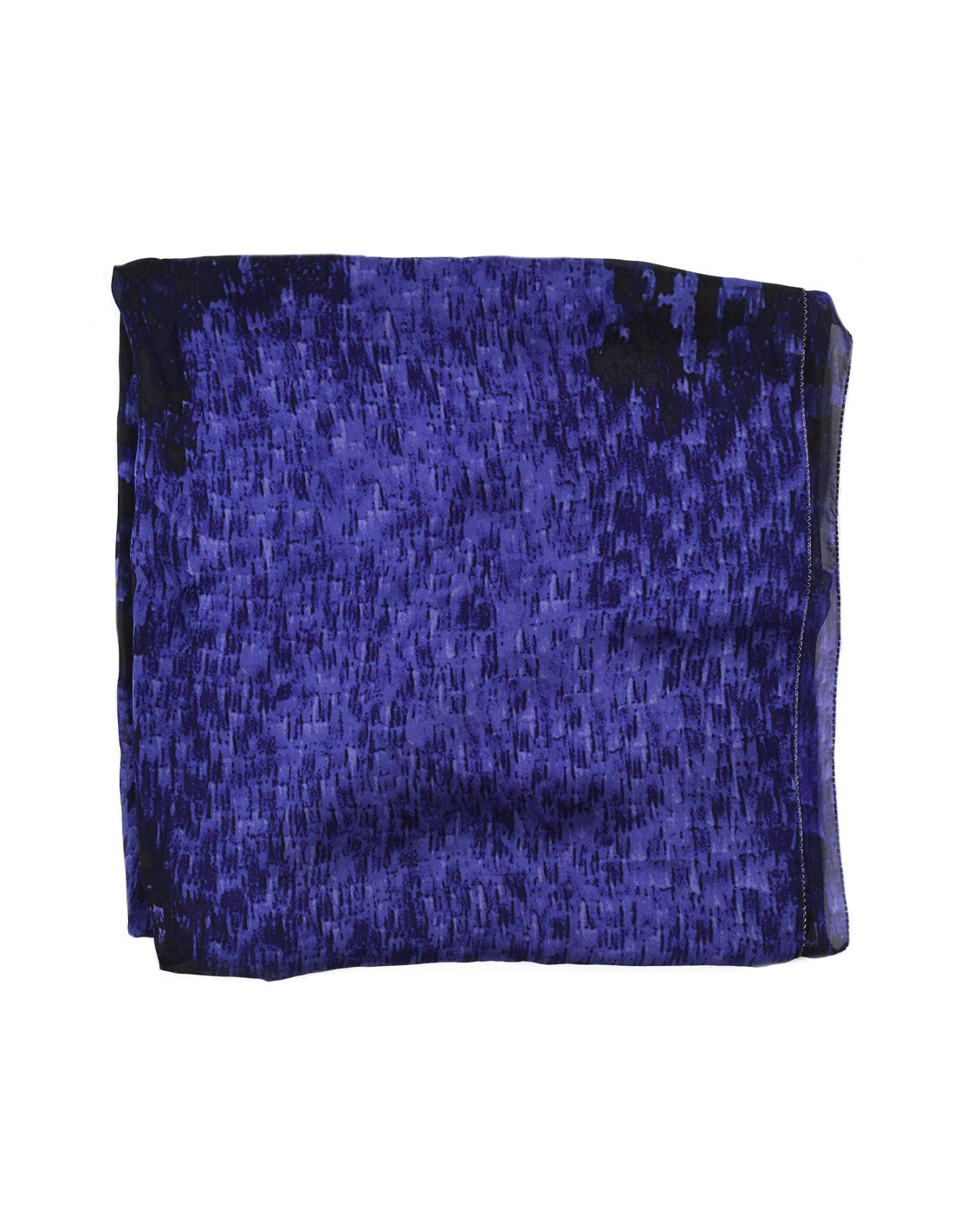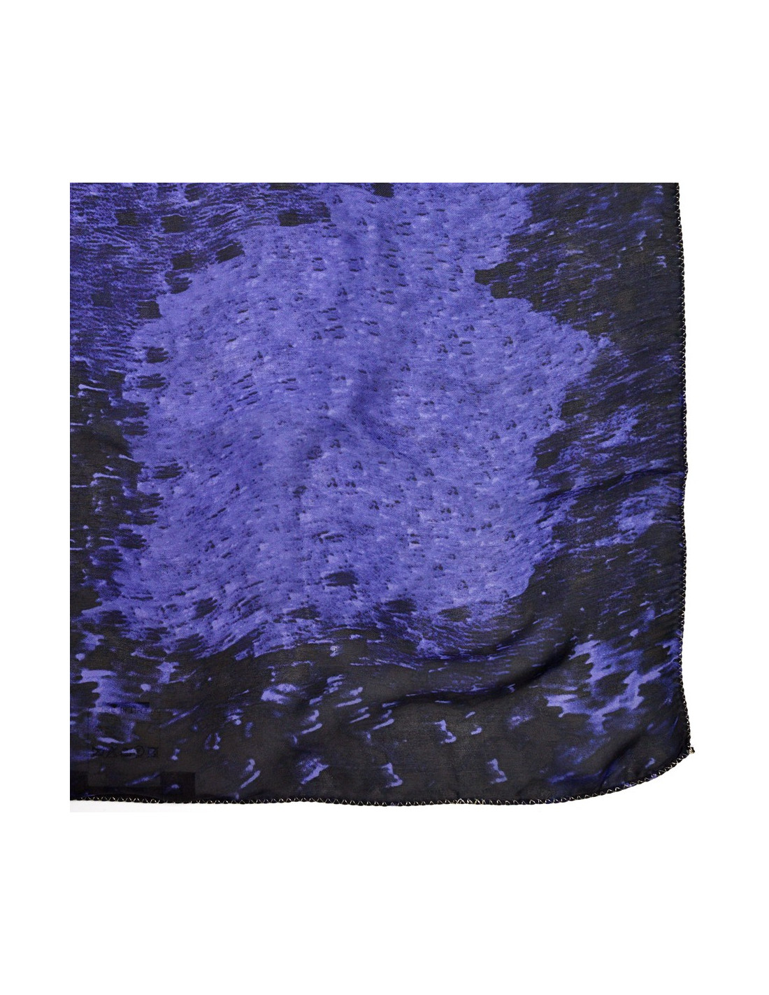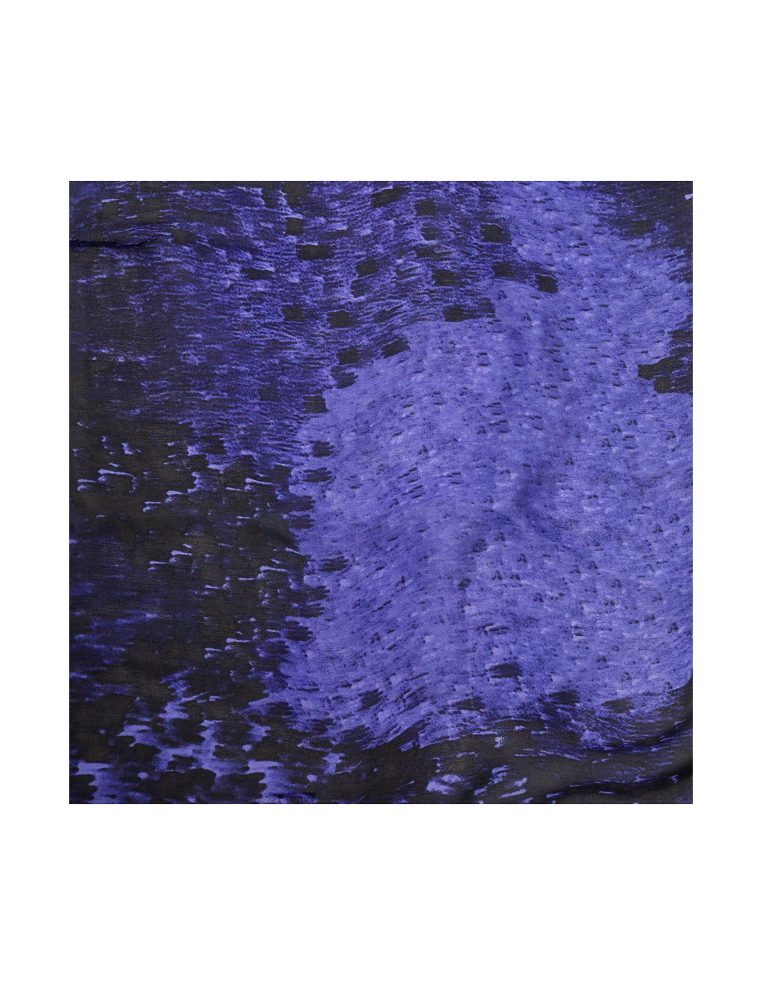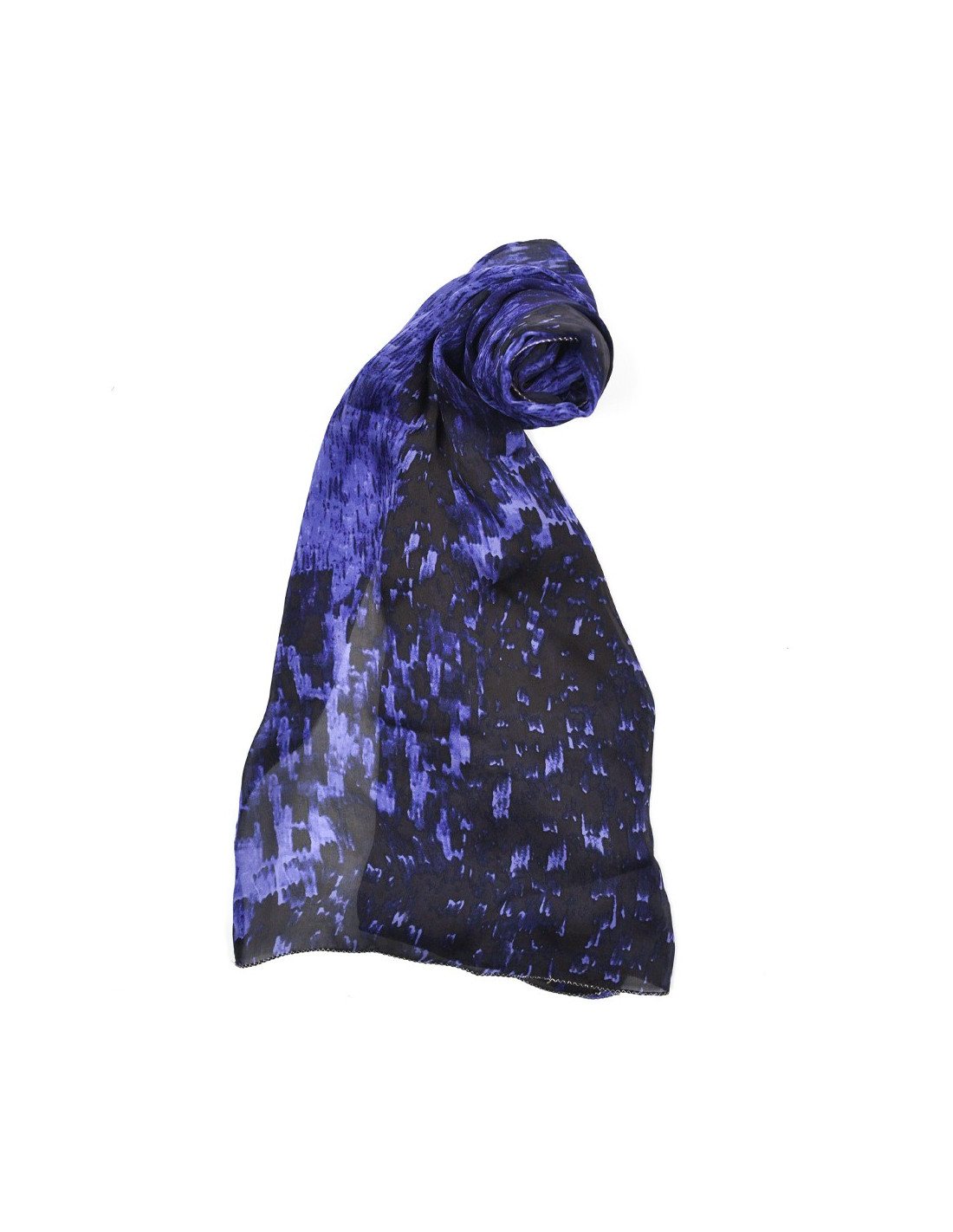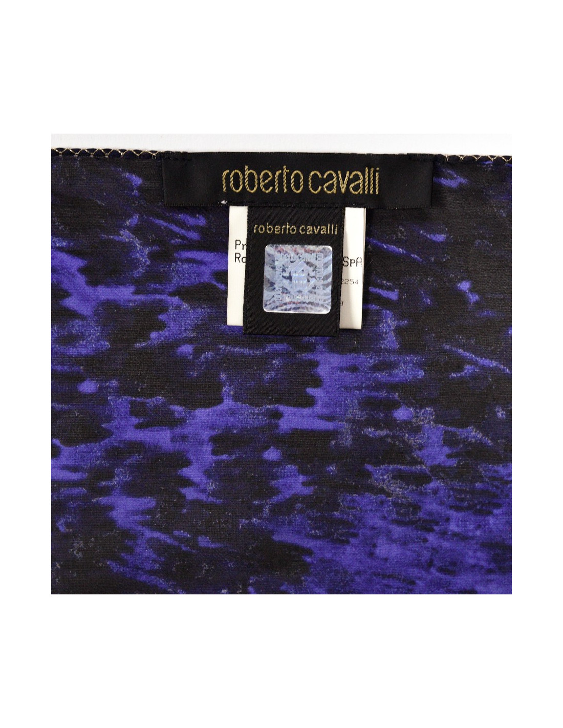 Le foulard est de la Maison Roberto Cavalli. Il représente un long rectangle de soie violette encadré de fil d'or.
