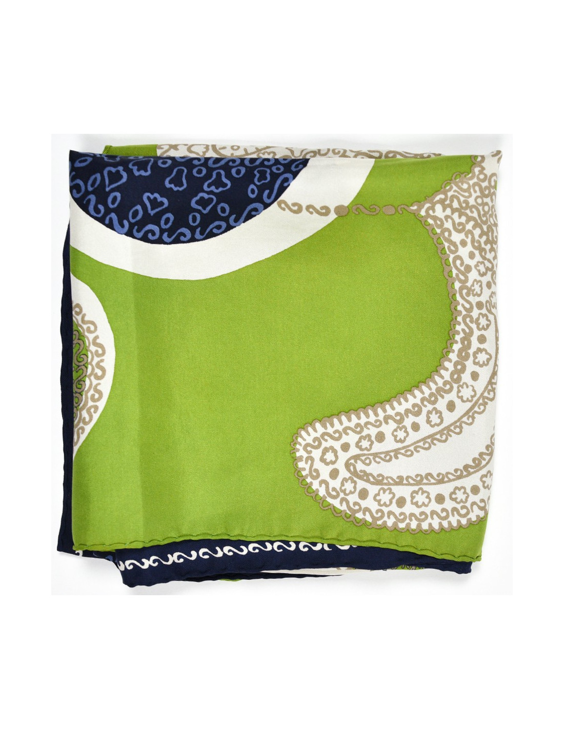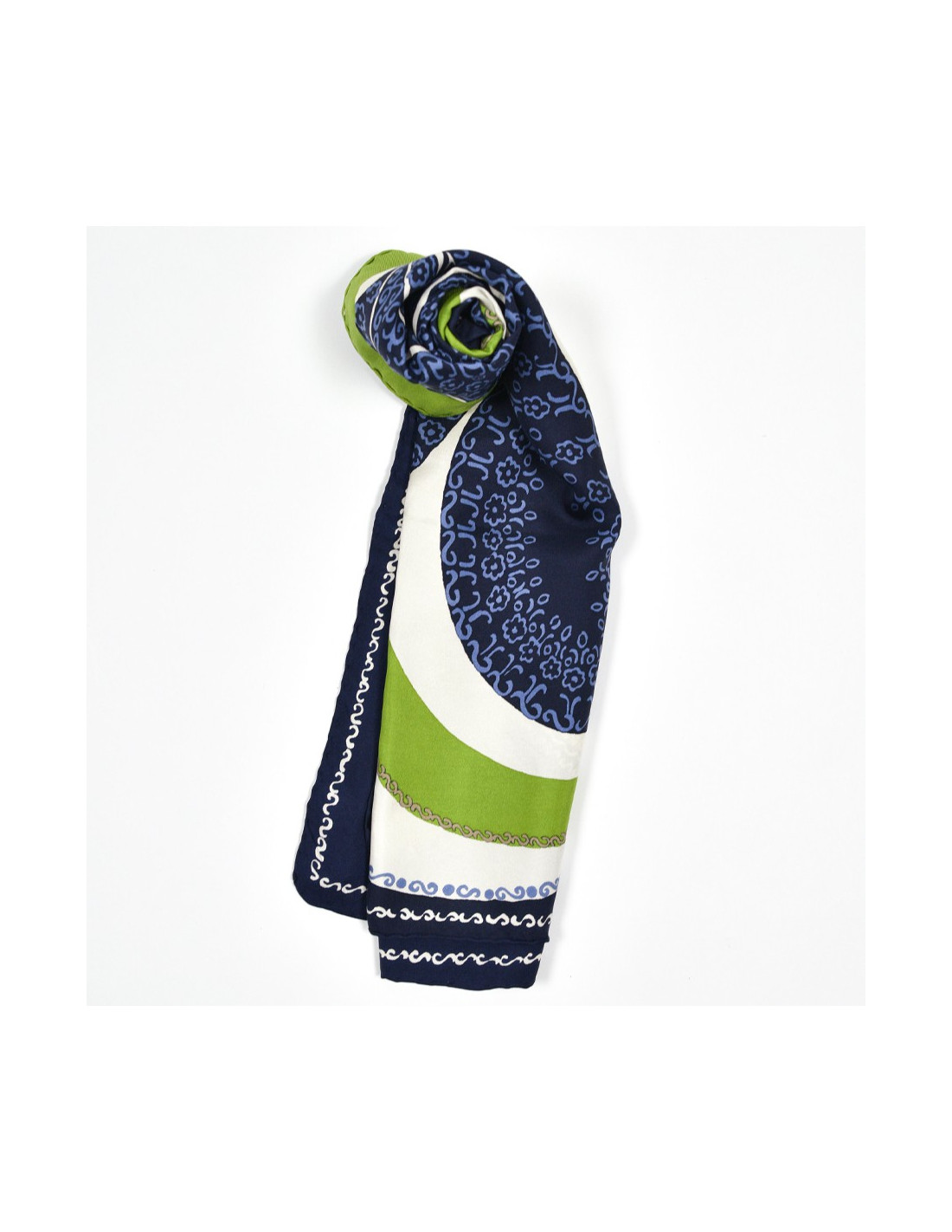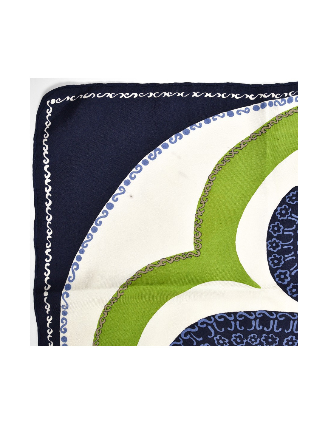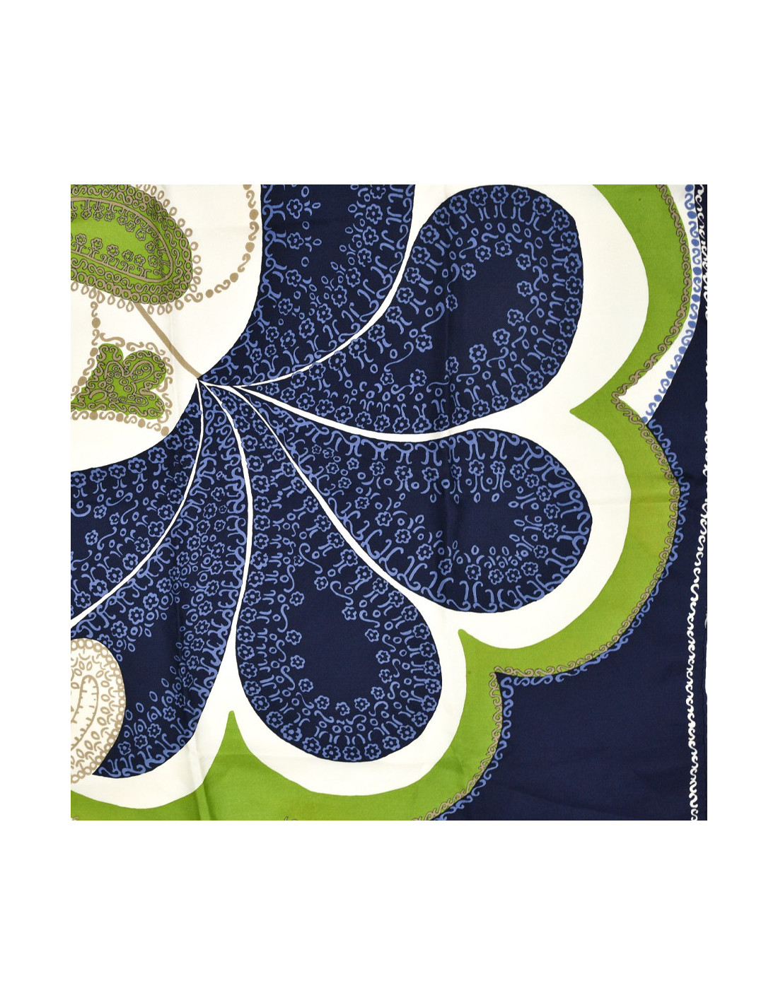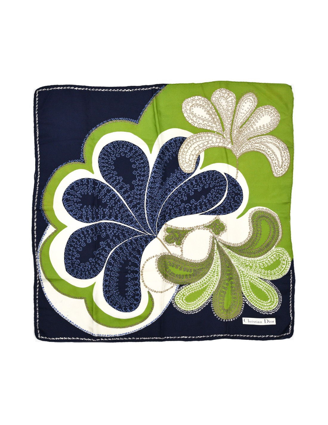 Le foulard est de la Maison CHRISTIAN DIOR. Dans des tons bleu nuit, vert et blanc, se dessine une bouquet de fleur dont les pétales se garnissent à leur tour d'une multitude de petites fleurs.