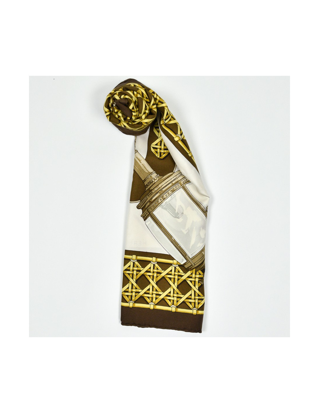 Le foulard est de la Maison HERMÈS. Dessiné par Caty Latham en 1971, le carré représente des feux de route à l'ancienne type lanternes autour de l'élément central qui est une calèche.