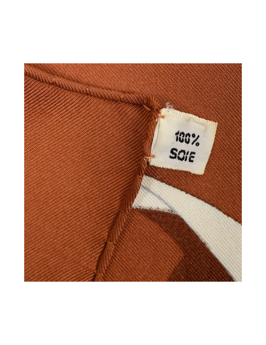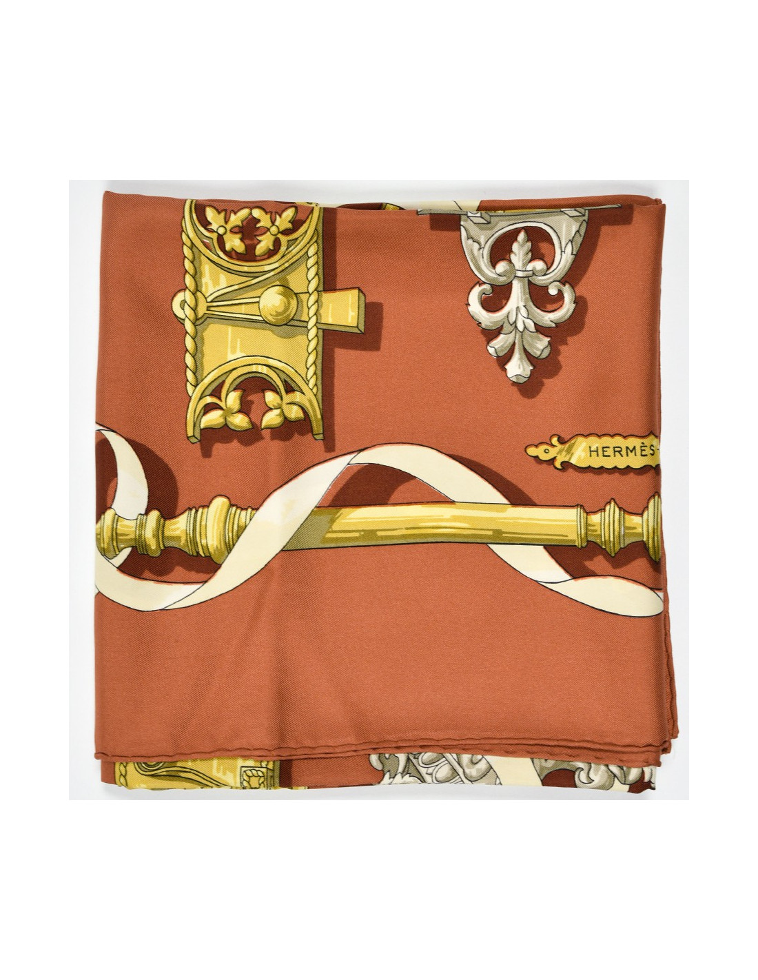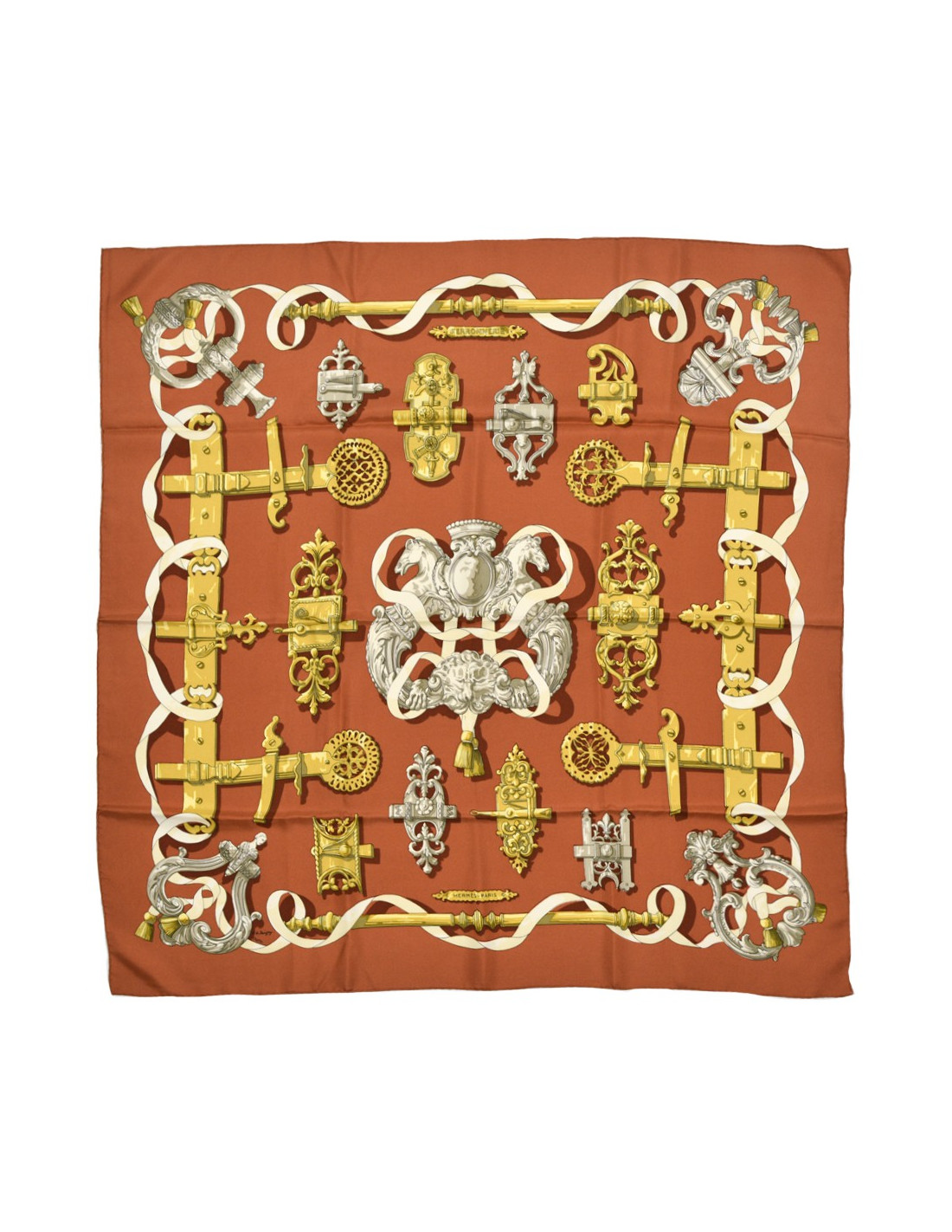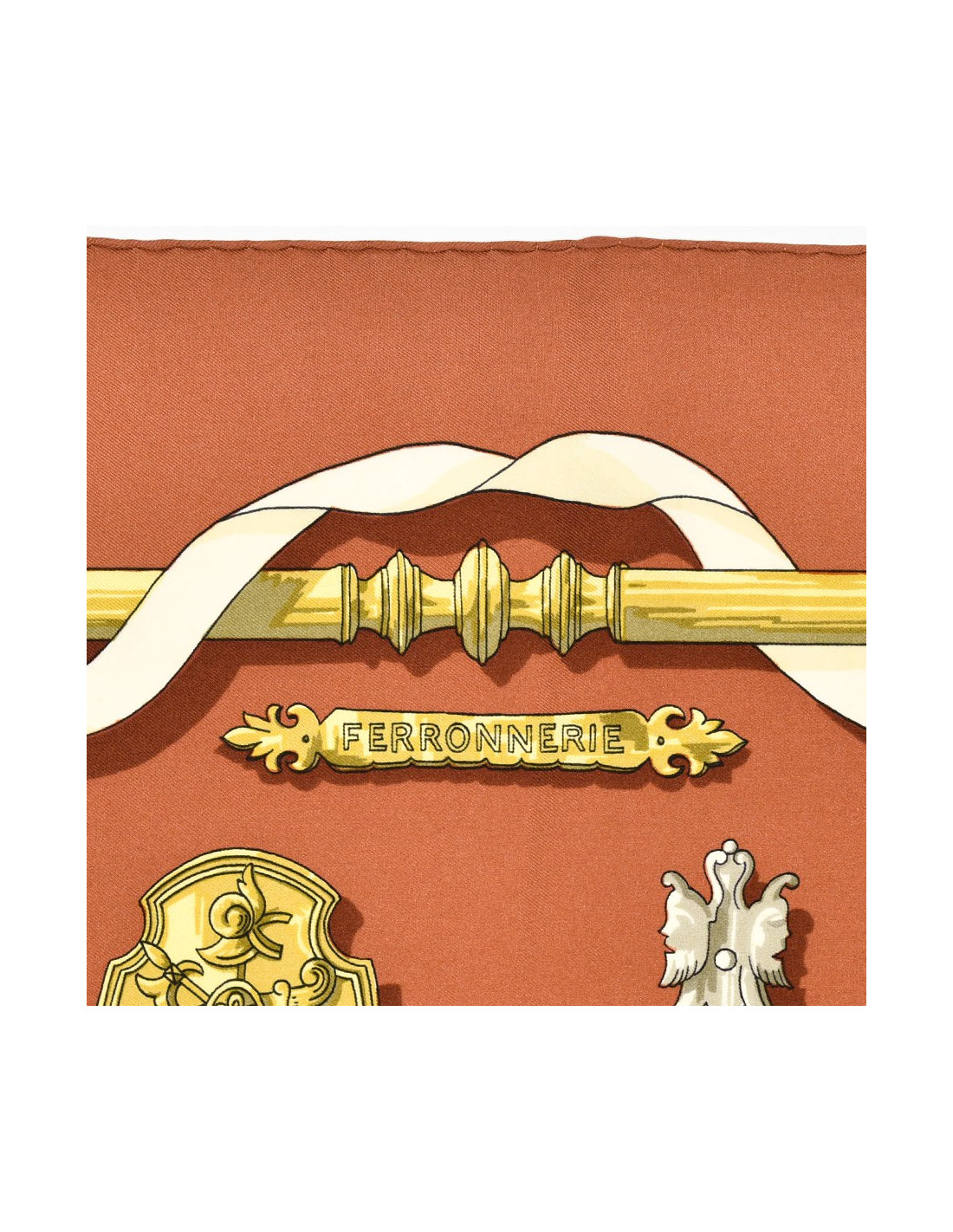 Le foulards est de la Maison HERMES. Dessiné en 1970 par l'artiste Caty Latham, il présente, comme son nom l'indique, des éléments de ferronnerie couleur or sur fond marron.