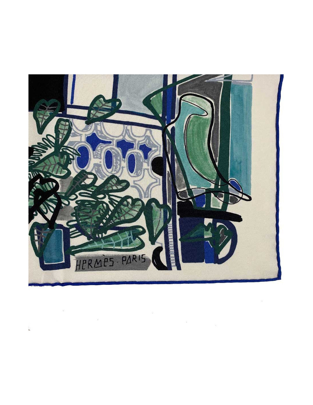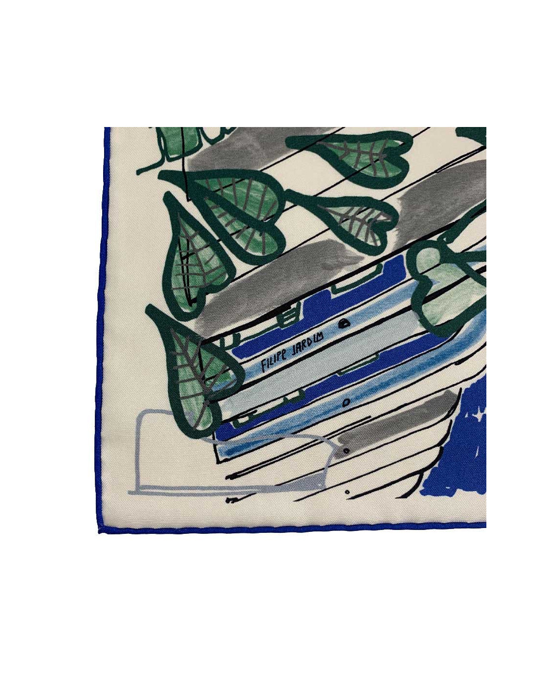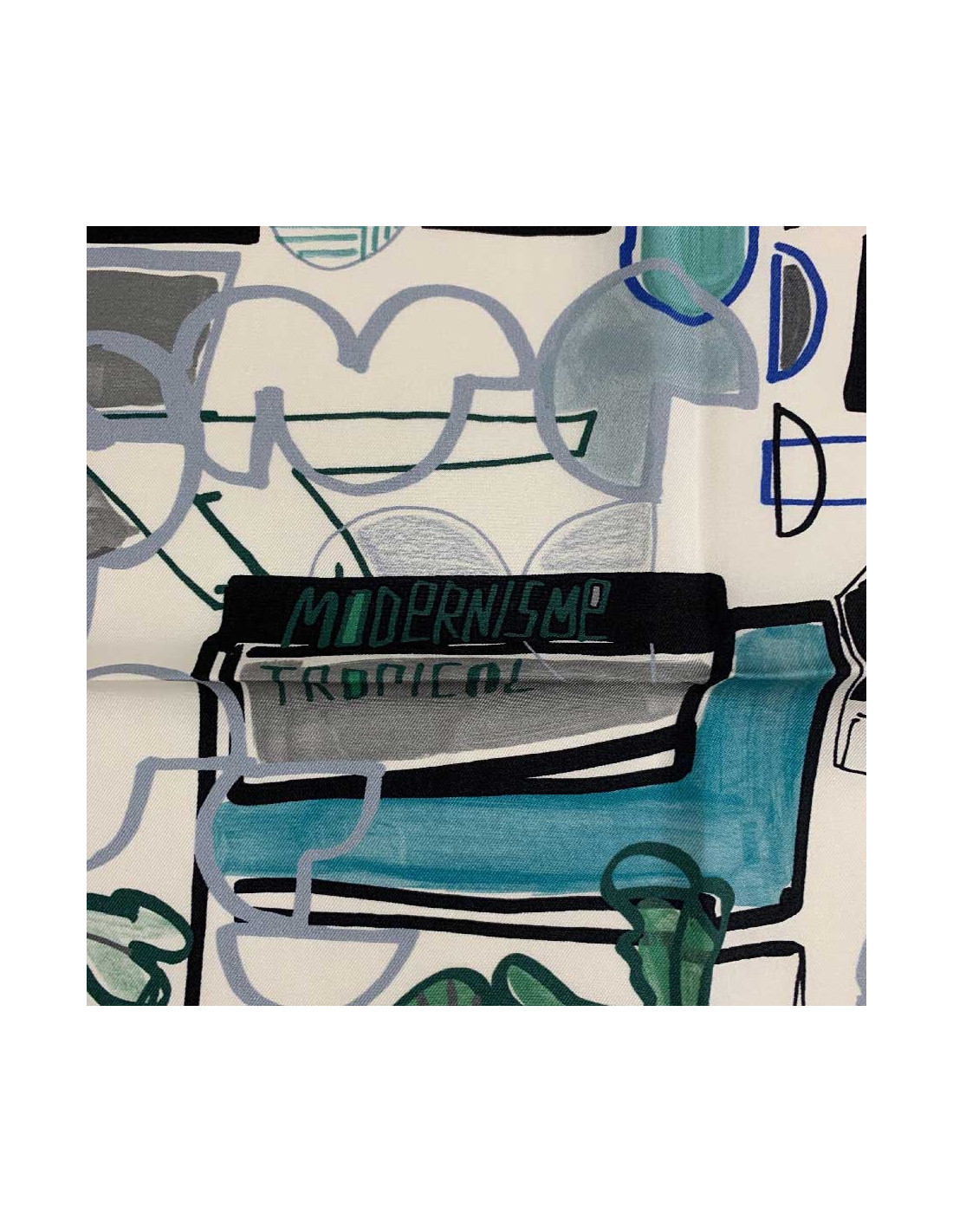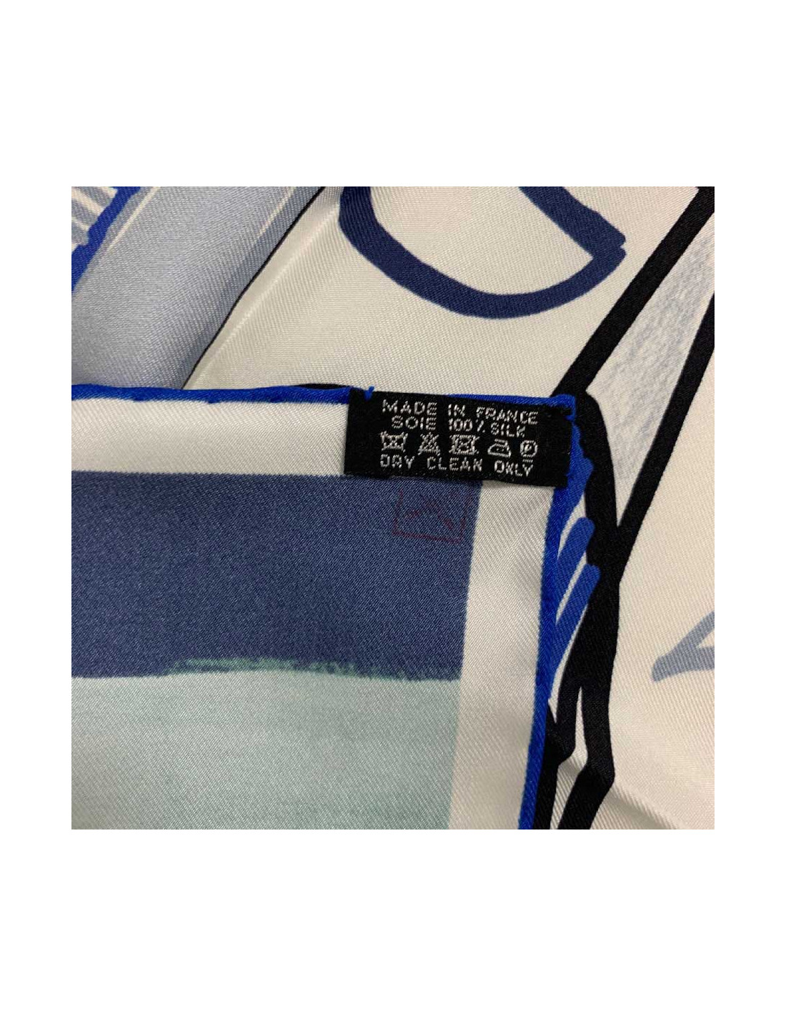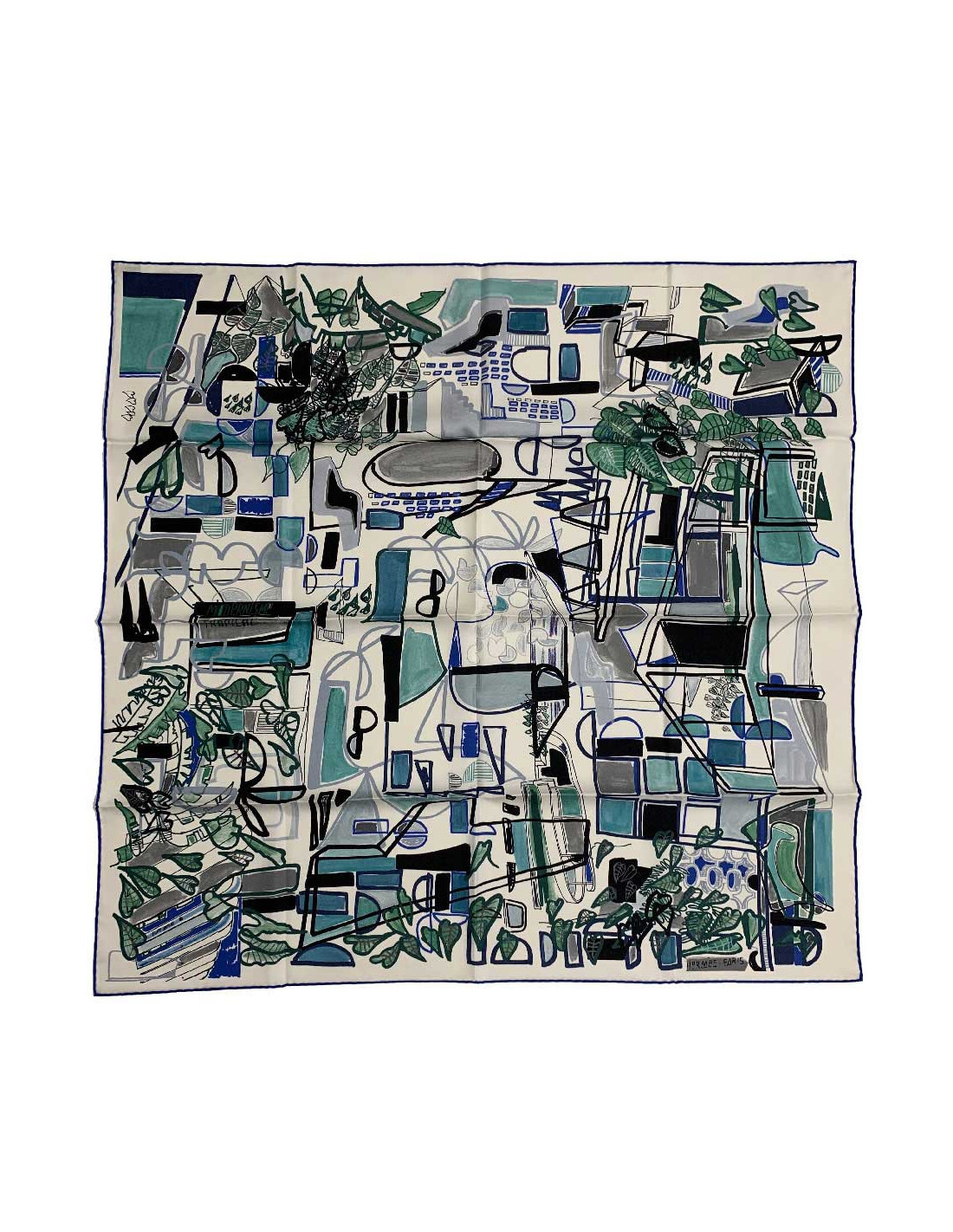Superbe carré de la Maison HERMES, en soie bleue, blanche, grise, noire. Ce foulard a été dessiné par : Filipe Jardim. Le thème est basé sur le Brésil réel et imaginaire de ce créateur. Il représente l'architecture moderne du Brésil.