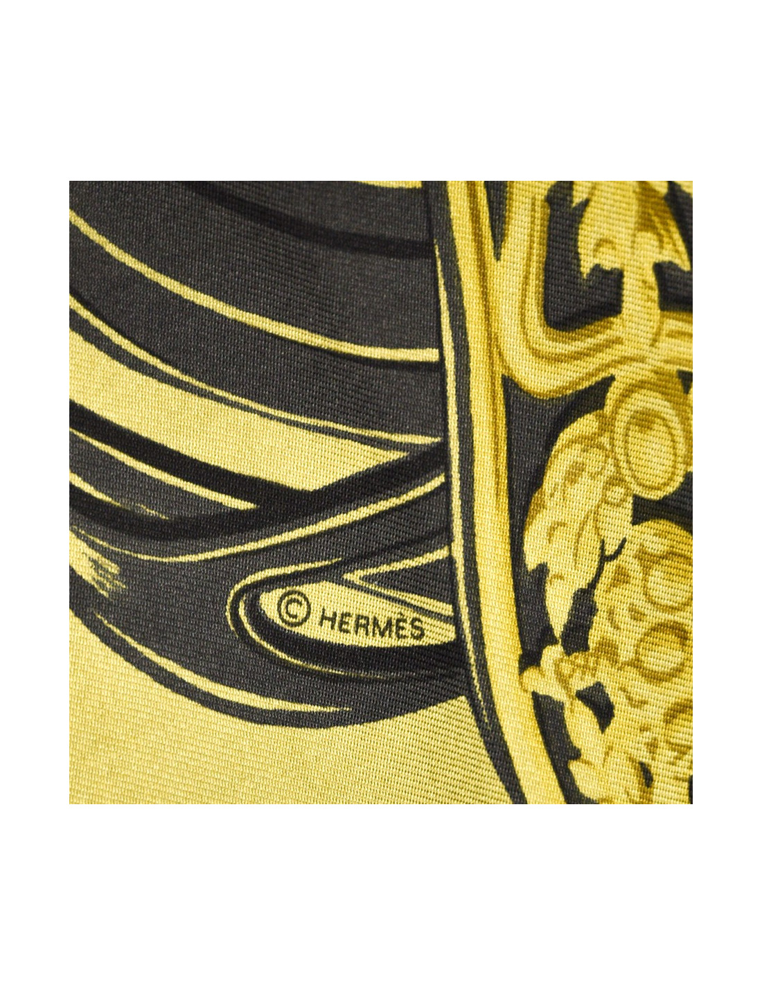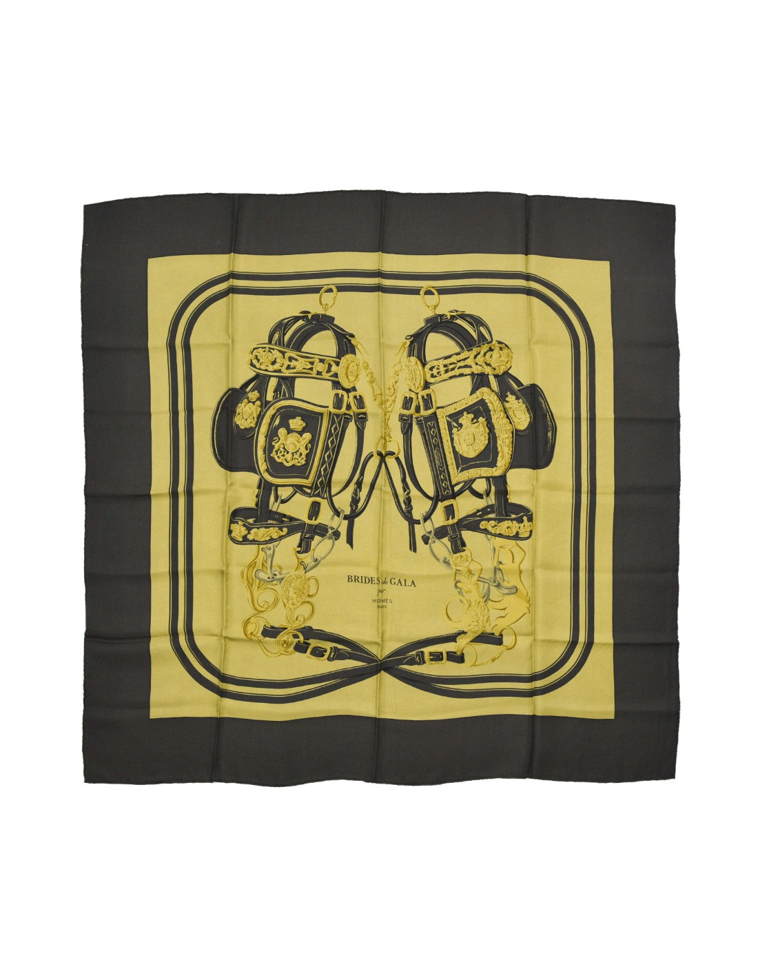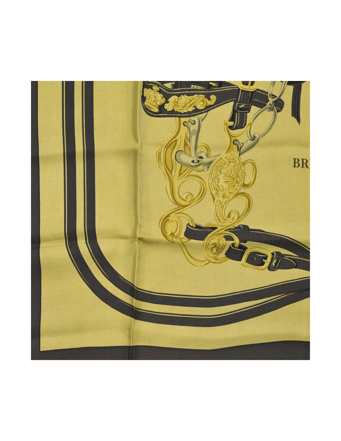 Le foulard est de la Maison HERMES. Dessiné par Hugo Grygkar en 1957, ce carré intitulé "Brides de Gala" a connu un franc succès et a été décliné sous toutes ses couleurs. Nous vous le proposons ici bordé de marron avec comme couleur centrale un jaune tirant sur le kaki. Magnifique assemblage.