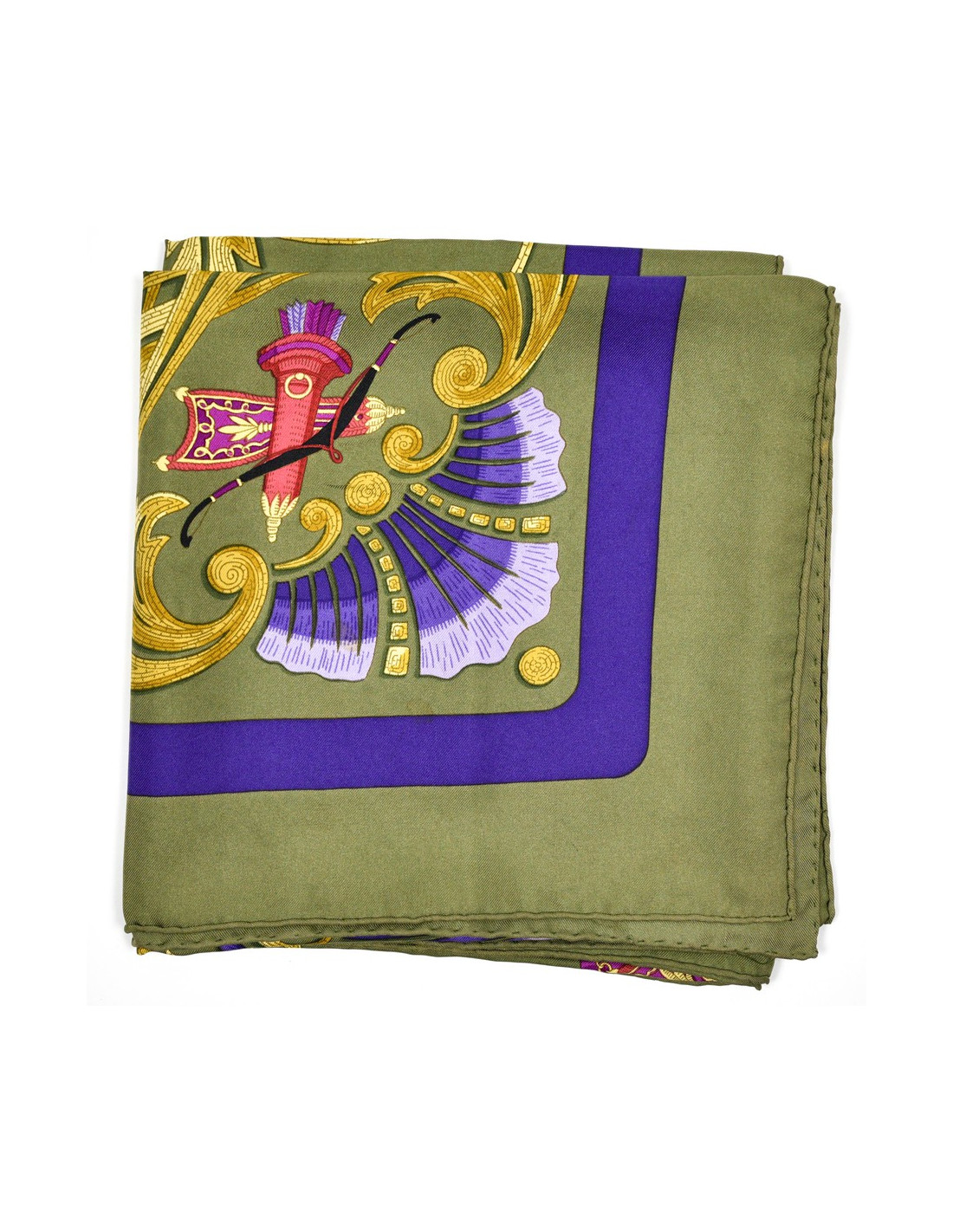 Le foulard est signé par la Maison HERMES. Dessiné par Christiane Vauzelles en 1969, il s'intitule "Cheval Turc", et contient comme élément central un cheval mené par un homme à l'habit turc.